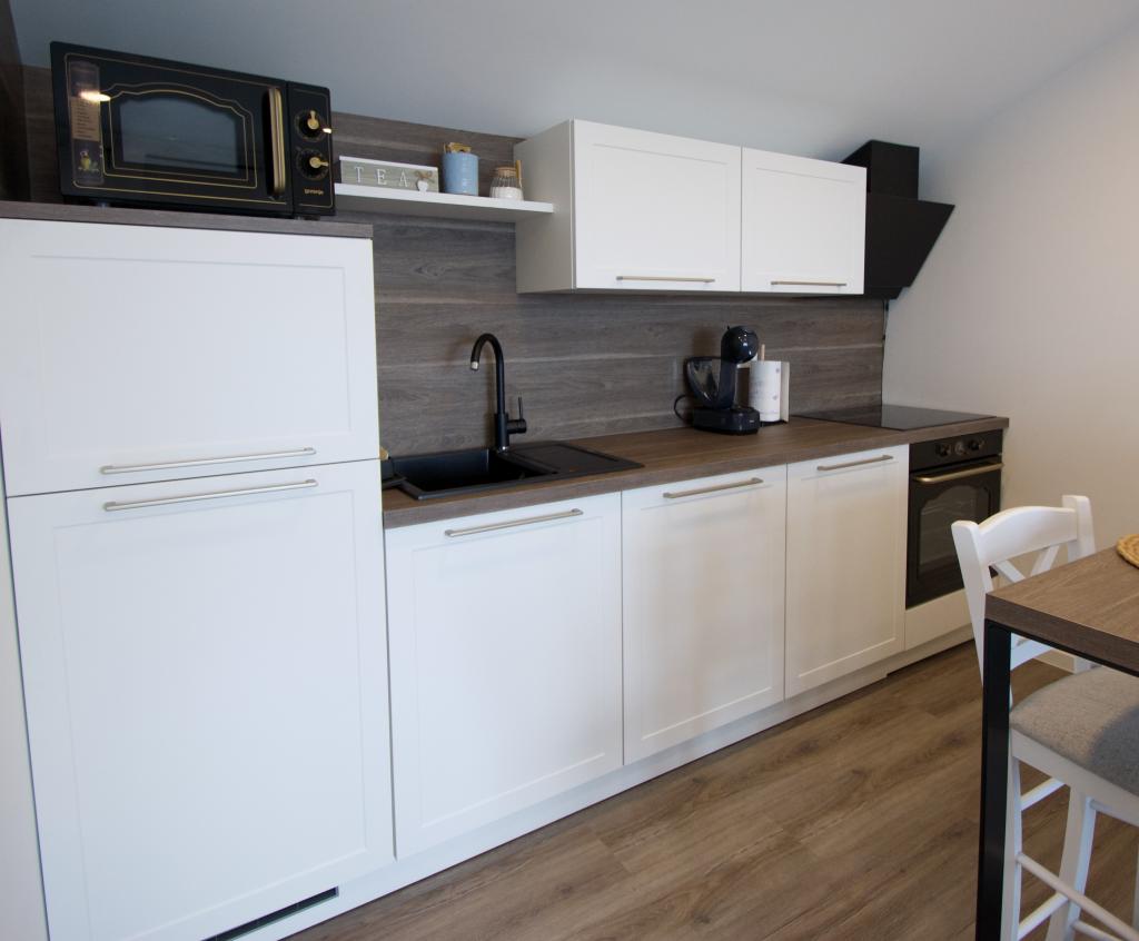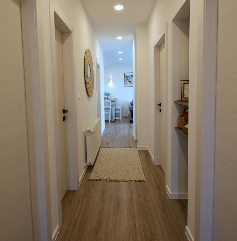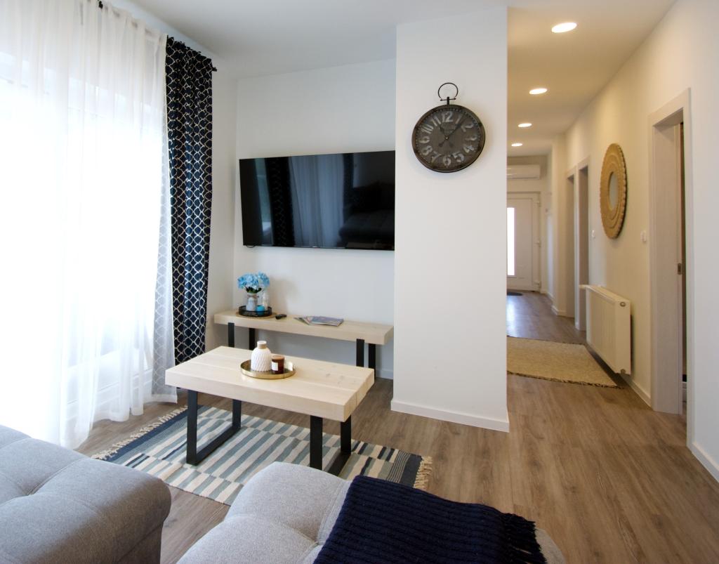 Welcome to our Blue Horizon apartment. The interior is carefully designed with modern details complemented by warm, natural elements, creating a feeling of harmonious luxury. The spacious living room invites you to relax on the comfortable couch, while at the same time enjoying the view of the endless blue of the Adriatic Sea. Our fully equipped kitchen gives you the opportunity to prepare your own meals with the latest appliances and accessories. The bedrooms are oases of peace and comfort, with comfortable beds and fresh linens to ensure a peaceful night's sleep after a long day of exploring the nearby beaches and attractions. Our apartment also has a spacious balcony, where you can enjoy your morning coffee or a relaxed evening drink with the sunset. The first beach is 300 m away, the restaurant 100 m, and the shop 400 m. Enjoy every moment spent in our apartment by the sea, where comfort, luxury and the beauty of nature come together to provide you with an unforgettable vacation.