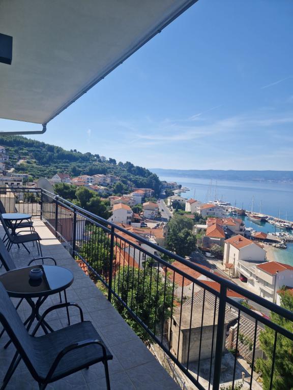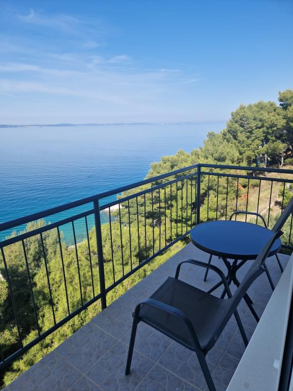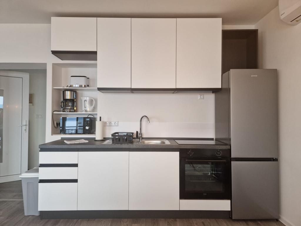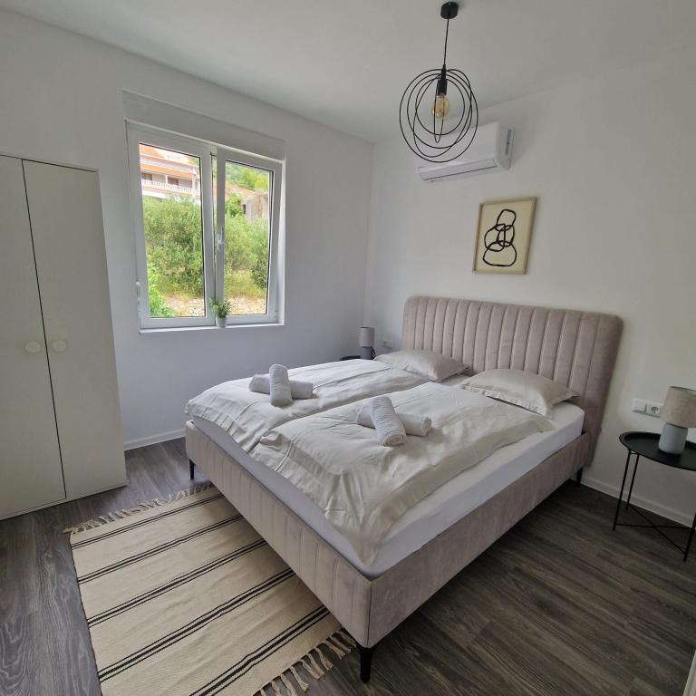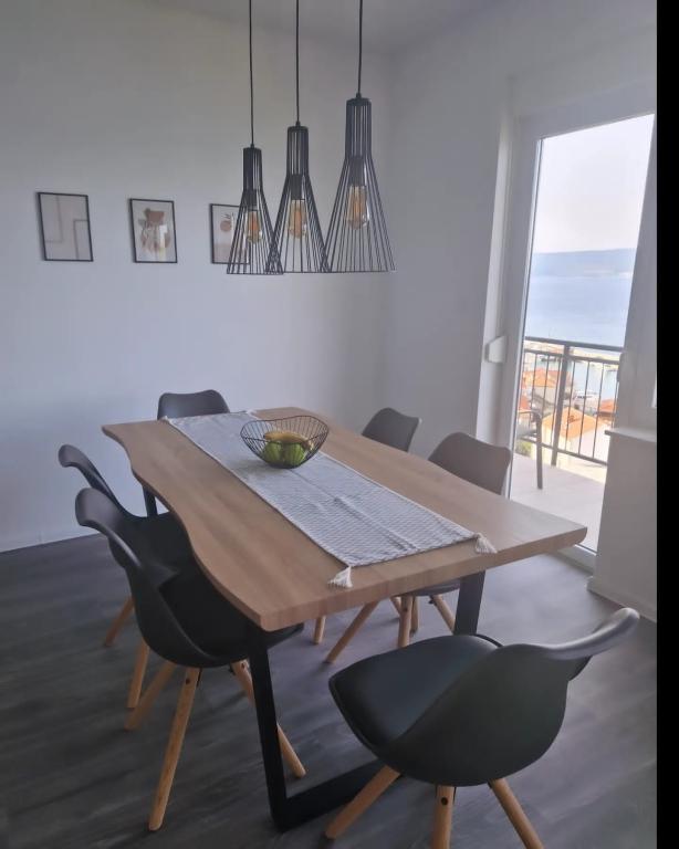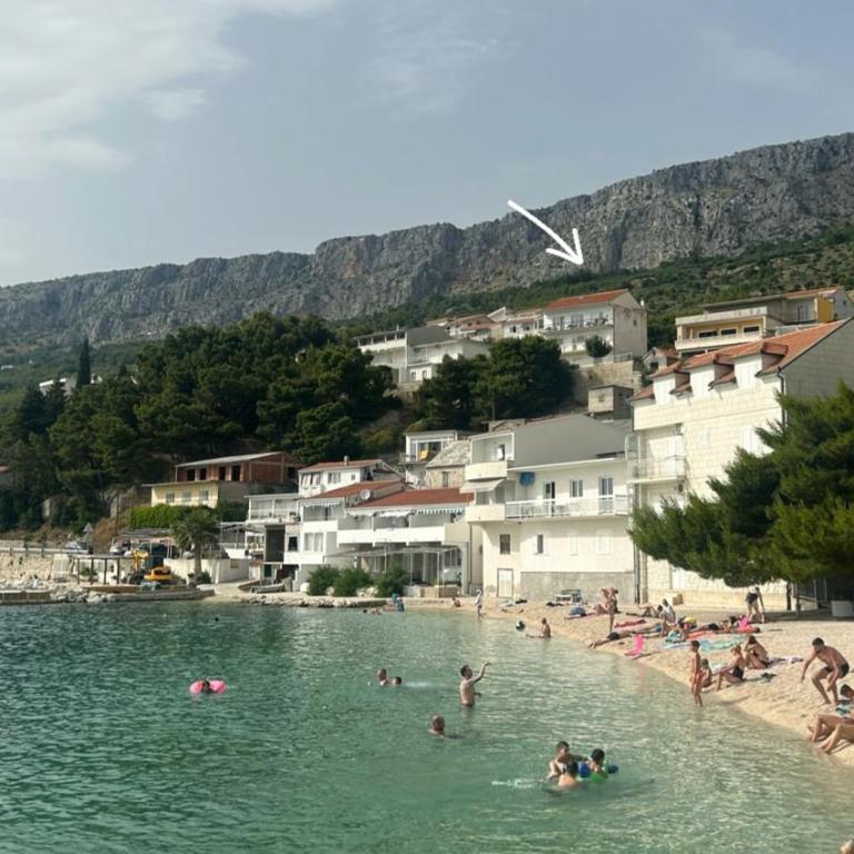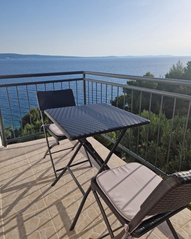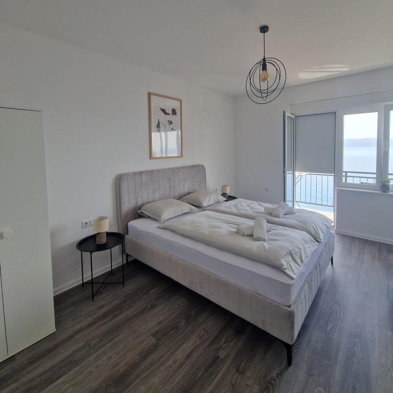 Apartment Buba (85m²) has 3 bedrooms with double beds, wardrobe and air conditioning, bathroom with washing machine, living room with dining room, kitchen with fridge, oven, dishwasher, coffee machine, microwave, kettle and balcony with with a direct view of the sea. There are 2 free parking spaces in front of the house.