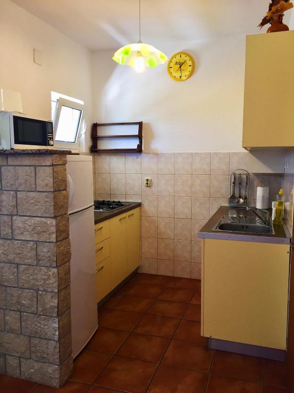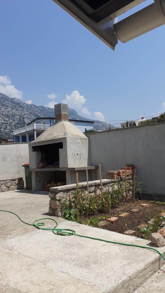 Weekend village next to a small fishing village, house with 2 apartments for rent. Apartment 1 (2+1) on the first floor consists of a bedroom, a living room with a kitchen and a bathroom with a toilet and a balcony with a view of the sea. On the ground floor there is Apartment 2 (4+1), which consists of 2 bedrooms with double beds, a large living room with a kitchen, a hallway and a bathroom with a toilet and a bidet, and a terrace with a view of the sea. The apartments are modernly equipped, a loft with two large garden tables and benches, a large and a small garden grill are available for use, parking in a large fenced yard. The sea is 5 minutes away with a choice of several concrete and sandy beaches. Ideal, peace, without traffic and noise, fresh and clean air and clean sea.