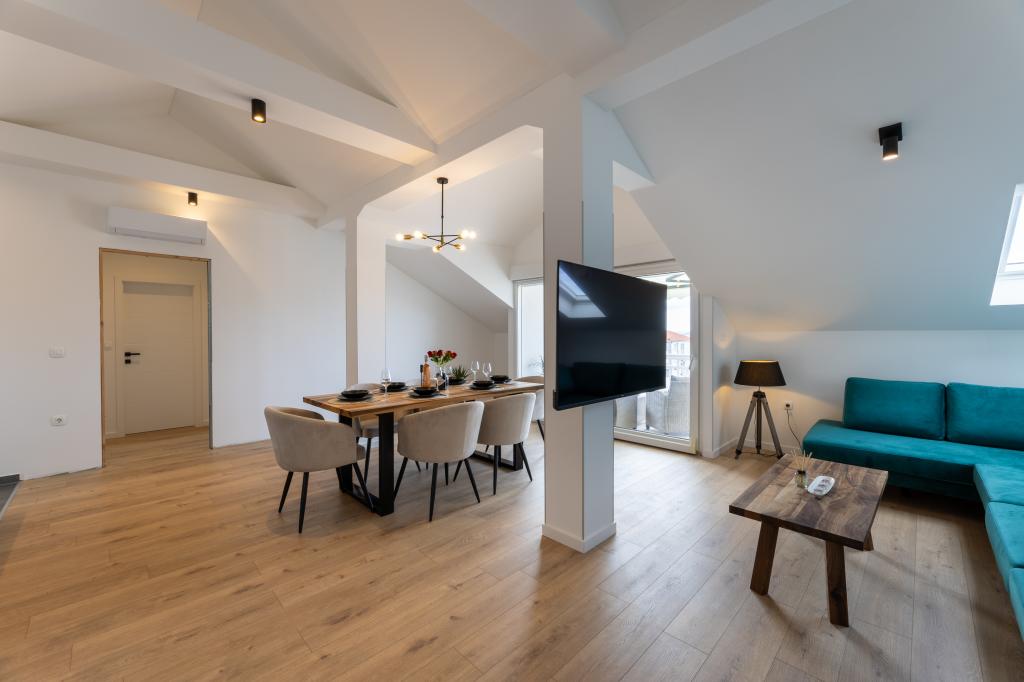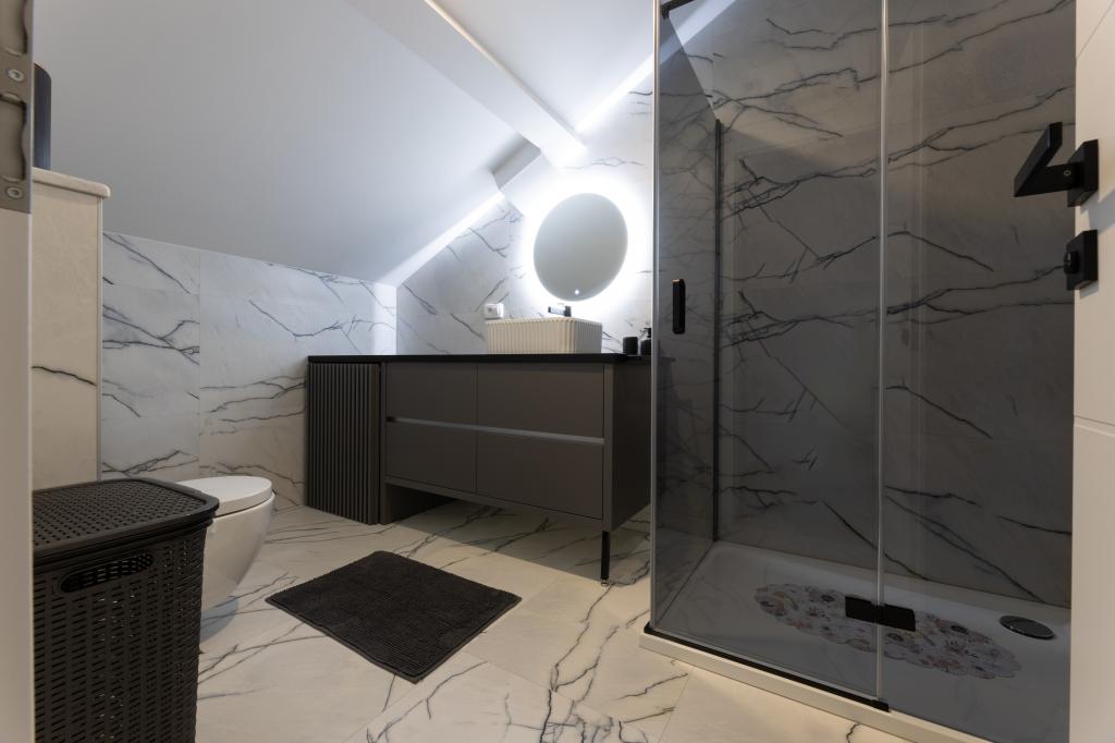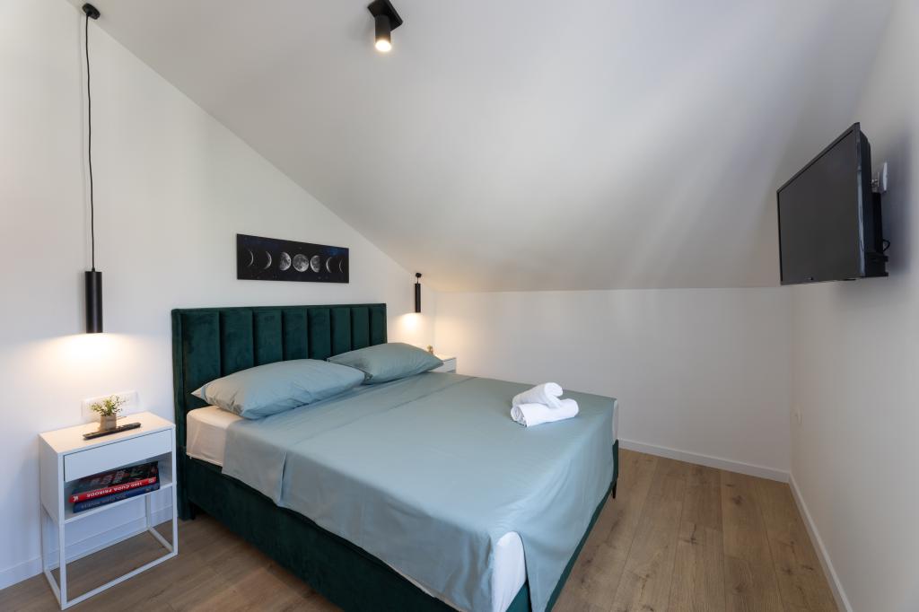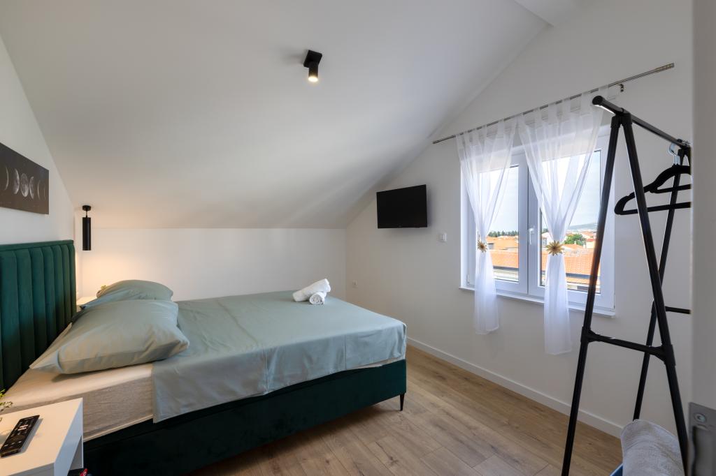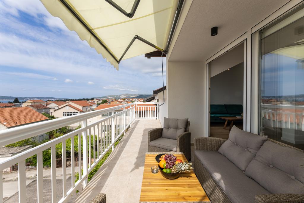 The house where the Panorama apartment 120 m2 is located (the top floor of the house) is located in the quiet surroundings of Kaštel Lukšić, a place between Trogir and Split. The apartment is newly renovated and equipped with all the necessities. It consists of 3 bedrooms (3 double beds), a living room, 2 bathrooms, a kitchen equipped with all kitchen appliances, dishes and cutlery and a balcony that offers a beautiful view of the sea. Each room has its own TV. For the guests of the apartment, bed linen, towels and a garage space are provided. The apartment also has WI-fi.