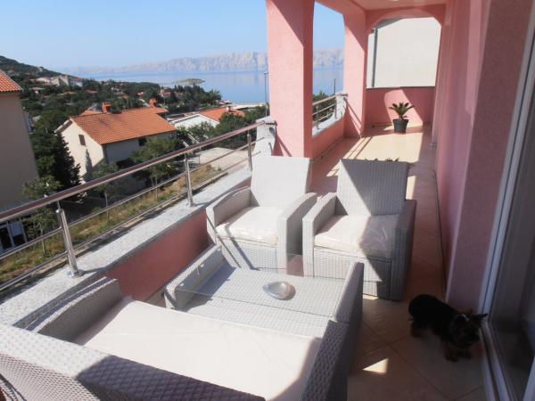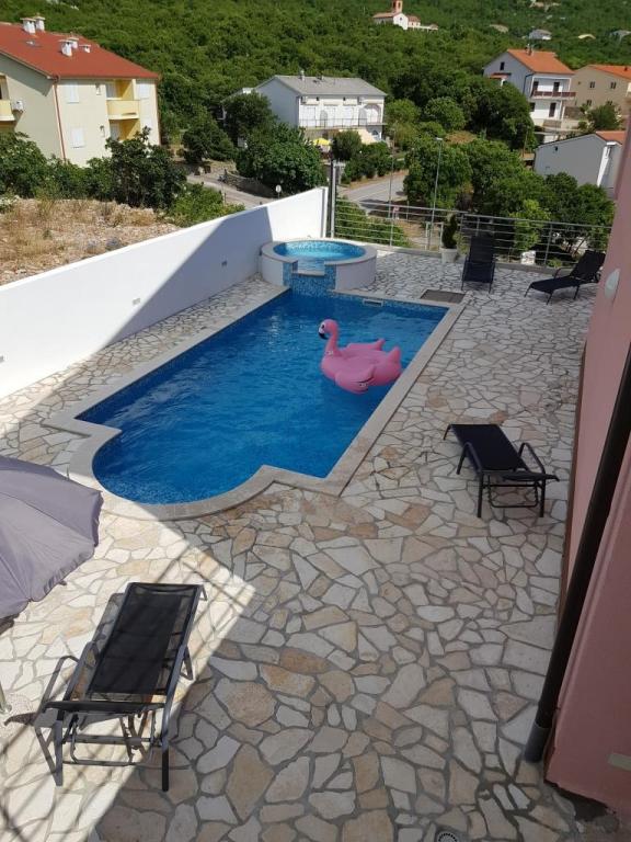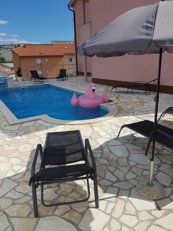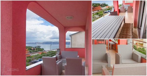 Residential tax is included in price.For apartment 4 1. The price of renting an apartment includes accommodation and tourist tax for 4 people, final cleaning, towels, bed linen, parking, use of barbecue and all equipment within the building. Near the house there is a boat for tourist trips to: Krk, Vrbnik, Baska, Goli Otok, Crikvenica, and other tourist places. On the beach it is possible to rent: parasols, deck chairs, rent a boat and other facilities. Plitvice Lakes National Park is 90 kilometers away and there are organized excursions. It is also possible to book a berth for a boat, the price of the berth is 15 euros a day and is paid at the port authority. For additional information about apartment 6 2 and prices send an inquiry. There is a swimming pool and a children's playground on site.