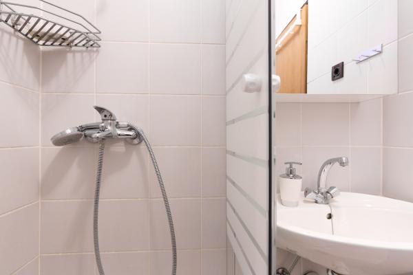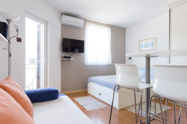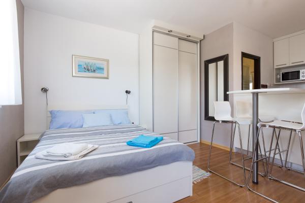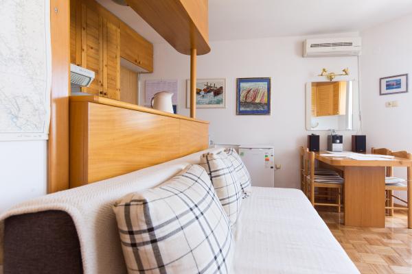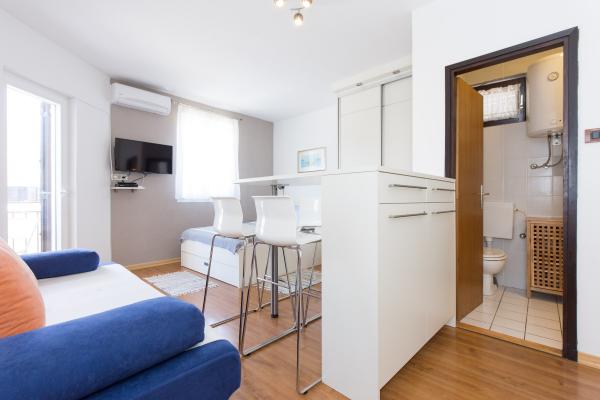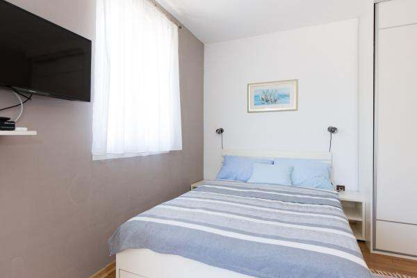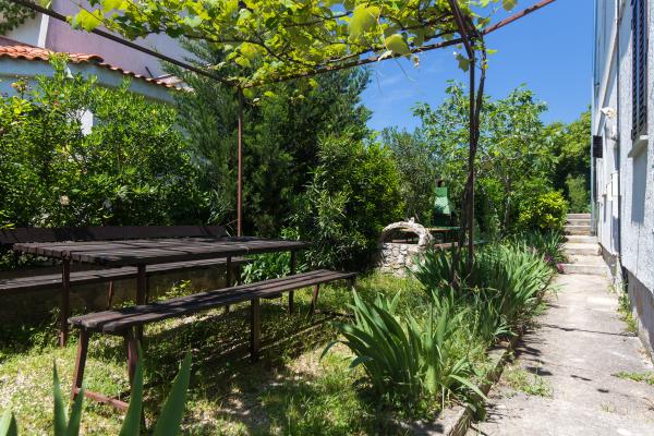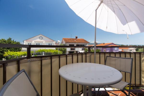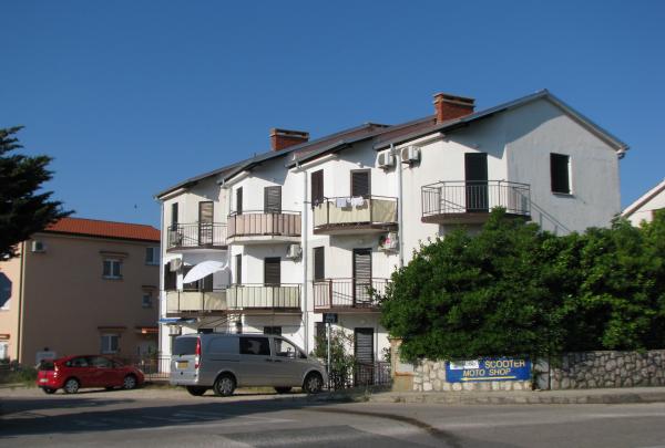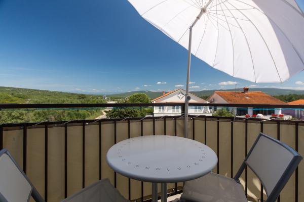 Completely furnished apartments on the first and second floor of a residential building in a quiet part of town Krk, living room separated from kitchen with high bar - Terrace overlooking the sea, table with three chairs and umbrella - Bathroom: electric water heater, closed shower cabin - Double bed 140 x 200; Extra bed / couch / for one adult or two children - WIFI flat Internet - Aluminum / PVC joinery - LCD TV - Hi Fi CD MP3 line - LED lighting - Air conditioning cooling / dehumidification / heating - In the yard of the bench and the table for rest and lunch - possibility of using the barbecue on wood and charcoal