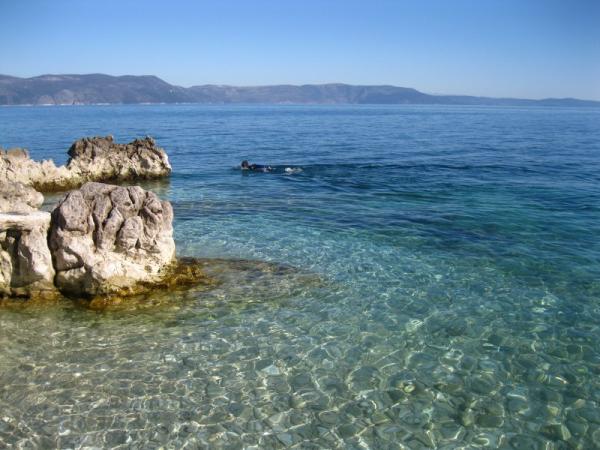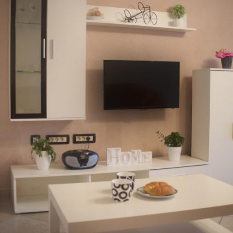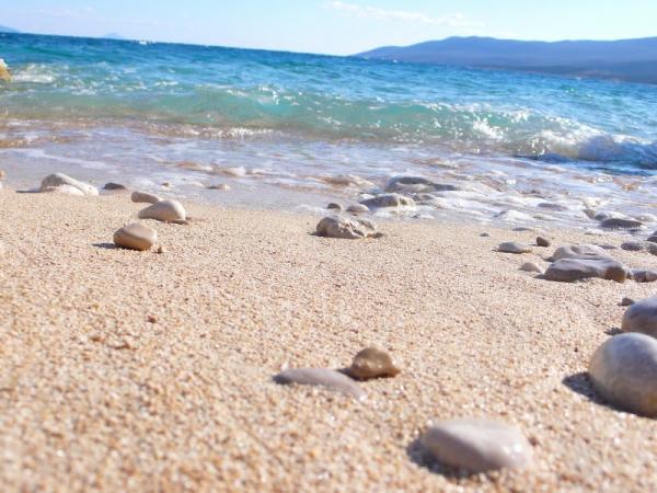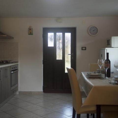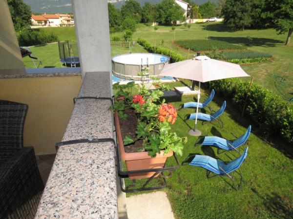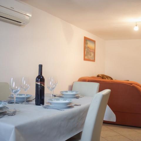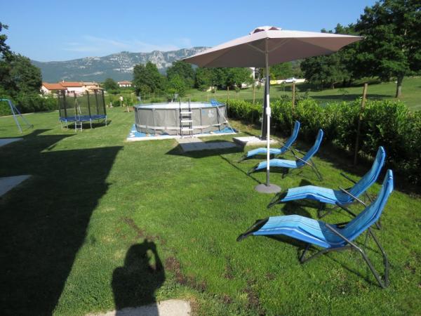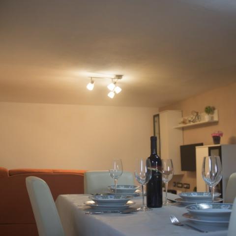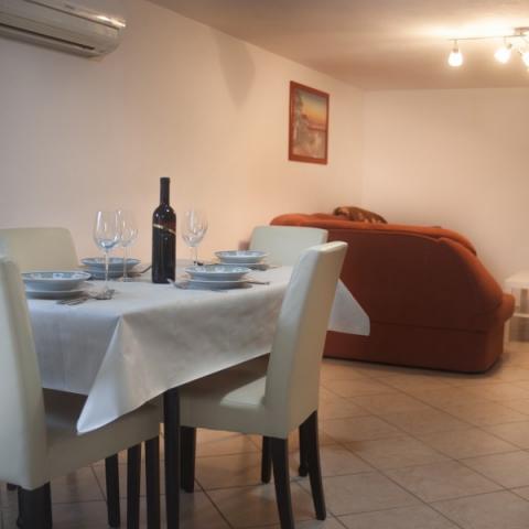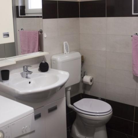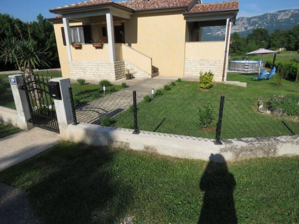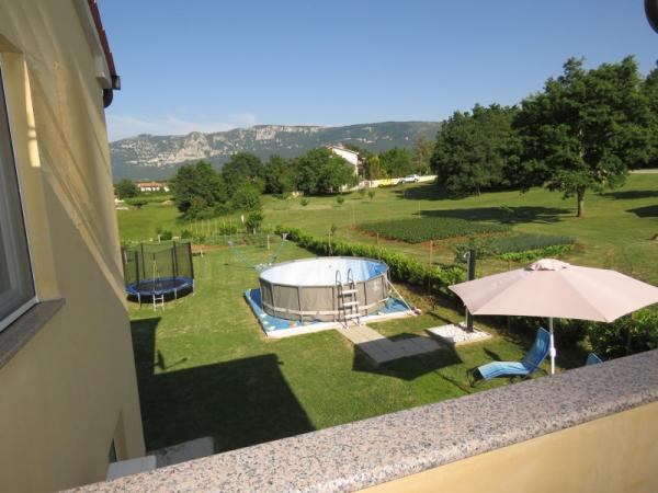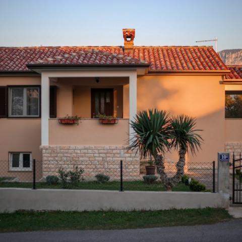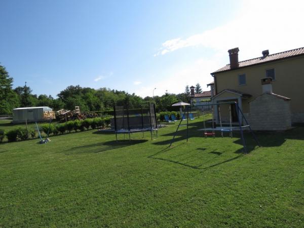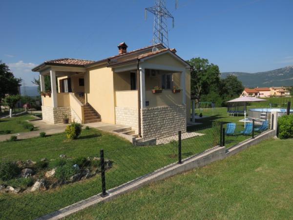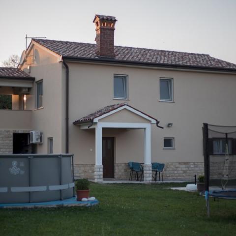 1-room apartment, 50m2 on the ground floor. Nicely furnished: living / dining room with 1 double sofa bed (140x200cm), satellite-TV. receiver (flat screen TV), air conditioning. Room with bed (140x200 cm) and bed (90x200). WC with shower. Open kitchen (4 hotplates, oven,, microwave, freezer, el, coffee maker, kettle). Terrace with barbecue (wooden table with 2 benches, pool view.): Washing machine, hairdryer. Outside there is a large fenced yard. In the yard there is a round swimming pool with shower, deck chairs and sunshade. A children's playground with trampoline, swings, net and badminton equipment. In the courtyard there is a barbecue with equipment. The house consists of 1 guest apartment and 1 apartment in which we live. The house is located in Kršan, which is 12 km away from Labin.