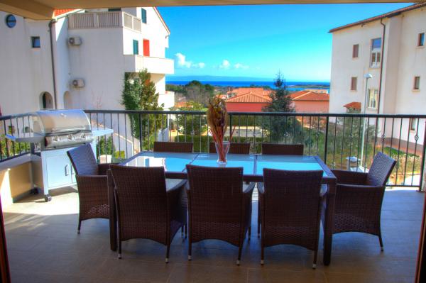 On the first floor we offer a nice apartment in Liznjan, a small fishing village of great beauty. Enjoy fishing, surfing, sunbathing and swimming in the crystal clear waters and enjoy the fresh sea breeze caresses. But after the activities, relax in the comfort of this three-bedroom apartment with a balcony from which the view stretches far to the blue horizon. The apartment consists of entrance hall, 1 bathroom, cloakroom, 2 bathrooms, 3 bedrooms, 2 living rooms in one, dining room, kitchen and two large terraces. The whole apartment is 158 m2. There is also a private car, the electric closing with a remote control. Apartment safety is assured because the built-in alarm system.
