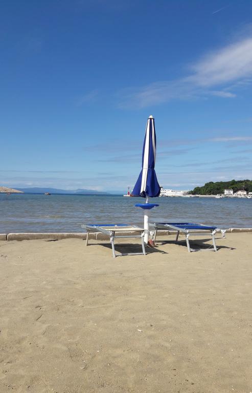 Our apartments are in a quiet location, about 300 m from the ferry terminal to the island of Krk (Valbiska). In the immediate vicinity (100 m) there is a sandy beach called Mel (ideal for small children) with a landscaped park called Kapić (possibility of shade). Sun loungers and parasols can be rented directly on the beach. Furthermore, many natural bays such as Sahara, Ciganka, Dubac and Stolac can be reached in a short time. On the other side of Lopar is San Marino with its large paradise beach “Rajska Plaža”; by car in about 2 minutes or on foot in about 15 minutes. Furthermore, there are the campsite San Marino, hotel complexes and several restaurants. Among other things, sports activities, boat trips and wellness are offered in abundance.