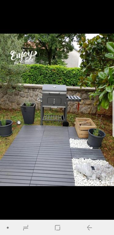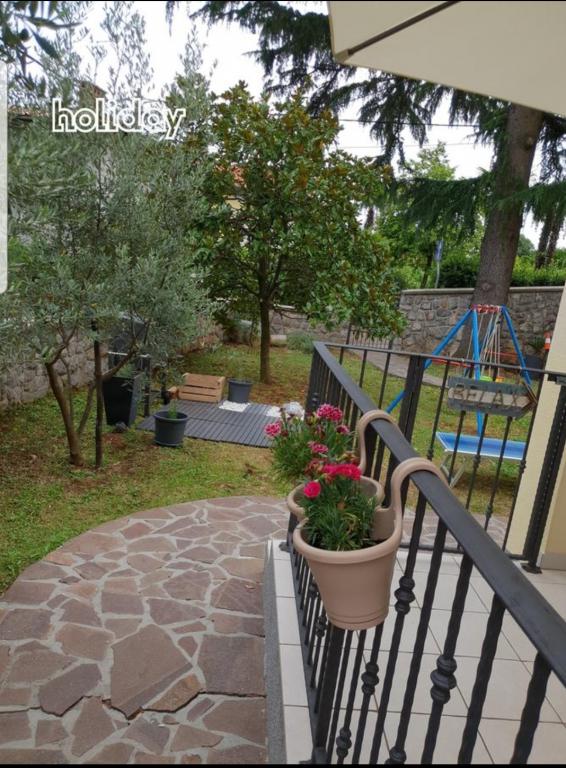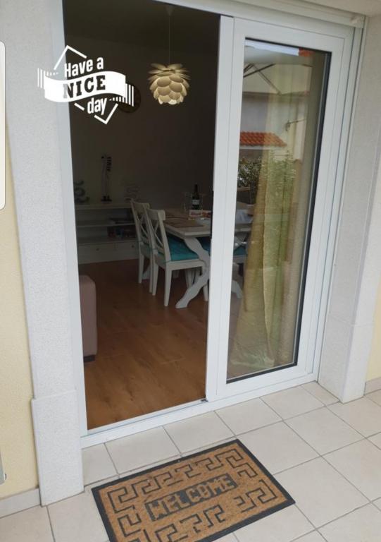 Modernly equipped apartments on the ground floor with partial sea view, garden, outdoor grill, playground for children. Each apartment has a private parking space on site. The building has two apartments, one larger that accommodates 4 people within 2 bedrooms, bathroom, kitchen, living room with dining area and a partially covered large terrace. The second apartment is slightly smaller, also accommodates 4 people inside, one bedroom, living room with sofa bed that provides accommodation for two more people, bathroom, living room with kitchen and partially covered terrace. Both apartments have a fully equipped kitchen with all necessary facilities. The larger apartment offers a tumble dryer in addition to a washing machine. Both apartments have a dishwasher.