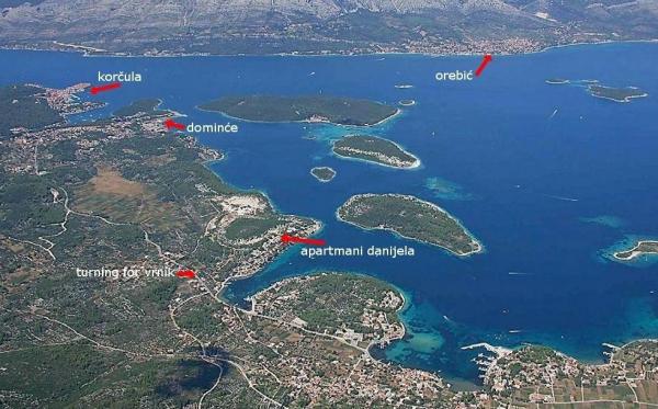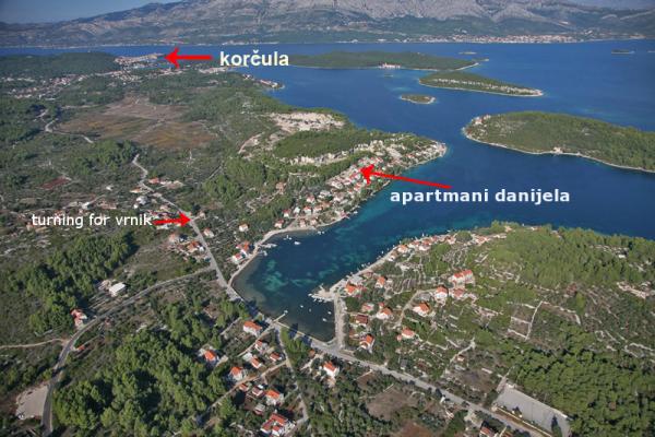 Apartments Daniela is located in the most beautiful bay of the well reputed village of Lumbarda. Located on the west side of the bay of Racisce offering a breathtaking view of the picturesque village bathing in crystal clear morem.Apartmani are surrounded by the Mediterranean vegetation and a beautiful garden. The house has a swimming pool for guests of the house. Distance from the sea is 50 m, from the center of Lumbarda 1 km from the old town of Korcula 5 km. If you decide to spend your holiday with us you'll enjoy peace and quiet, fresh sea air, local gourmand specialties with famous wines and spirits together with your hosts whose family roots in the centuries that feel the ambiance of the area. Apartments Danijela are composed of 3 apartments (6 2 4 1 4 1), one studio-apartment (2 1), parking place, mooring for boats and barbecue. Apartments Danijela offer and the possibility of renting a bicycle, buying cvrhunskih local wines, brandies and exre virgin olive oil.