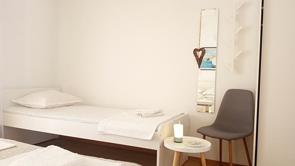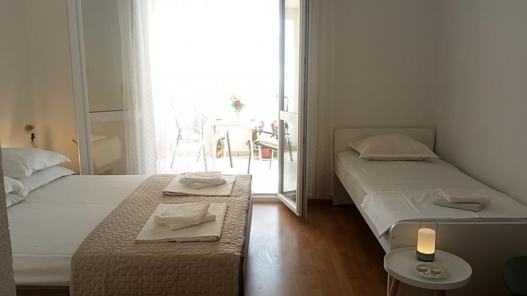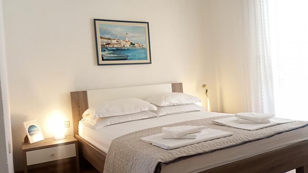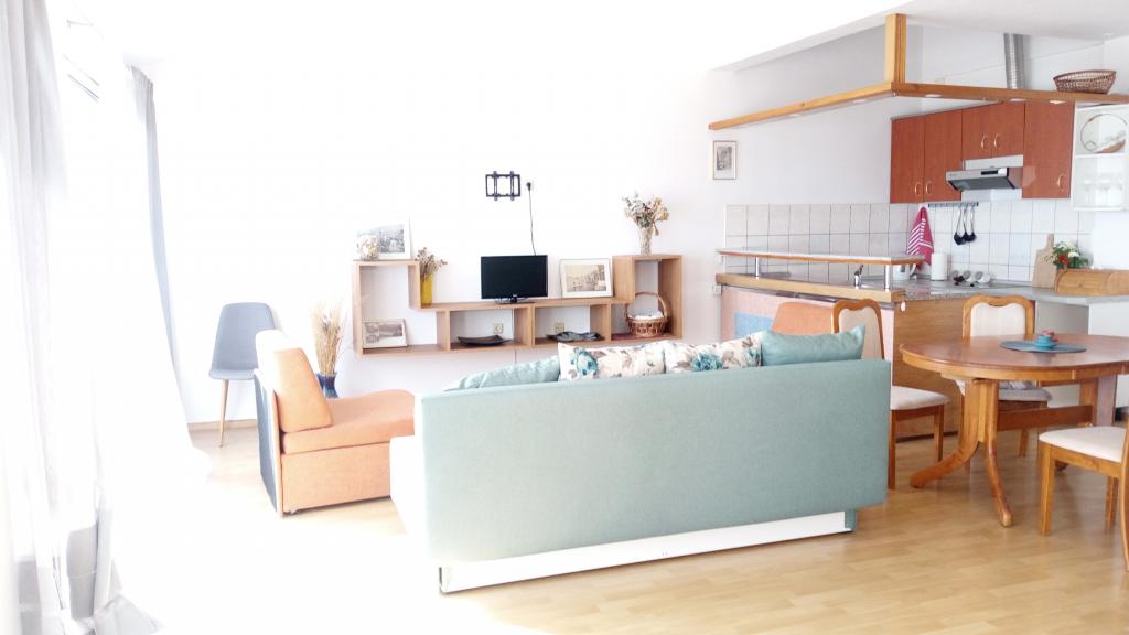 The apartment is located in the attic of the house. On the south side of the apartment there is a kitchen and living room which opens onto a terrace with a beautiful view of the sea and the islands of Hvar and Brac. On the north side of the apartment there is a room, bathroom with toilet and a balcony where you can stay and enjoy the morning sun. The apartment is equipped with TV, air conditioning and internet (Wi-fi). Not far from the house there are three shops, pharmacies and an ambulance, nearby is a sports and recreation center with tennis courts and water sports. ACCOMMODATION UNIT: A 2 + 2 -bedroom with double bed and extra bed -living room with sofa bed for 2 persons -kitchen -bathroom with toilet -internet, TV -air conditioning -terrace with sea view -comfortable apartment - ideal for couples and families with children -place to relax -free one parking space
