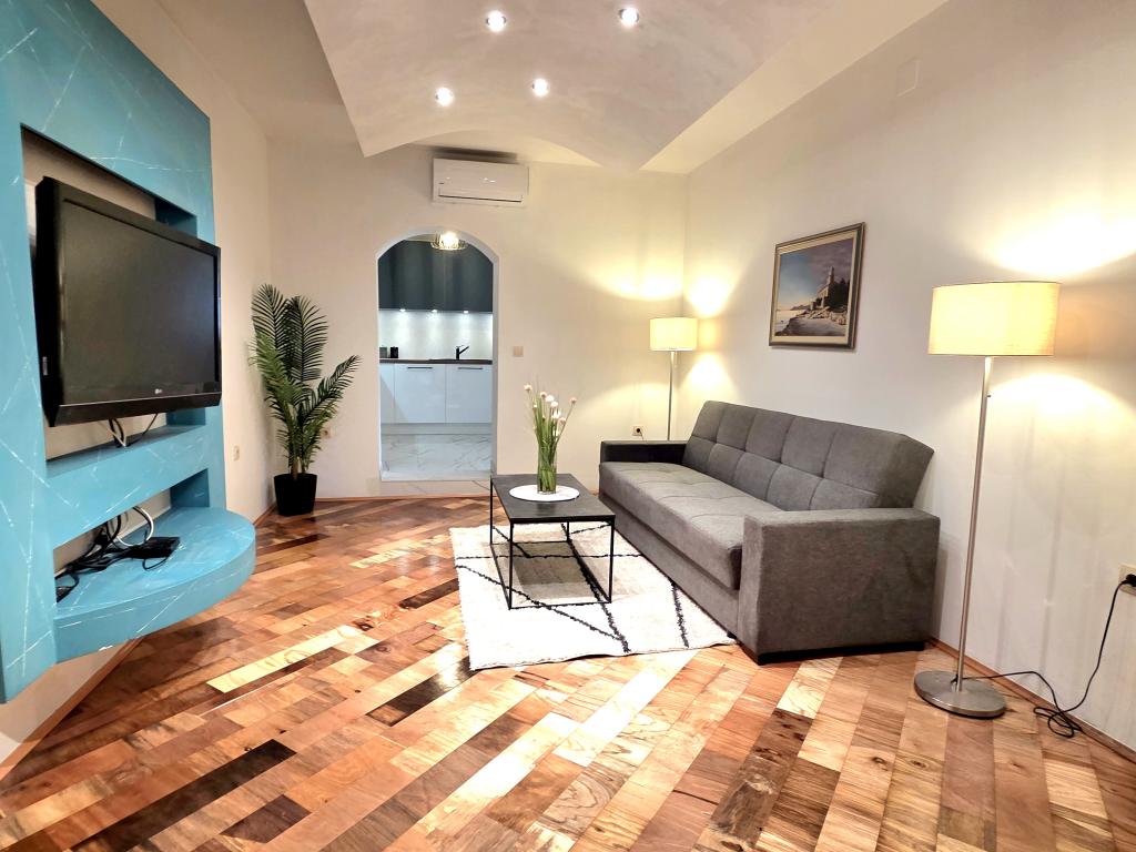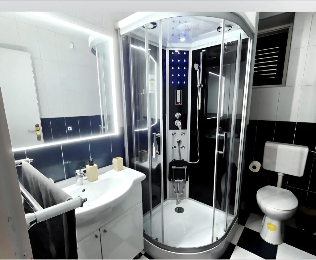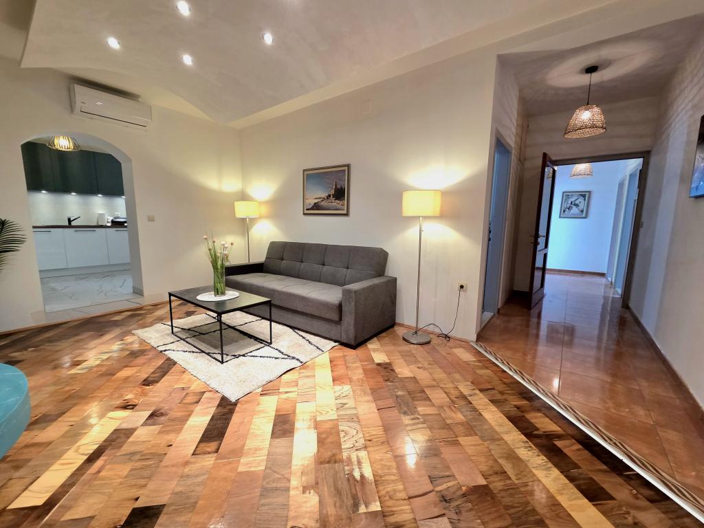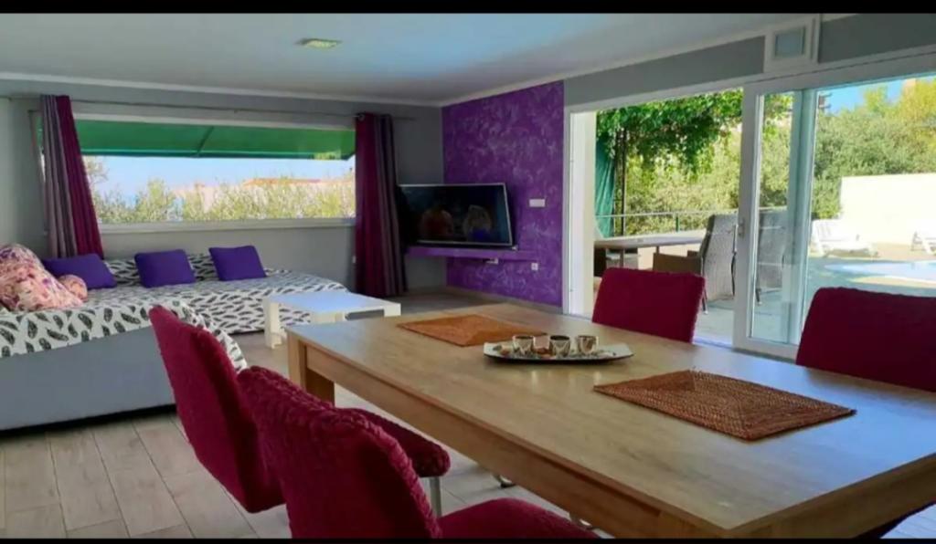 Apartment Robert is located 400 m above the old town. It has an area of 120 m2 and consists of two bedrooms, two bathrooms, a living room and a kitchen. In front of the apartment there is a jacuzzi, TV, table with benches, grill, swimming pool with sun loungers and shower and private parking for your car. Welcome!