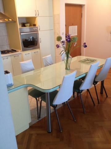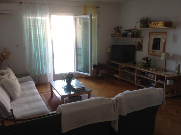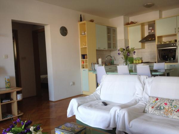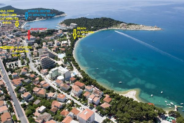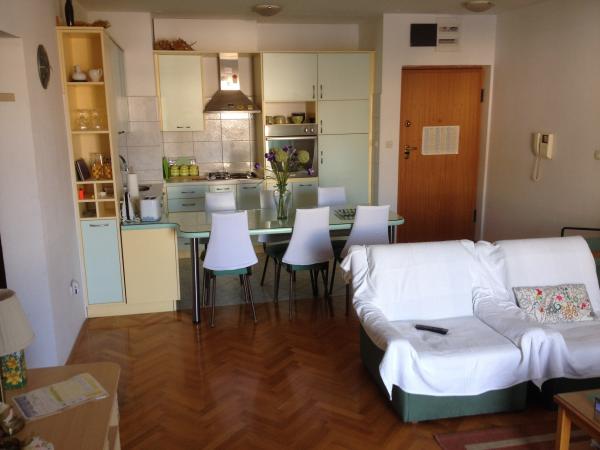 The apartment is located in the center of Makarska. It is 5 minutes walk from the bus station and 5 minutes walk from the beach. The apartment is located on the first floor, while the ground floor there is a large grocery products. It takes you 10 minutes to reach the old town of Makarska. Sports center is only 15 minutes walk from the apartment. Discos for entertainment are within 15 minutes walk from the apartment. The apartment is beautifully decorated and within it there are two bedrooms, bathroom, living room, large terrace, kitchen and dining room.