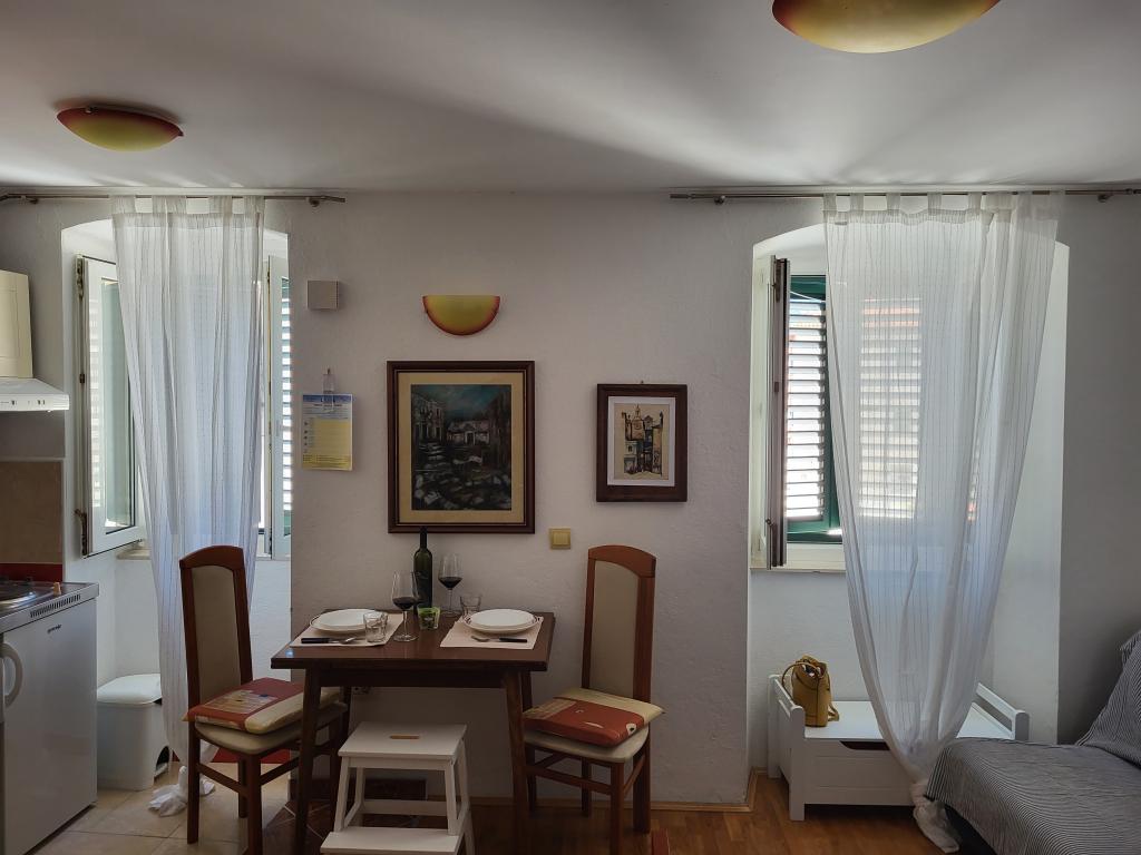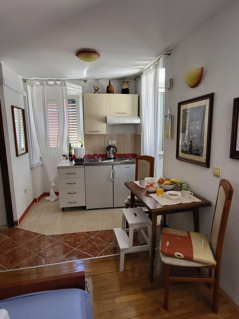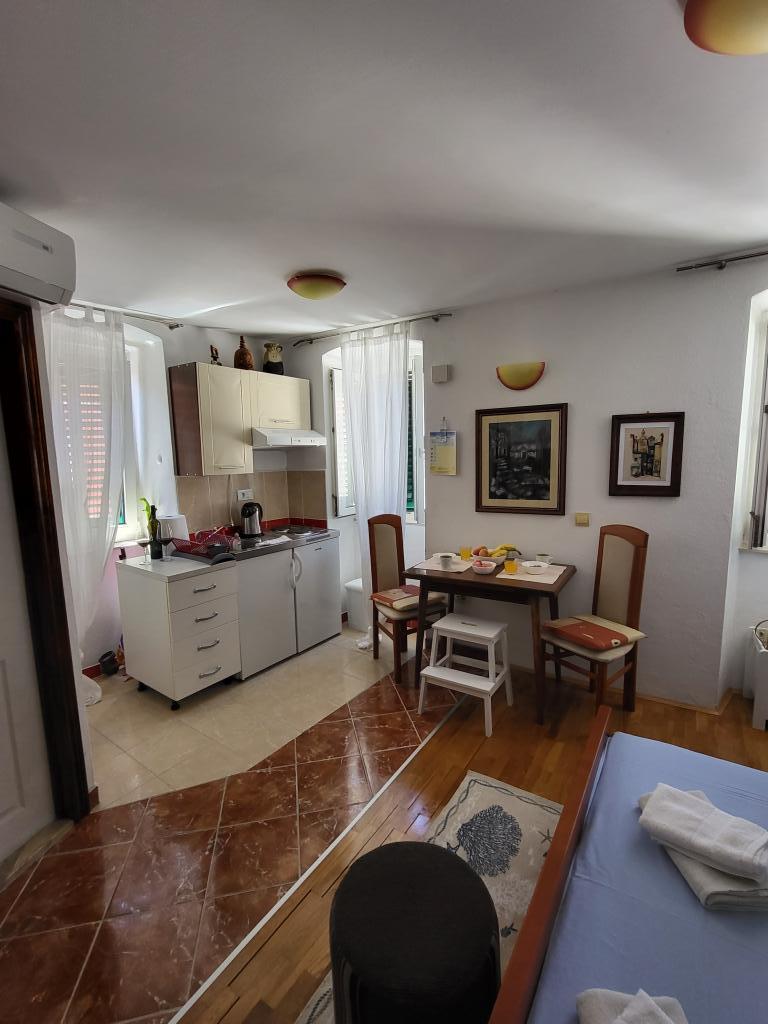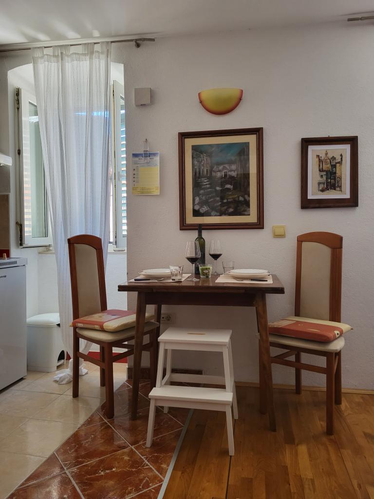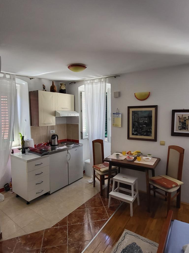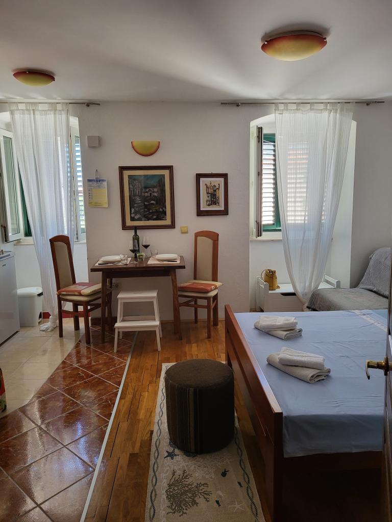 The studio is located in the very center of the city, on Kačić Square. In the immediate vicinity is the waterfront 10 meters, and to the nearest beach about 150 meters. The shop, market and bakery are located on the north side of the square, less than 50 m. The doctor's office is located about 10 meters from the entrance to the building. Studio offers 2 + 1 accommodation. In addition to the classic double bed, there is an armchair that stretches out and turns into a single bed. Mini kitchen that meets the needs of cooking and consuming food, and a bathroom with shower, toilet and sink.