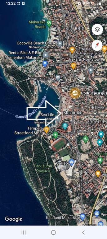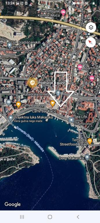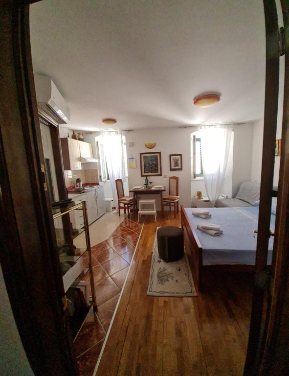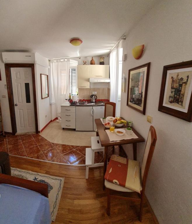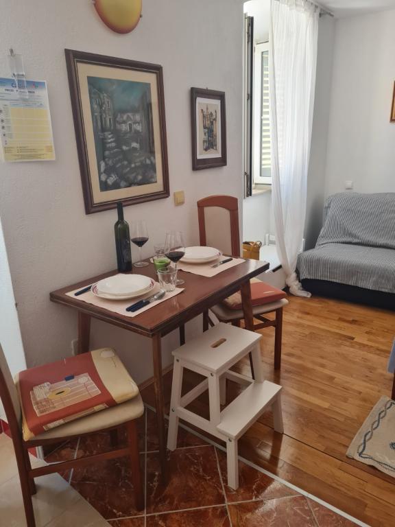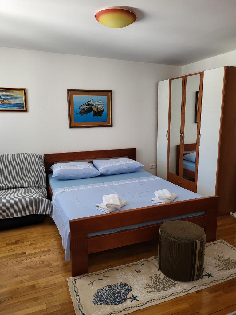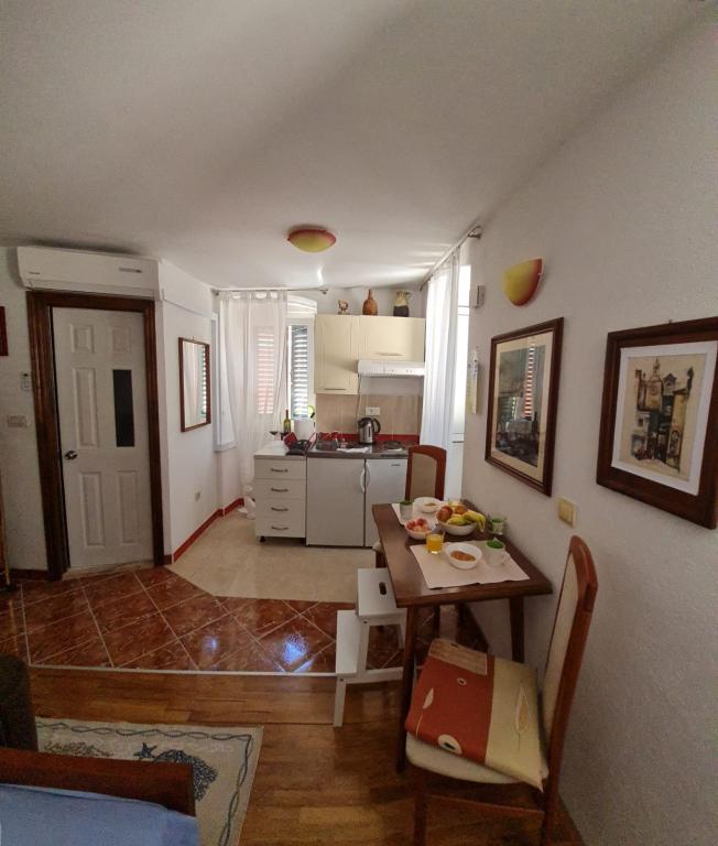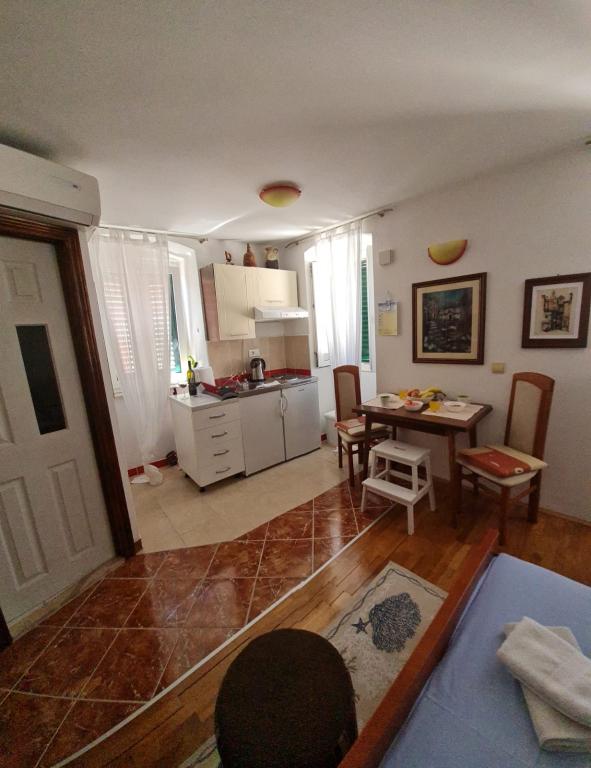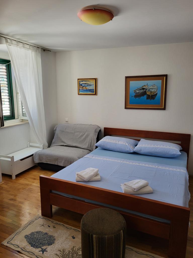 The studio is located in the very center of the city, on Kačić Square. In the immediate vicinity is the waterfront 10 meters, and to the nearest beach about 150 meters. The shop, market and bakery are located on the north side of the square, less than 50 m. The doctor's office is located about 10 meters from the entrance to the building. Studio offers 2 + 1 accommodation. In addition to the classic double bed, there is an armchair that stretches out and turns into a single bed. Mini kitchen that meets the needs of cooking and consuming food, and a bathroom with shower, toilet and sink.
