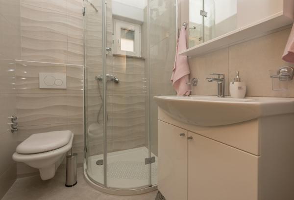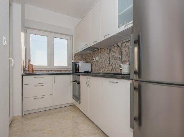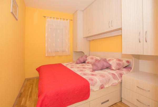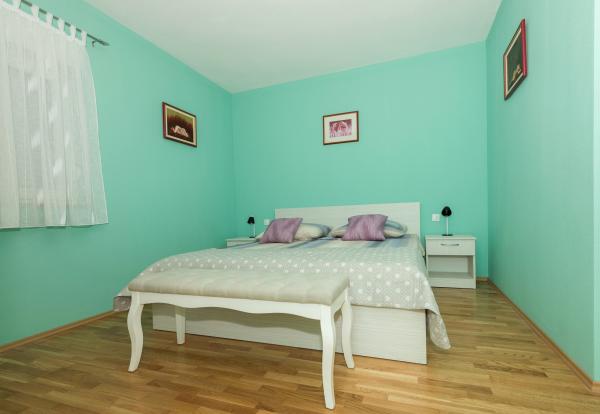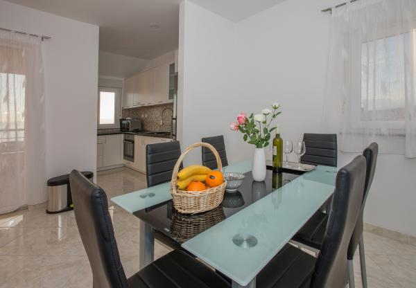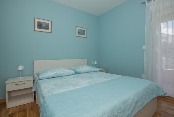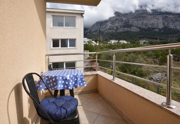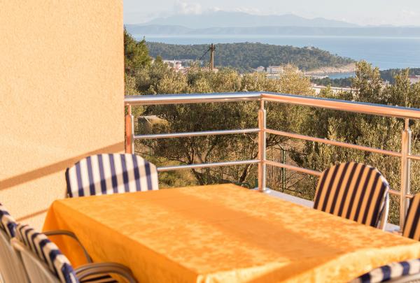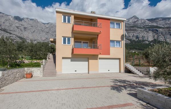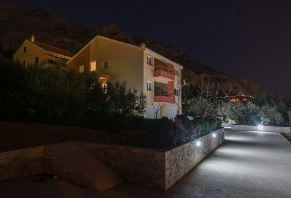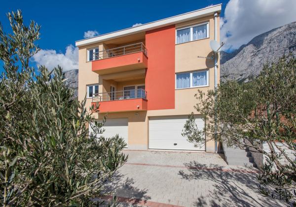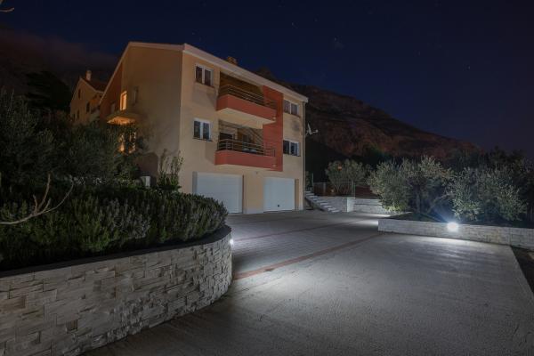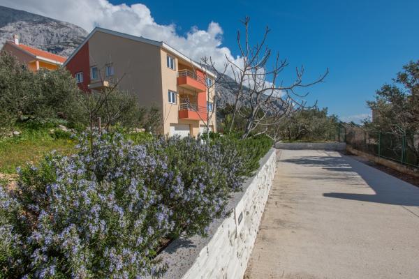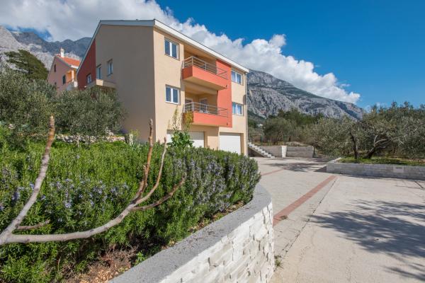 Apartments Buba / Olive are our new tourist house, which was completed in 2018. The house is located in a quiet part of town, at 95 meters above sea level, on the slopes of Biokovo mountain. It is 950 meters from the sea and 2 kilometers from the city center. The house is designed for a quiet family vacation. It is distinguished by the city crowds and is an ideal place to stay 6-8 people per apartment in a spacious and comfortable area. The house consists of three floors. On the ground floor there is a garage for 2 cars and a work area, and each next floor consists of one large apartment for 6 people. The house has a large garden with olive and vegetable garden, and in front of the house are walnut and olive trees. Parking space is provided for 2 cars per apartment.