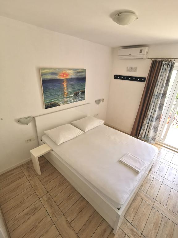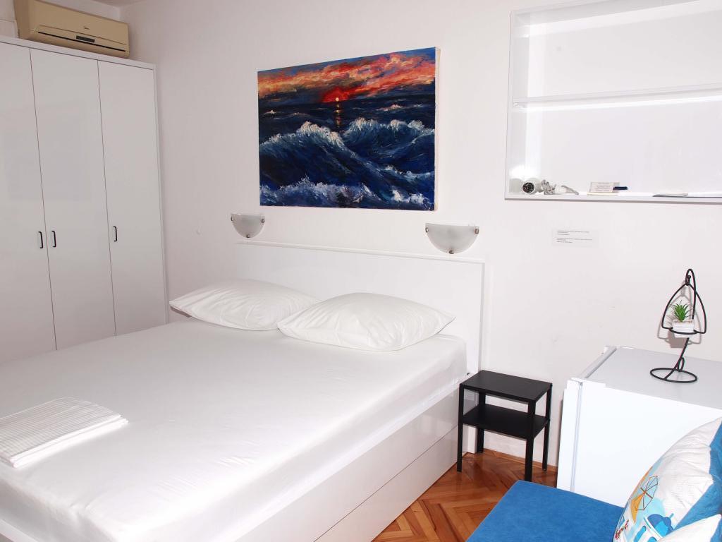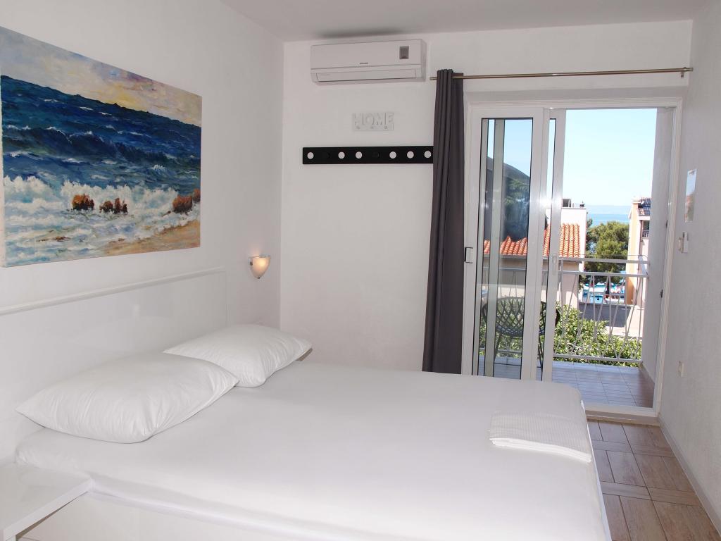 New and modernly equipped apartments with a sea view are located in the quietest, most attractive part of Makarska between the Places-Dalmacija hotel and the Biokovka hotel. Distance from the sea and sandy beach 50 m. A beautiful promenade surrounded by pine trees takes you to the city center in 10 minutes. Along the promenade there are numerous restaurants and interesting facilities. Guests have 4 accommodation units at their disposal. Two identical Studios on the 1st floor and two identical Apartments on the 2nd floor of the family house. There is a possibility to add an extra bed for a child in the apartment. All accommodation units have balconies. In all accommodation units, the kitchens are separated from the sleeping area. The apartments have their own external entrances, which allow complete privacy. The accommodation units are not exposed to the street and provide guests with peace from street noise. The price includes parking, internet, air conditioning and tourist tax.