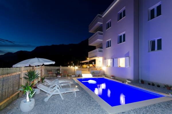 Apartment on the eastern part of the town of Makarska, situated in newly built house, the other flats are closed, the pool is for the use of guests of this single apartment, free parking, all rooms are air-conditioned, el.barbyque. The house is located 10 min. walk from the city center, the same distance to the beach (the city).