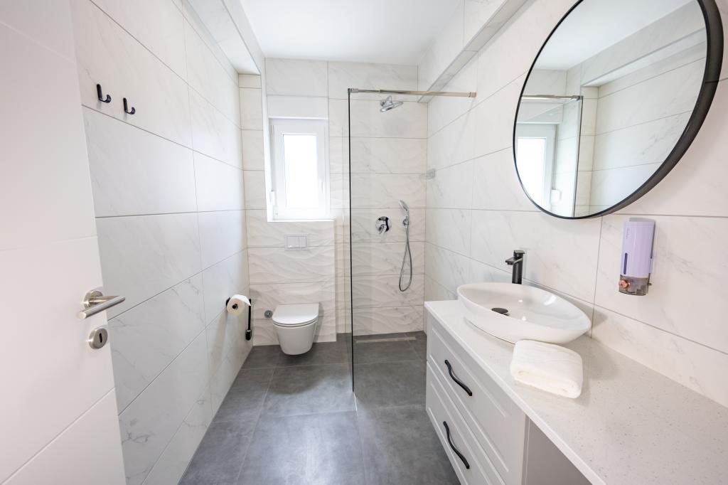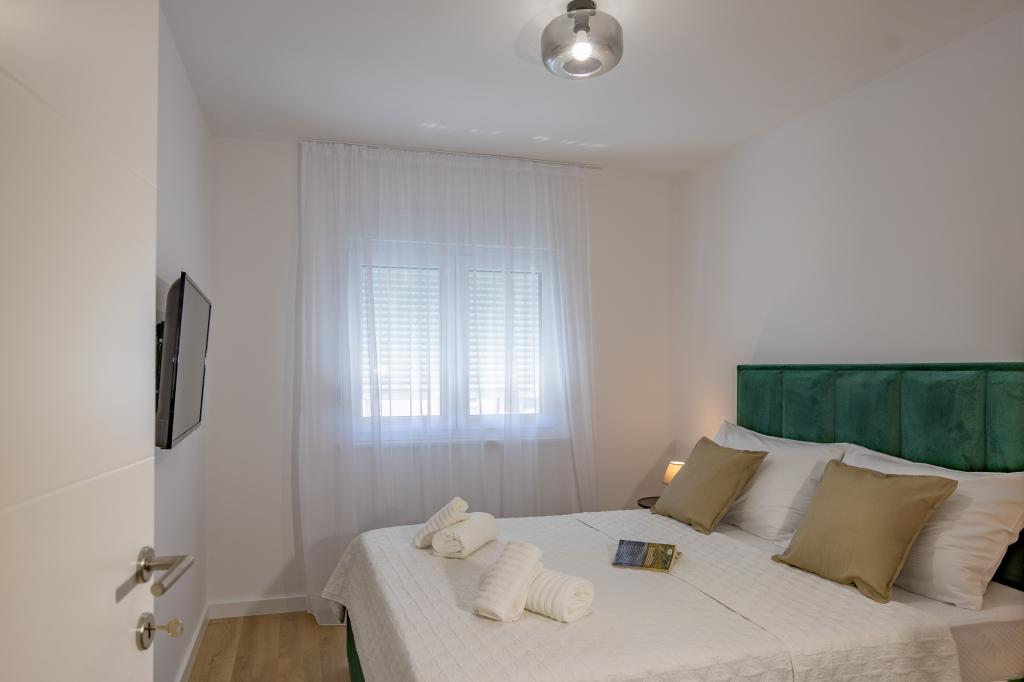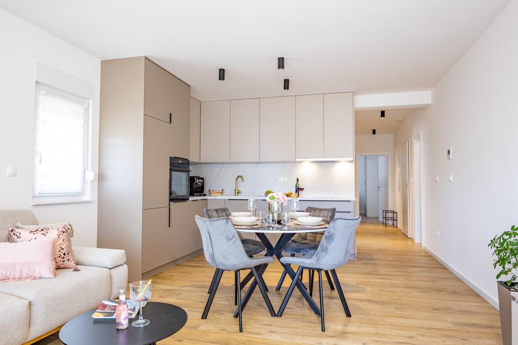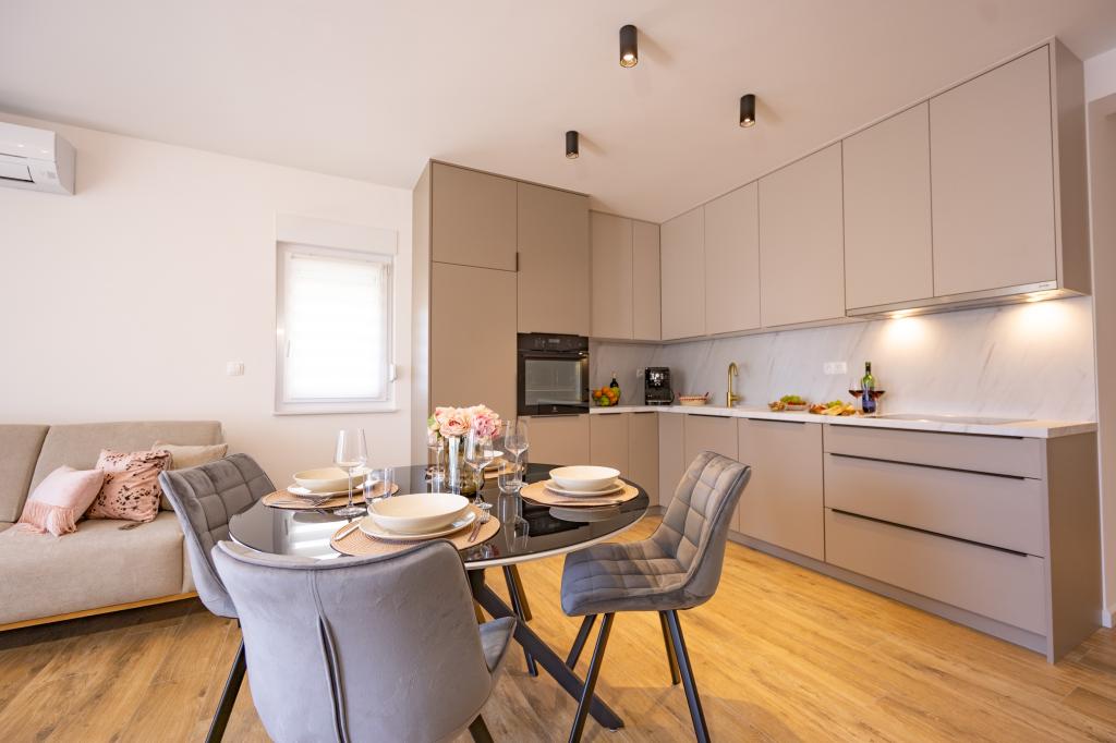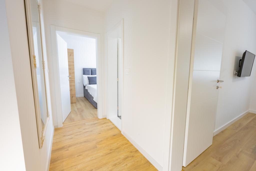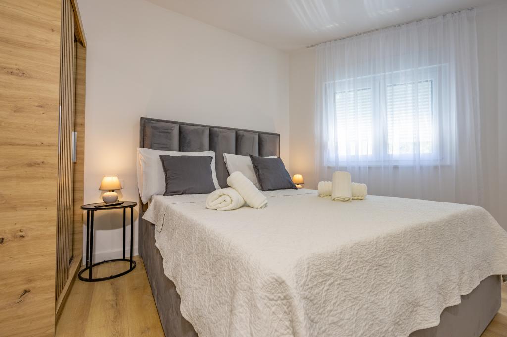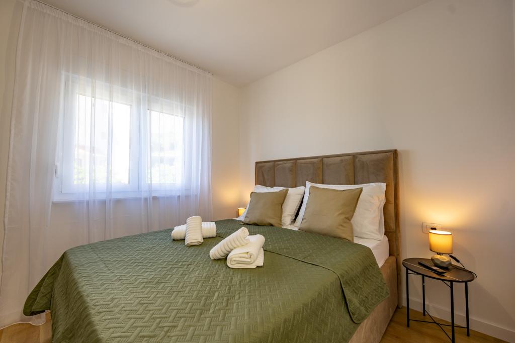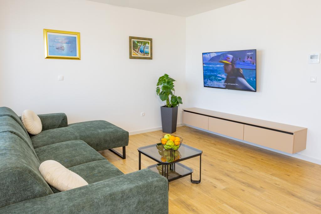 Each apartment exudes modern design and newly renovated interior. In the spacious living room, decorated with tasteful furniture and contemporary details, you will feel right at home. The open concept naturally connects the living room with a fully equipped kitchen, where elegant countertops, quality appliances and all the space you need to prepare your favorite meals await you. The living area opens onto a pleasant balcony - an ideal place for morning coffee or evening relaxation with a glass of wine and an unforgettable sunset over the Adriatic. Each apartment has two comfortable bedrooms with double beds, equipped with soft bedding and plenty of storage space, one modern bathroom and an additional toilet. The apartments are air-conditioned and fully equipped: TV/SAT, internet, washing machine, dishwasher, coffee maker and everything you need for a pleasant and carefree stay.