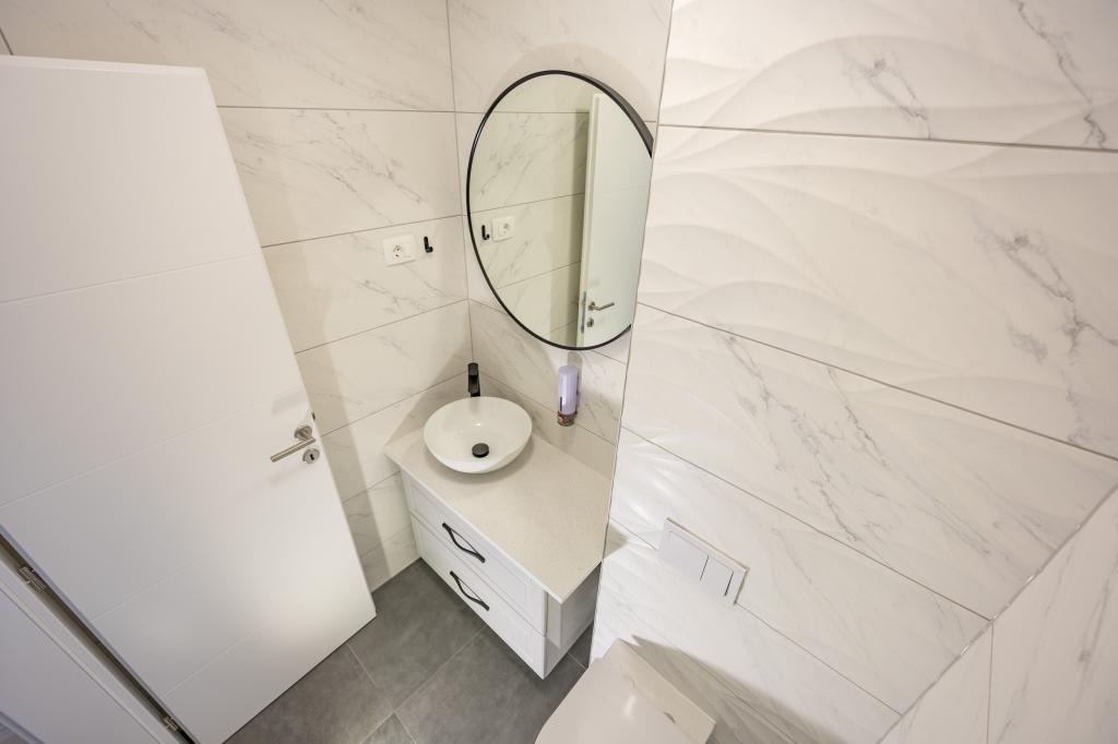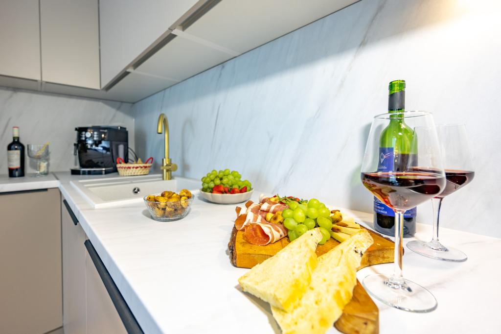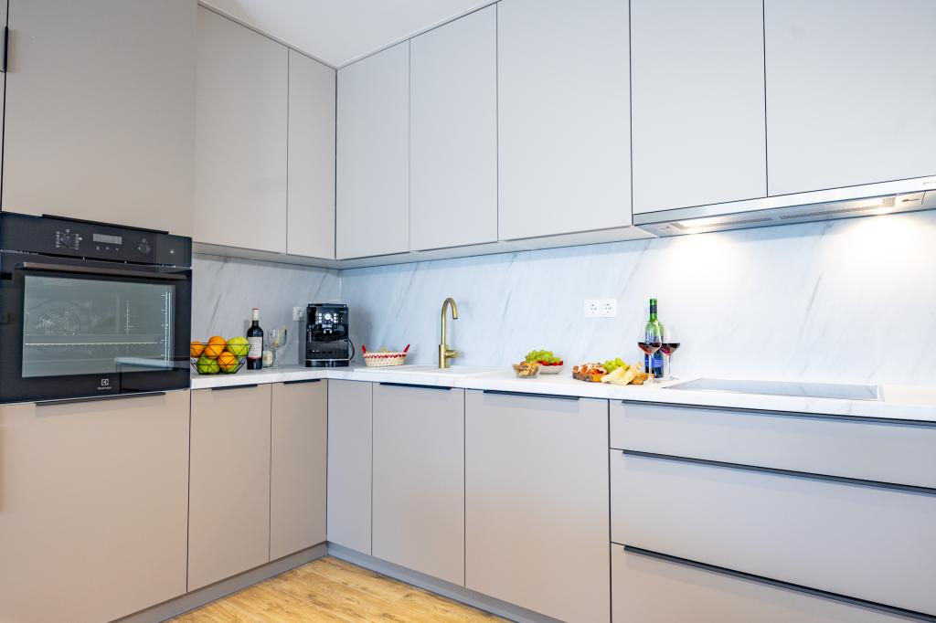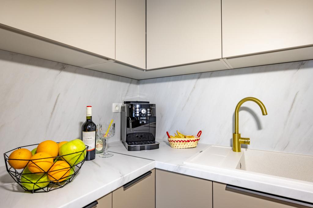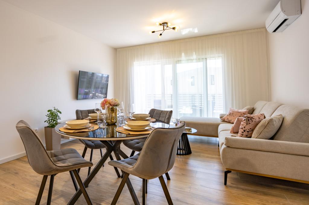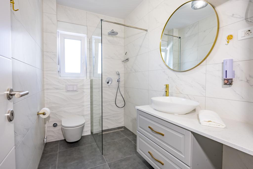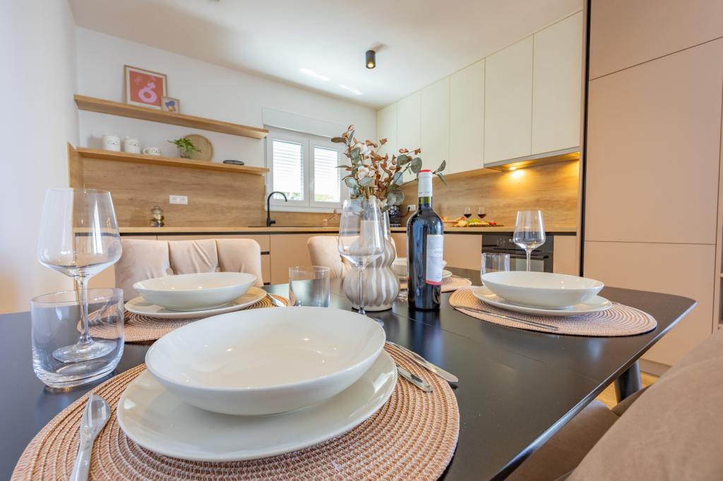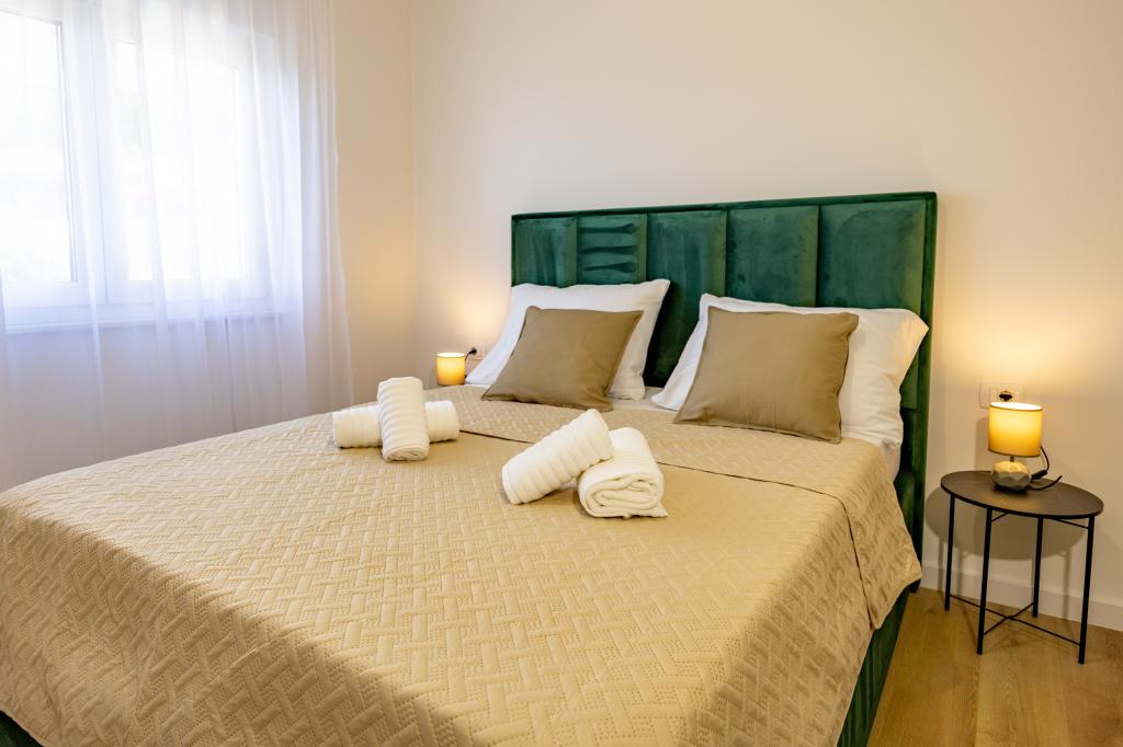 Each apartment exudes modern design and newly renovated interior. In the spacious living room, decorated with tasteful furniture and contemporary details, you will feel right at home. The open concept naturally connects the living room with a fully equipped kitchen, where elegant countertops, quality appliances and all the space you need to prepare your favorite meals await you. The living area opens onto a pleasant balcony - an ideal place for morning coffee or evening relaxation with a glass of wine and an unforgettable sunset over the Adriatic. Each apartment has two comfortable bedrooms with double beds, equipped with soft bedding and plenty of storage space, one modern bathroom and an additional toilet. The apartments are air-conditioned and fully equipped: TV/SAT, internet, washing machine, dishwasher, coffee maker and everything you need for a pleasant and carefree stay.