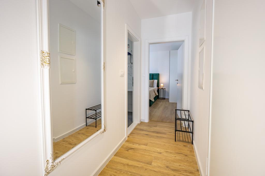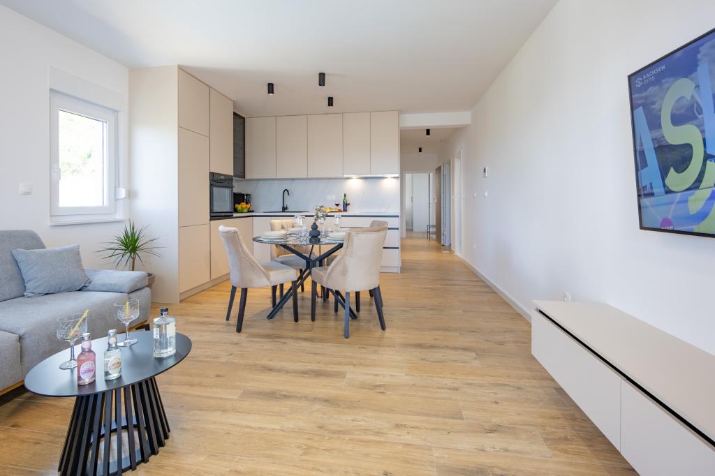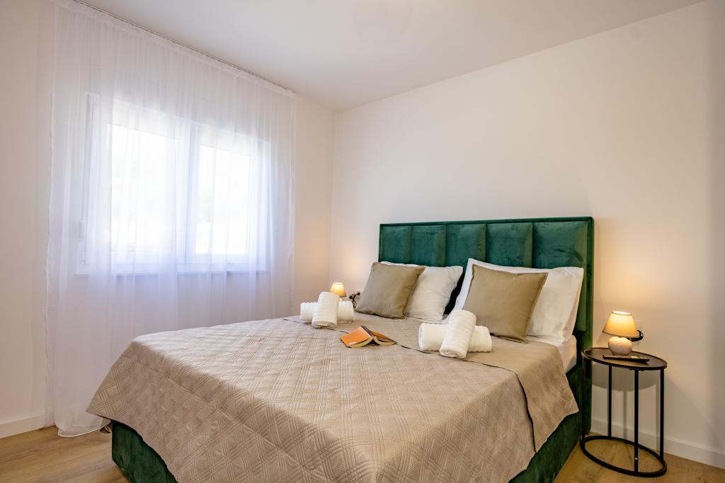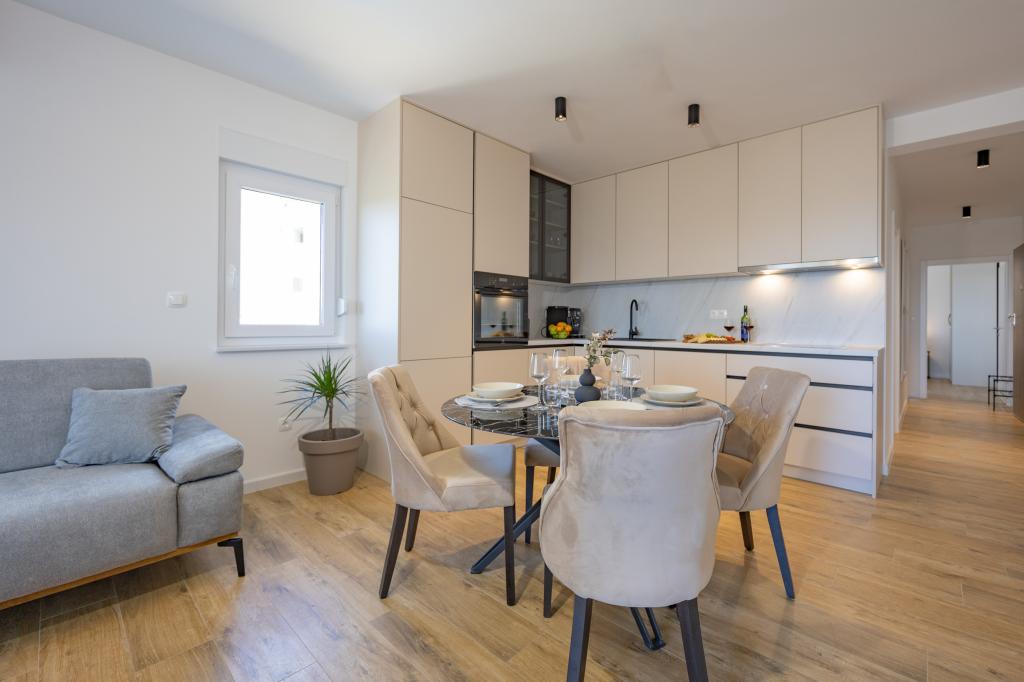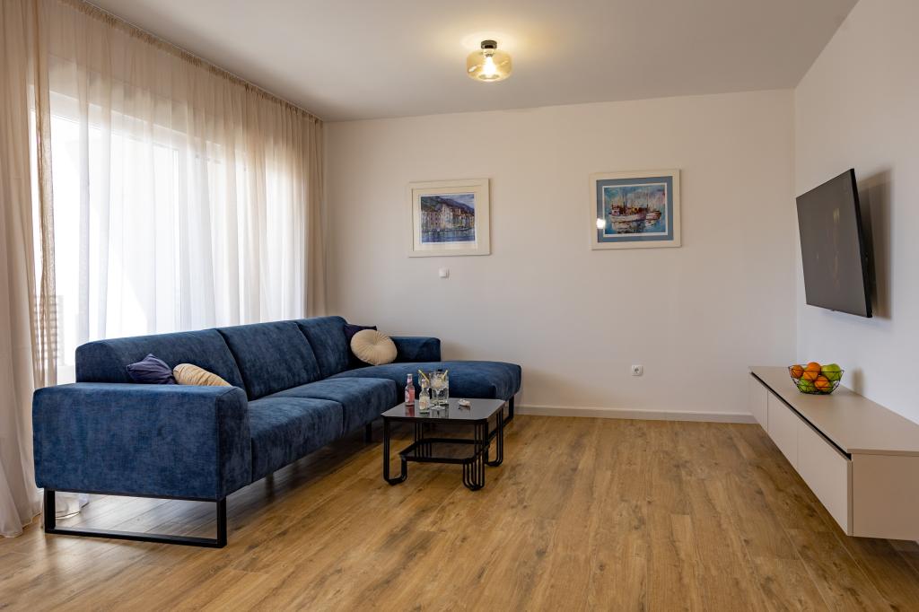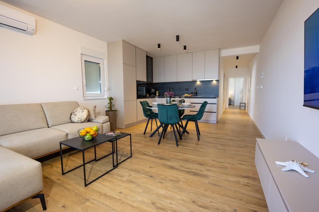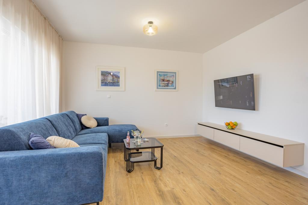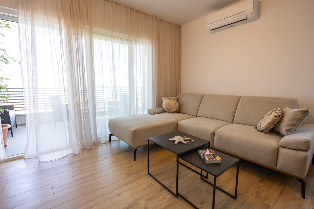 Each apartment exudes modern design and newly renovated interior. In the spacious living room, decorated with tasteful furniture and contemporary details, you will feel right at home. The open concept naturally connects the living room with a fully equipped kitchen, where elegant countertops, quality appliances and all the space you need to prepare your favorite meals await you. The living area opens onto a pleasant balcony - an ideal place for morning coffee or evening relaxation with a glass of wine and an unforgettable sunset over the Adriatic. Each apartment has two comfortable bedrooms with double beds, equipped with soft bedding and plenty of storage space, one modern bathroom and an additional toilet. The apartments are air-conditioned and fully equipped: TV/SAT, internet, washing machine, dishwasher, coffee maker and everything you need for a pleasant and carefree stay.