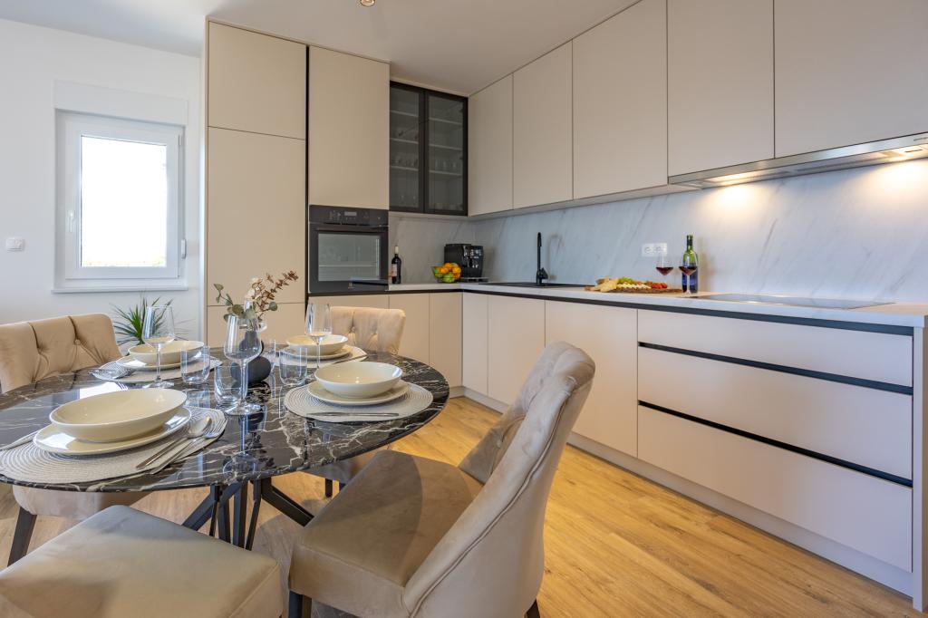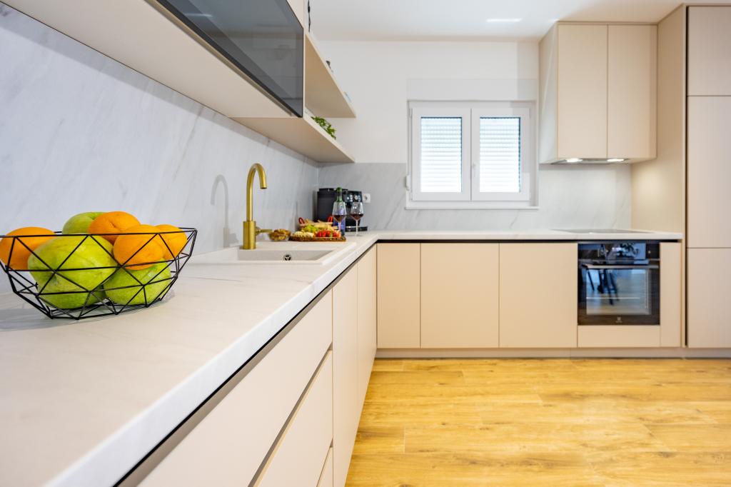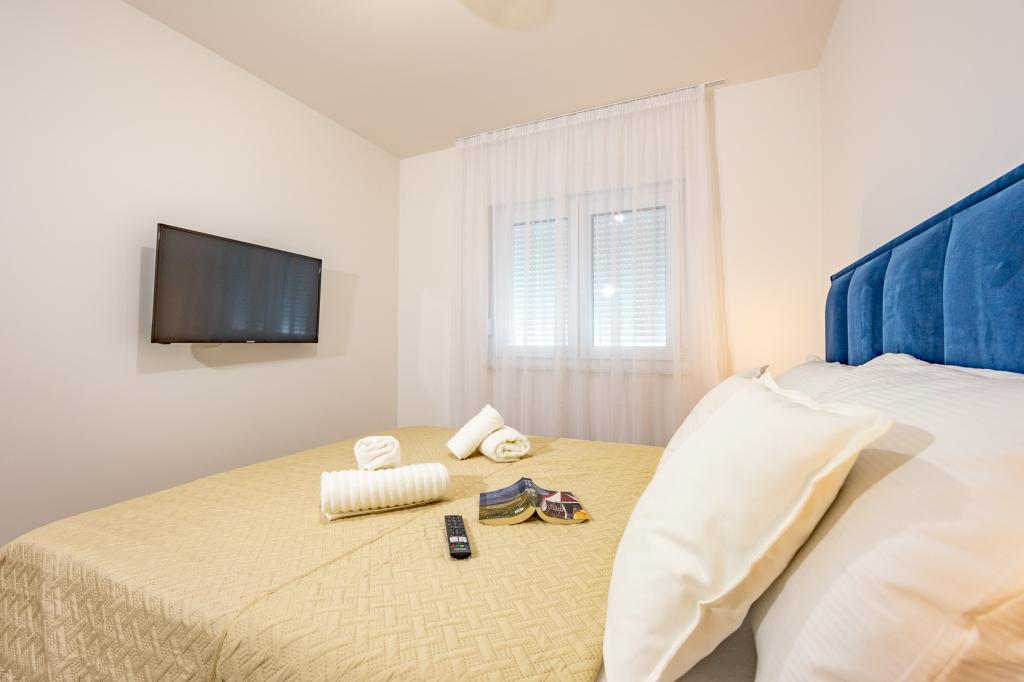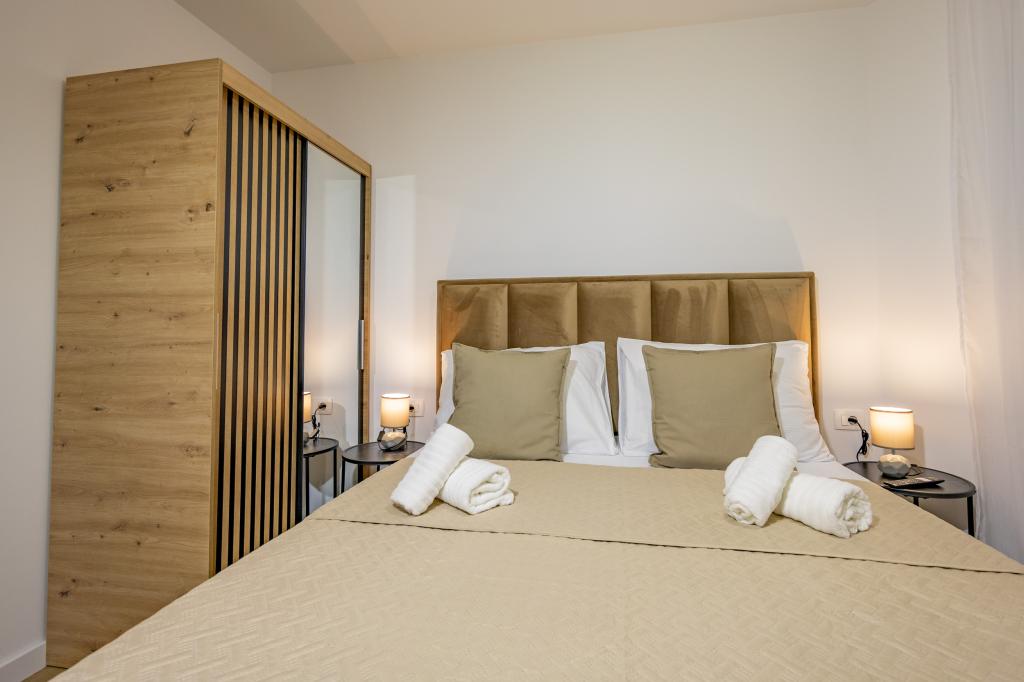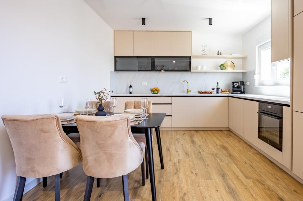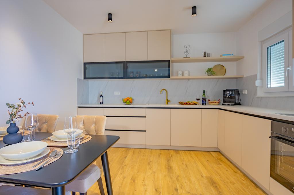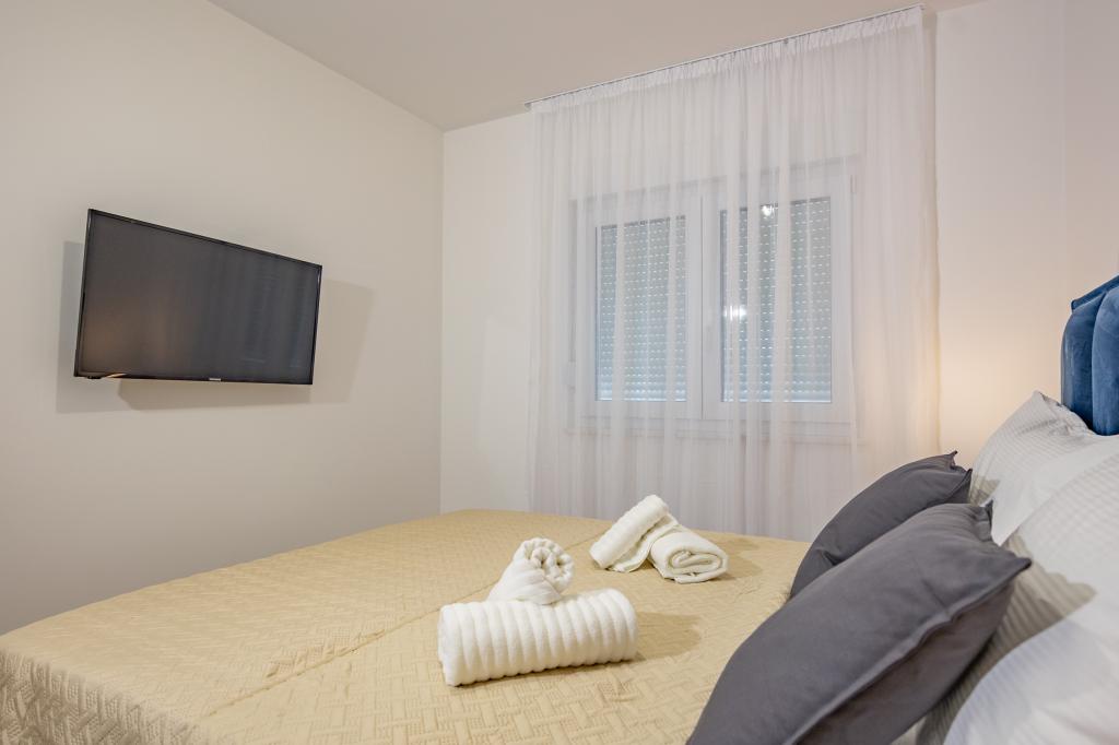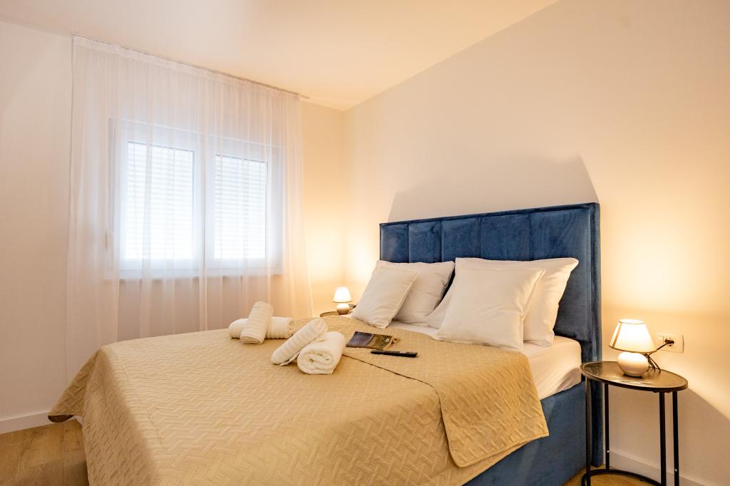 Each apartment exudes modern design and newly renovated interior. In the spacious living room, decorated with tasteful furniture and contemporary details, you will feel right at home. The open concept naturally connects the living room with a fully equipped kitchen, where elegant countertops, quality appliances and all the space you need to prepare your favorite meals await you. The living area opens onto a pleasant balcony - an ideal place for morning coffee or evening relaxation with a glass of wine and an unforgettable sunset over the Adriatic. Each apartment has two comfortable bedrooms with double beds, equipped with soft bedding and plenty of storage space, one modern bathroom and an additional toilet. The apartments are air-conditioned and fully equipped: TV/SAT, internet, washing machine, dishwasher, coffee maker and everything you need for a pleasant and carefree stay.