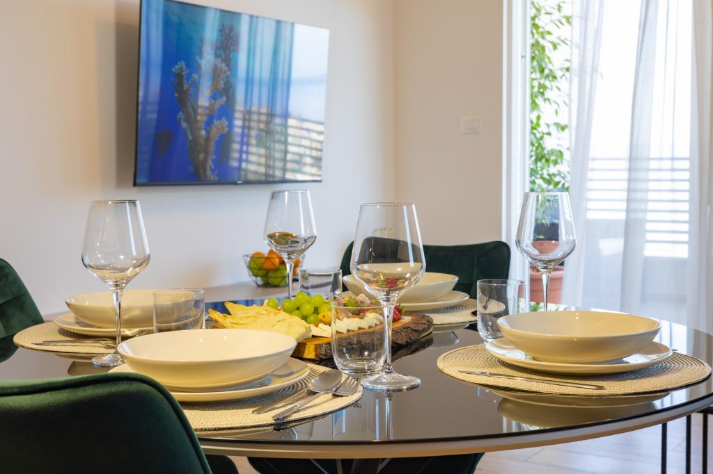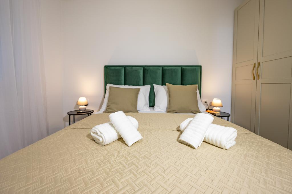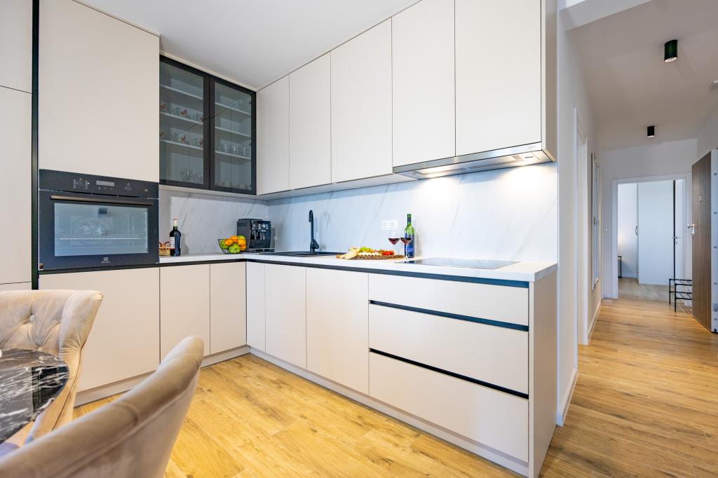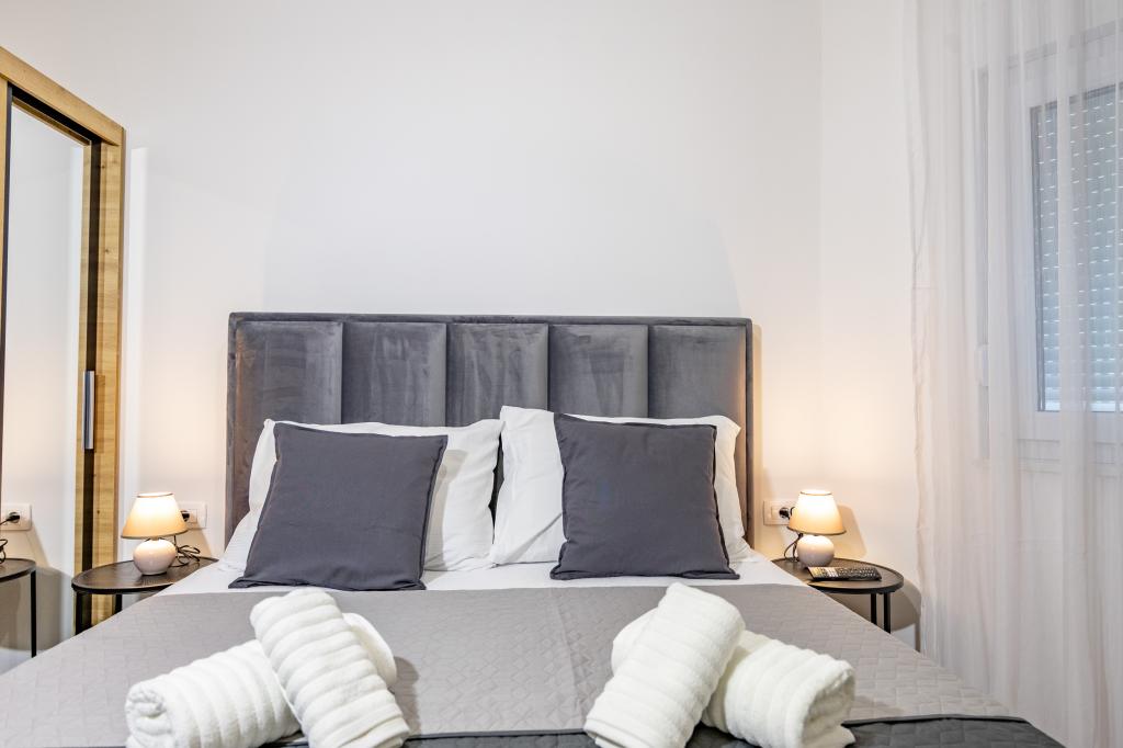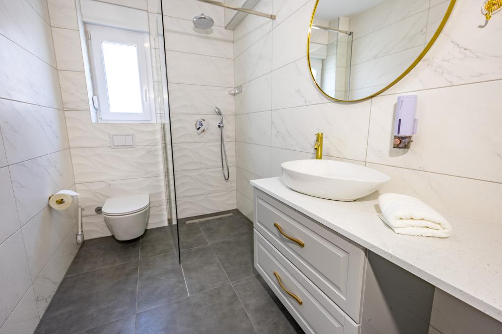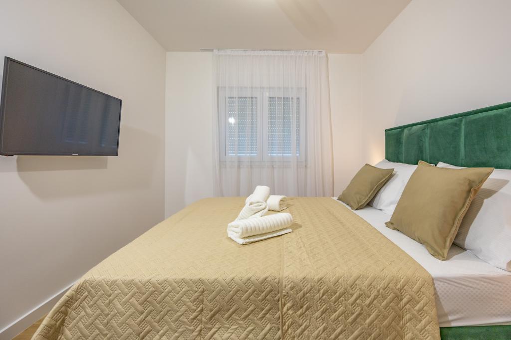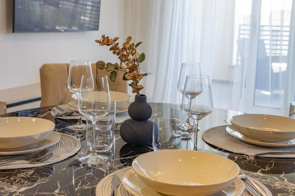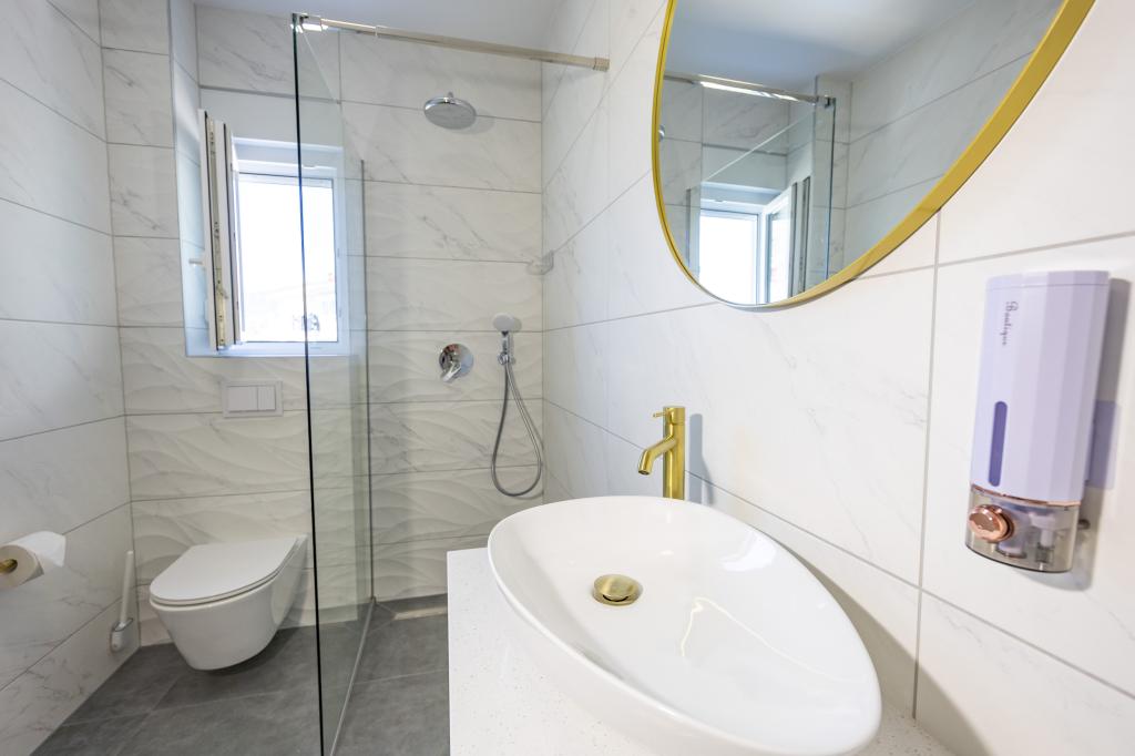 Each apartment exudes modern design and newly renovated interior. In the spacious living room, decorated with tasteful furniture and contemporary details, you will feel right at home. The open concept naturally connects the living room with a fully equipped kitchen, where elegant countertops, quality appliances and all the space you need to prepare your favorite meals await you. The living area opens onto a pleasant balcony - an ideal place for morning coffee or evening relaxation with a glass of wine and an unforgettable sunset over the Adriatic. Each apartment has two comfortable bedrooms with double beds, equipped with soft bedding and plenty of storage space, one modern bathroom and an additional toilet. The apartments are air-conditioned and fully equipped: TV/SAT, internet, washing machine, dishwasher, coffee maker and everything you need for a pleasant and carefree stay.