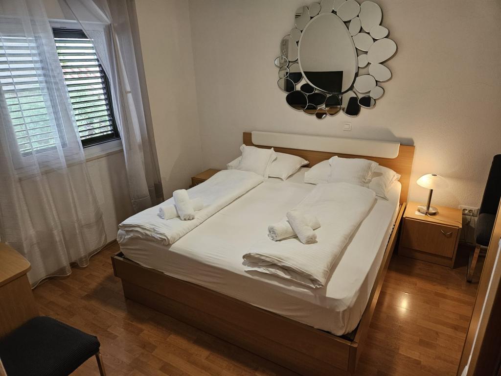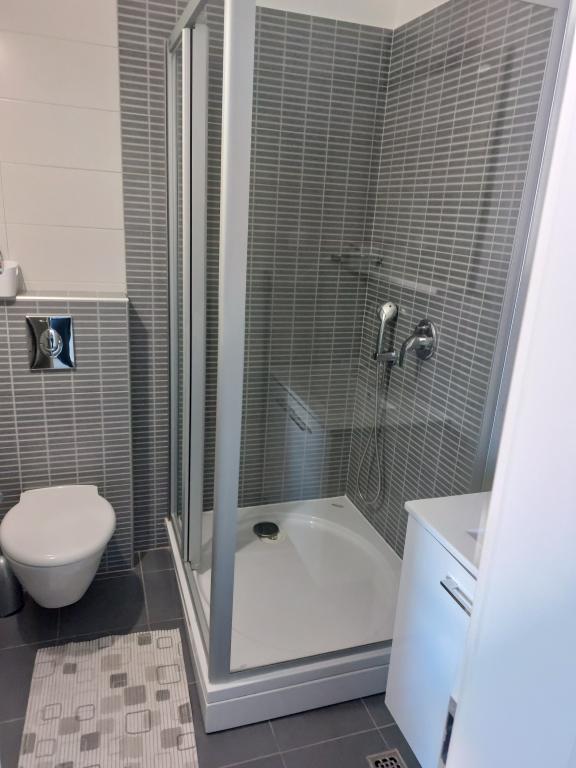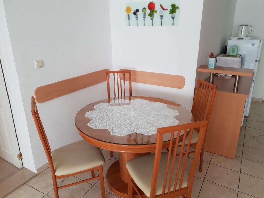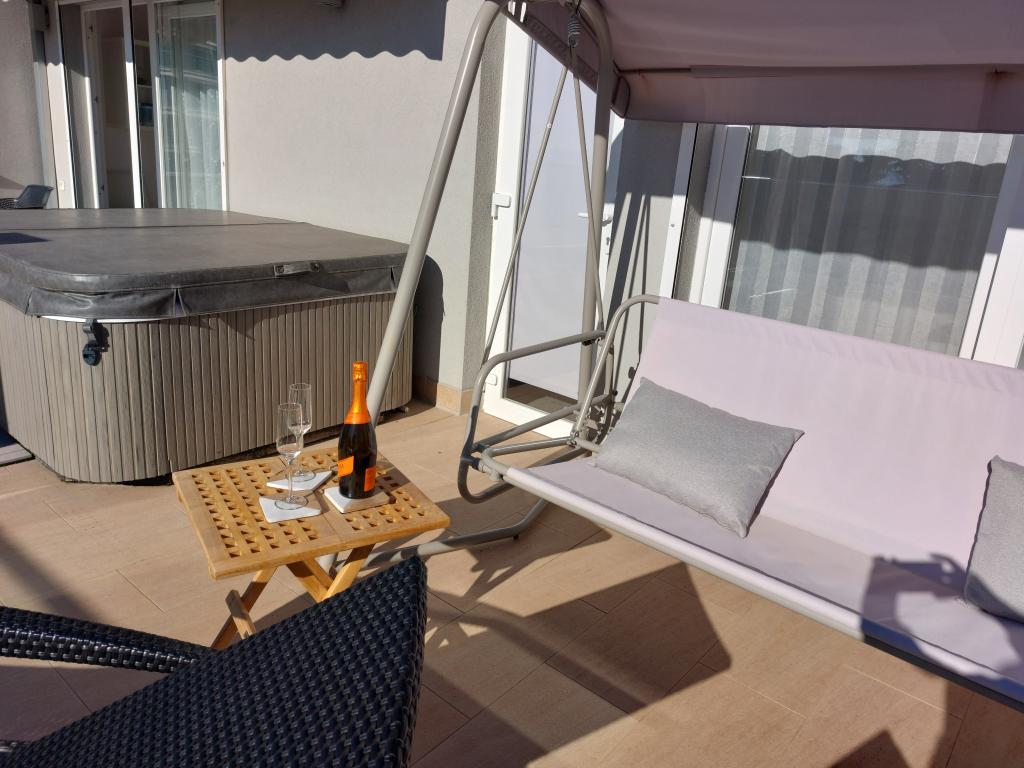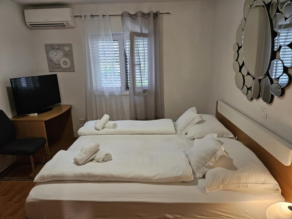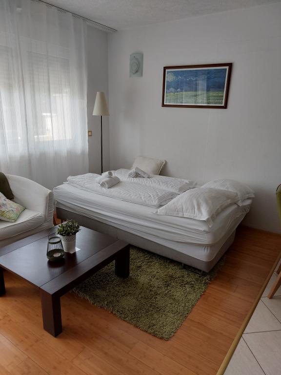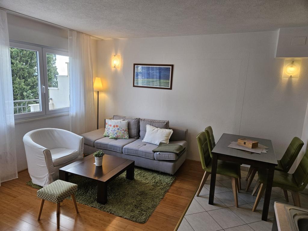 Our apartments are modern and fully equipped to make your stay as comfortable and carefree as possible. Each apartment includes an iron and ironing board, hairdryer, filter coffee maker, kettle, microwave. Guests also have access to complete utensils for preparing and serving food. All accommodation units have a flat-screen TV, free Wi-Fi, indoor and outdoor seating and relaxation areas. The accommodation units are air-conditioned. Parking must be reserved in advance due to the limited number of parking spaces within the facility. Fresh bed linen and towels await you upon arrival, which are changed as agreed. A baby cot, with prior notice, is available in this facility and is free of charge. Within the facility there is a shared courtyard with seating furniture, surrounded by Mediterranean plants - an ideal place to relax. The facility is located in a quiet area, in the second row from the sea, just a 2-minute walk to the beach and a ten-minute easy walk to the center.