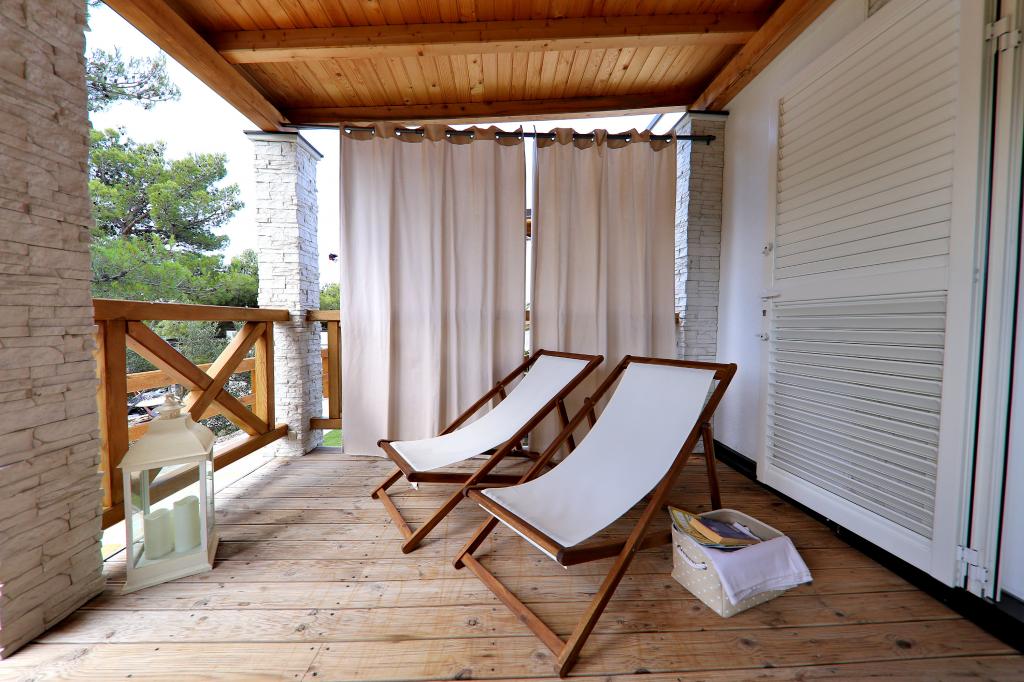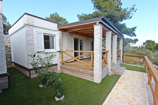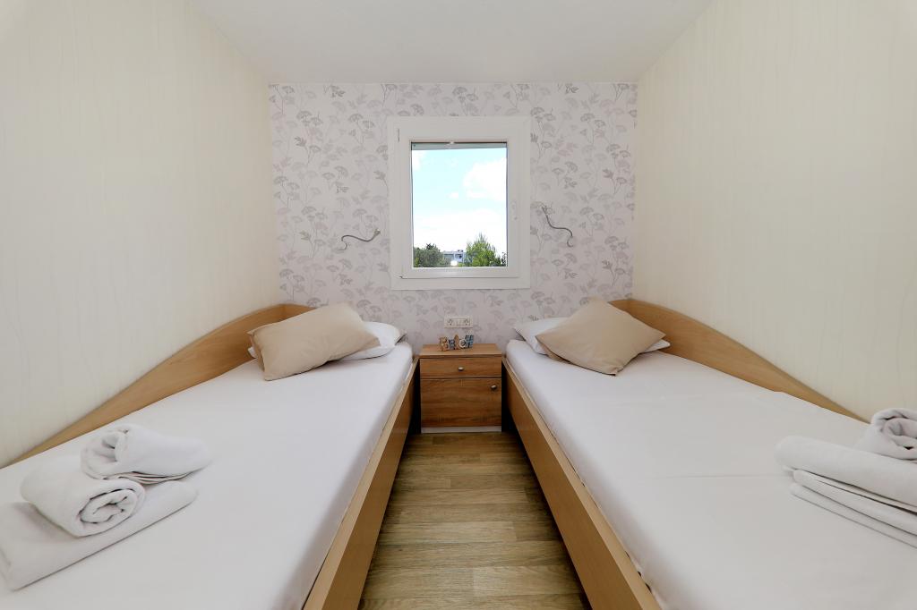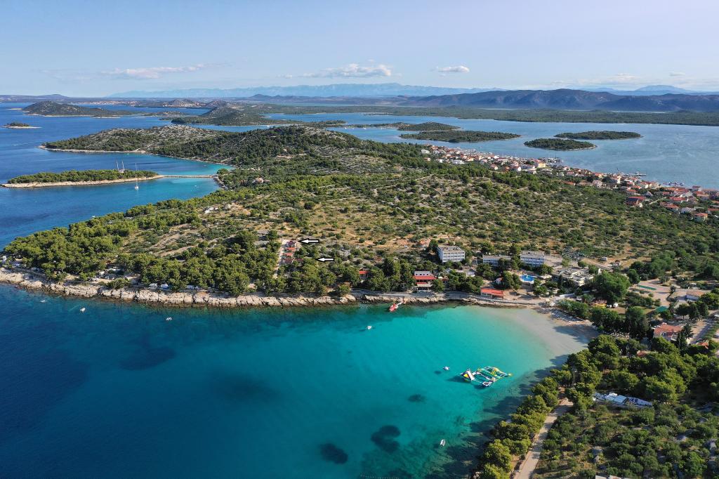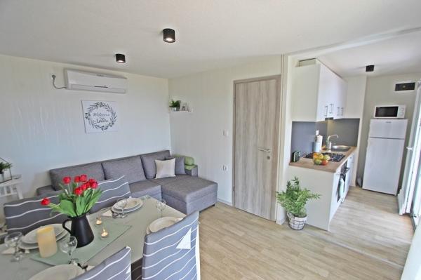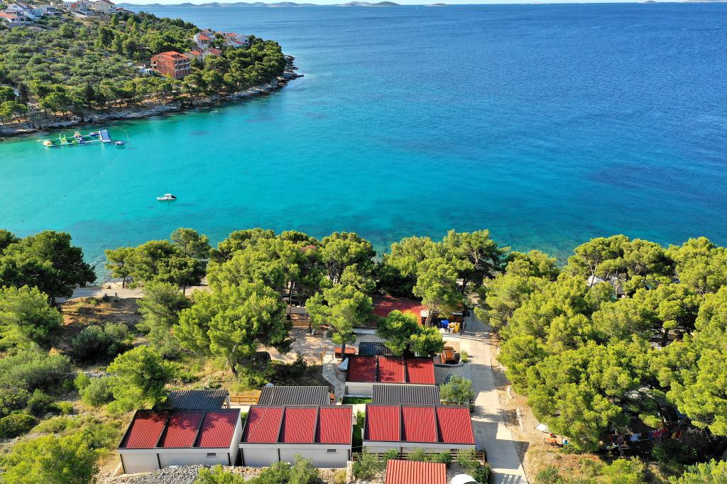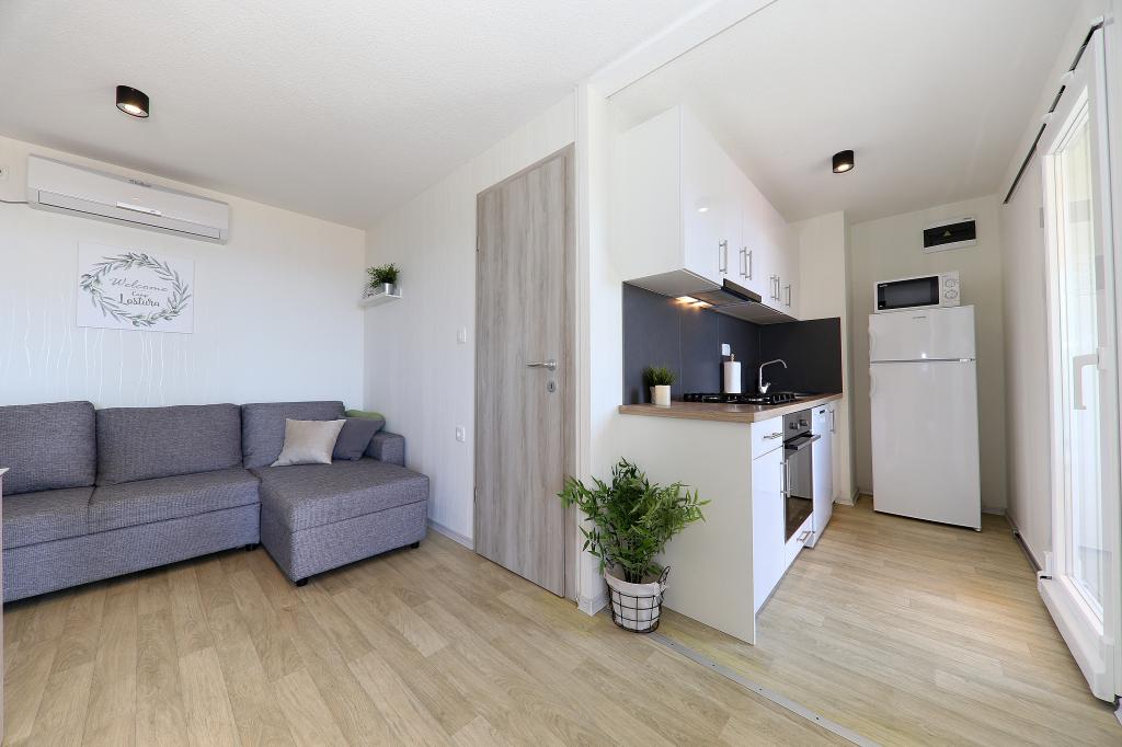 Mobile homes in the Campsite Lostura are located near one of the most beautiful beaches in the Adriatic, Slanice !. The mobile home is located only 30m from the sea and 200m from the sandy beach Slanica. The house has 40m2 20m2 terrace. In the house there are two bedrooms, one with a double bed (160x200), and a room with two separate beds (80x200). In the living room is an angular set which can be used as an extra bed for one adult or two young children. The kitchen is fully equipped with all the necessary appliances (fridge with freezer, oven, microwave, dishwasher, kettle, kettle, coffee maker). Bathroom with shower, washing machine, hair dryer, toiletries. In the living room there is a TV with satellite receiver, free internet, air conditioning and heating. On the terrace there is a dining table with chairs and a sun lounger and a wonderful view of the Kornati islands and the beach of Slanica. Parking place is located near the house