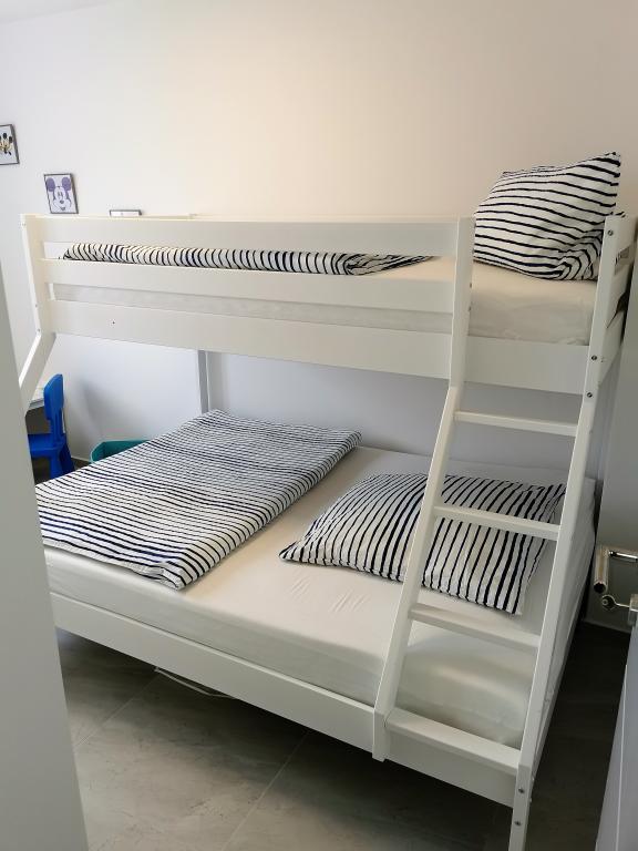 LE apartment equipment 87m² of living space • Parking next to the house • Complete bedding • Baby travel cot including mattress 60x120cm • Large bathroom with floor-level shower • Washing machine + drying rack • Hairdryer • Towels The open living room is equipped with a sofa bed, satellite TV and Smart TV • Dishwasher • Oven • Electric stove • Refrigerator with freezer compartment • Coffee machine with thermos jug • Toaster • Kettle • Heaters for baby bottles and porridge • For our youngest guests we have a high chair with children's dishes • Guest toilet • Air conditioning on each floor • Free WiFi throughout the house • Vacuum cleaner • 2x bicycles • Electricity and water included Outdoor space beautiful covered terrace with an open wooden terrace, ideal for children and dogs, fully fenced • Garden furniture with cushions • Sun loungers with cushions • Parasol and awning • Magic solar shower • Barbecue fireplace • Sand toys • Jacuzzi boat • Buoy 150 meters from the house