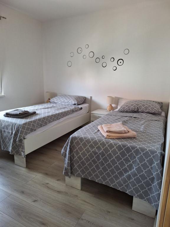 The apartments are located in Nin - the settlement of Ždrijac in a quiet area 150 m from the beach, i.e. a 5-minute walk, and 400 m from the town, i.e. a 10 to 15-minute walk along the pedestrian path. apartment 1... consists of 3 rooms, one of which is equipped with a TV and one room (living room equipped with a TV and a separate toilet (with a washing machine) and an extra bed, kitchen equipped with a dishwasher, refrigerator with freezer, microwave oven, kettle, bathroom with walk-in shower and hallway and terrace, while there is a reserved parking space in the yard. The apartment is registered for 6 people. apartment 2... consists of 2 rooms, one of which is equipped with a TV and an extra bed, and a kitchen, bathroom and balcony. There is a parking space in the yard. The apartment is registered for 4 people - the apartments have high-speed internet and TV (Netflix...) A 1 is priced higher if there are more than 4 people. A2 is priced higher if there are 4 people.
