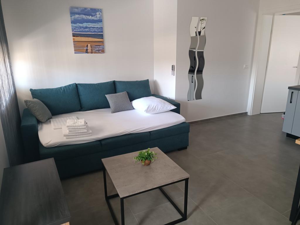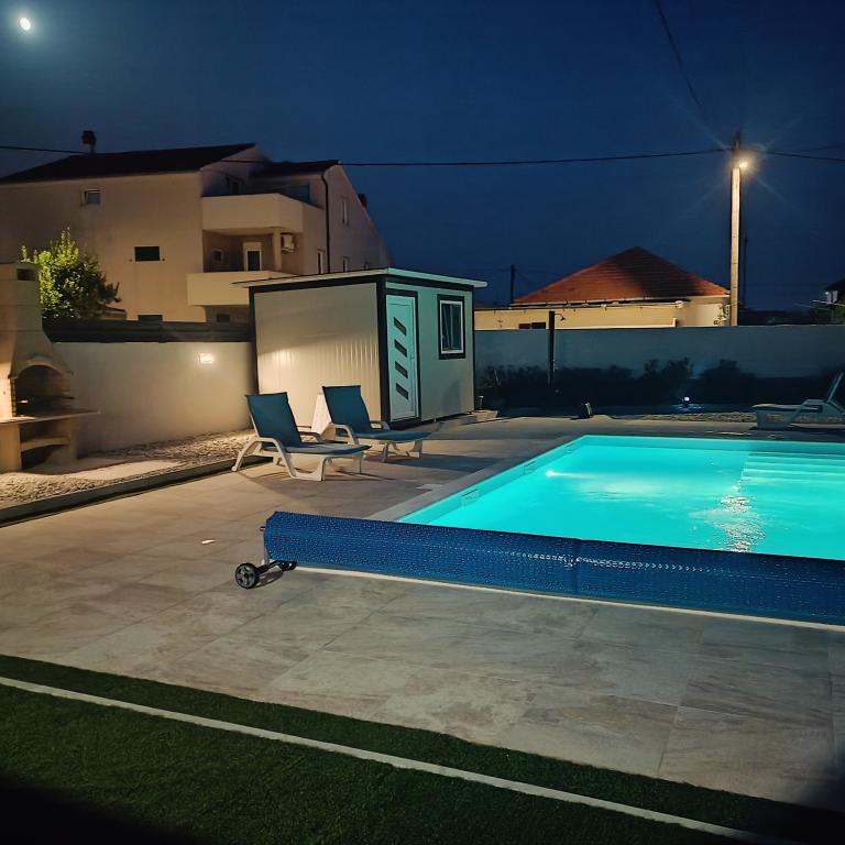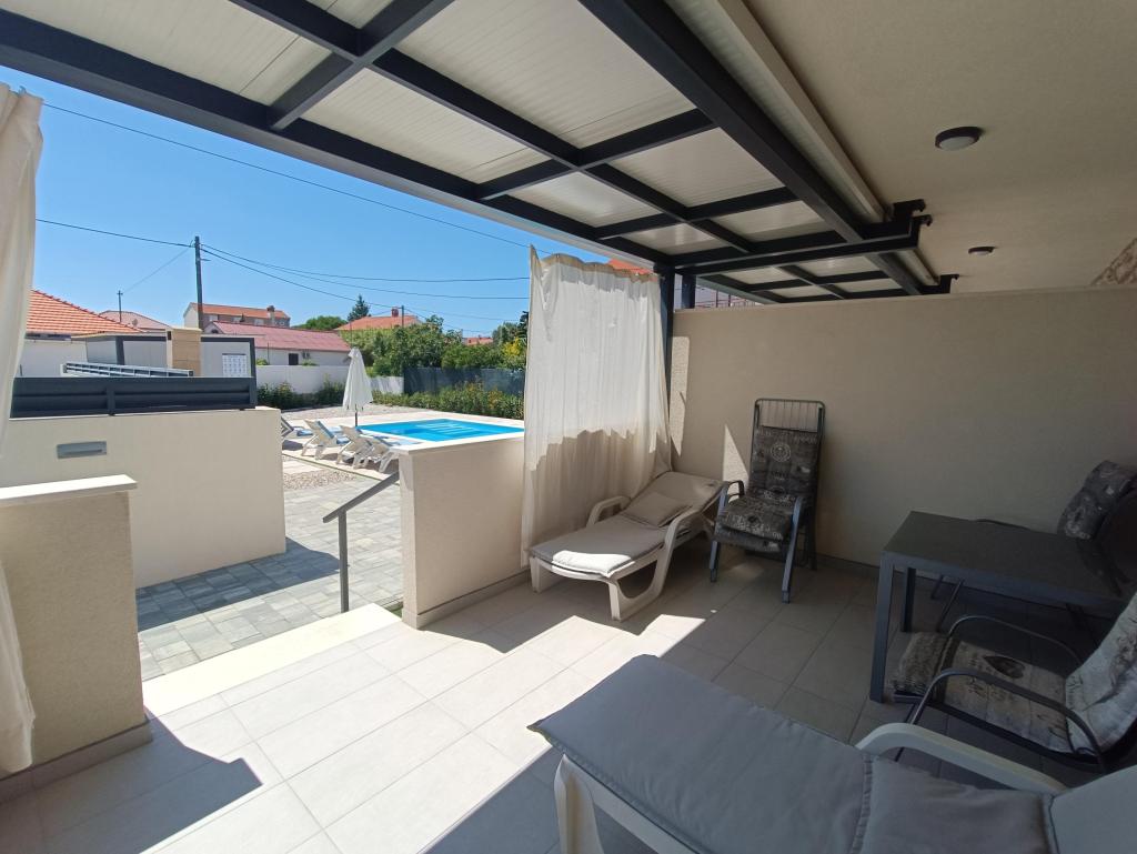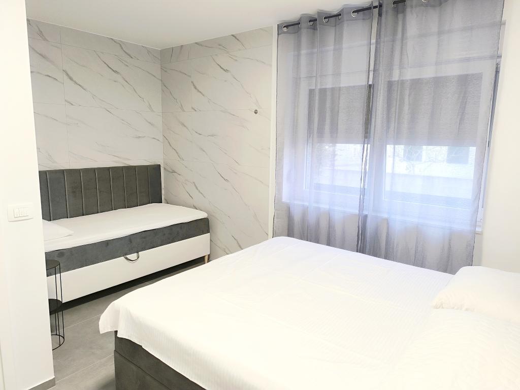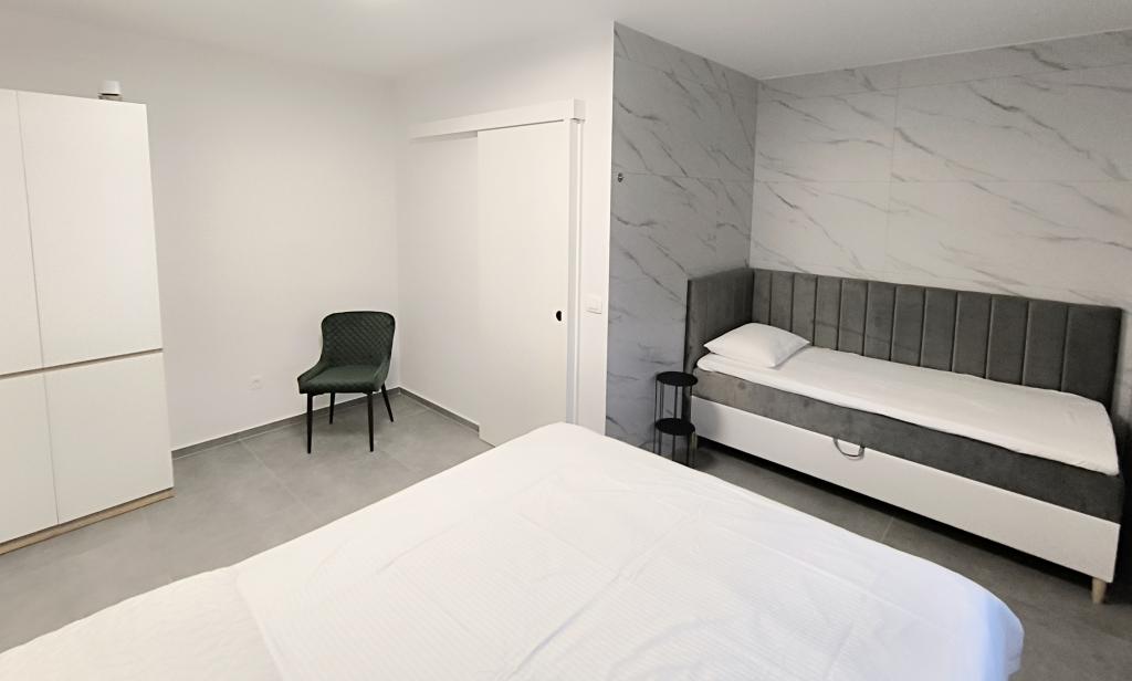 Heated pool (closed 15.10. 2025 - 1.5. 2026) Welcome to Royal Place Apartments, apartments located in the charming royal town of Nin, just 16 km from the historic city of Zadar. We offer two luxurious apartments. One bedroom (family room, double bed + single bed) and two bedroom on the ground floor in a quiet location, just 200 meters from the picturesque seaside promenade, local restaurants and the town center. The beach is 900 meters away. The large floor of the building includes a peaceful, fenced courtyard filled with lush Mediterranean plants. In addition, there is a heated saltwater pool, a sunbathing area with deck chairs and umbrellas, an outdoor shower, a grill. The upper floor of the building does not have access.