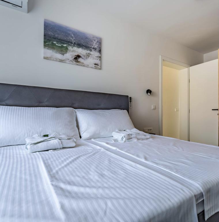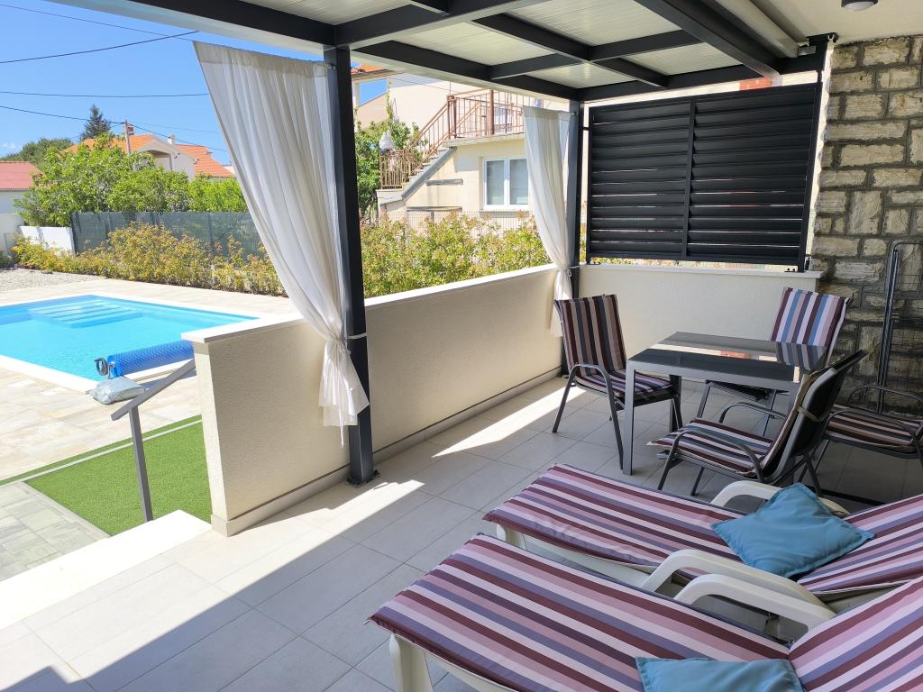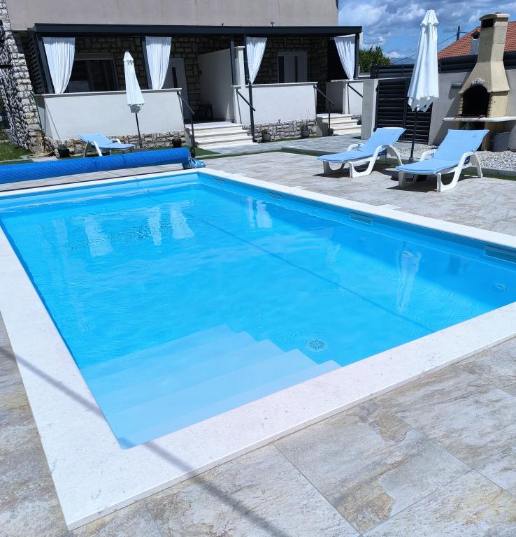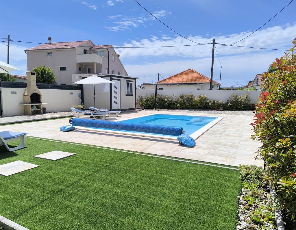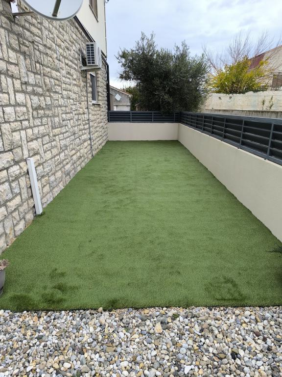 Heated pool (closed 15.10. 2025 - 1.5. 2026) Welcome to Royal Place Apartments, apartments located in the charming royal town of Nin, just 16 km from the historic city of Zadar. We offer two luxurious apartments. One bedroom (family room, double bed + single bed) and two bedroom on the ground floor in a quiet location, just 200 meters from the picturesque seaside promenade, local restaurants and the town center. The beach is 900 meters away. The large floor of the building includes a peaceful, fenced courtyard filled with lush Mediterranean plants. In addition, there is a heated saltwater pool, a sunbathing area with deck chairs and umbrellas, an outdoor shower, a grill. The upper floor of the building does not have access.
