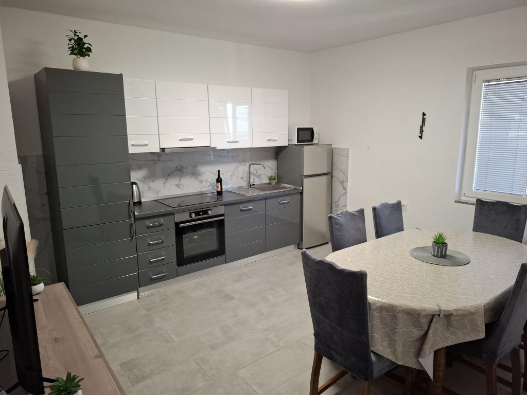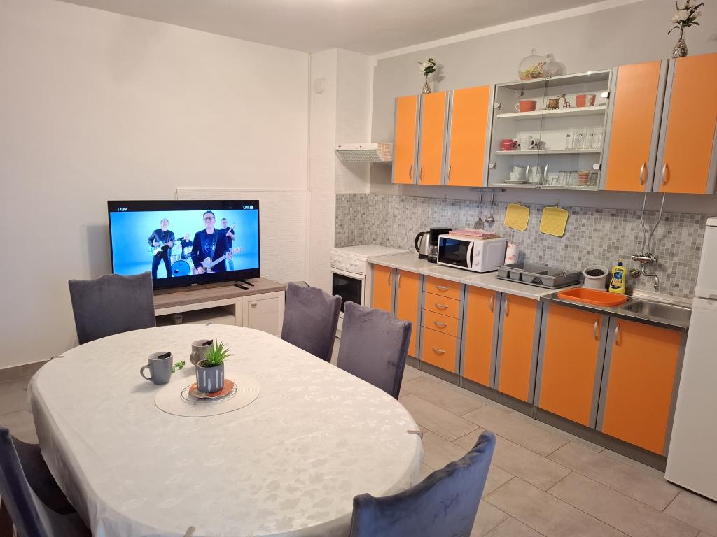 Apartments Tomislav is located in the town of Vrsi in a quiet and peaceful area, ideal for vacation, with a wonderful view of the sea, air-conditioned apartments are 130m2, 100m2, and 90m2, spacious and large, with large terraces for relaxing gatherings, come and enjoy your vacation.