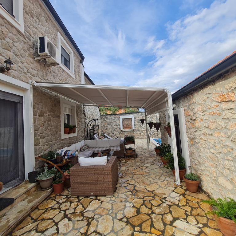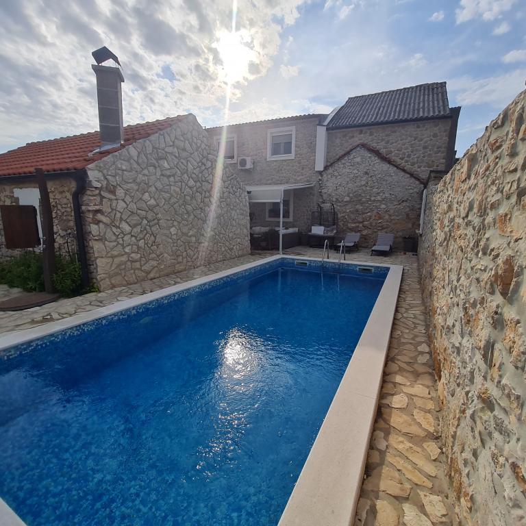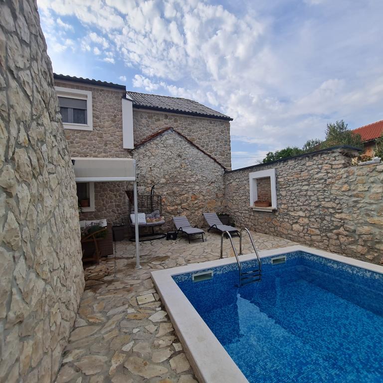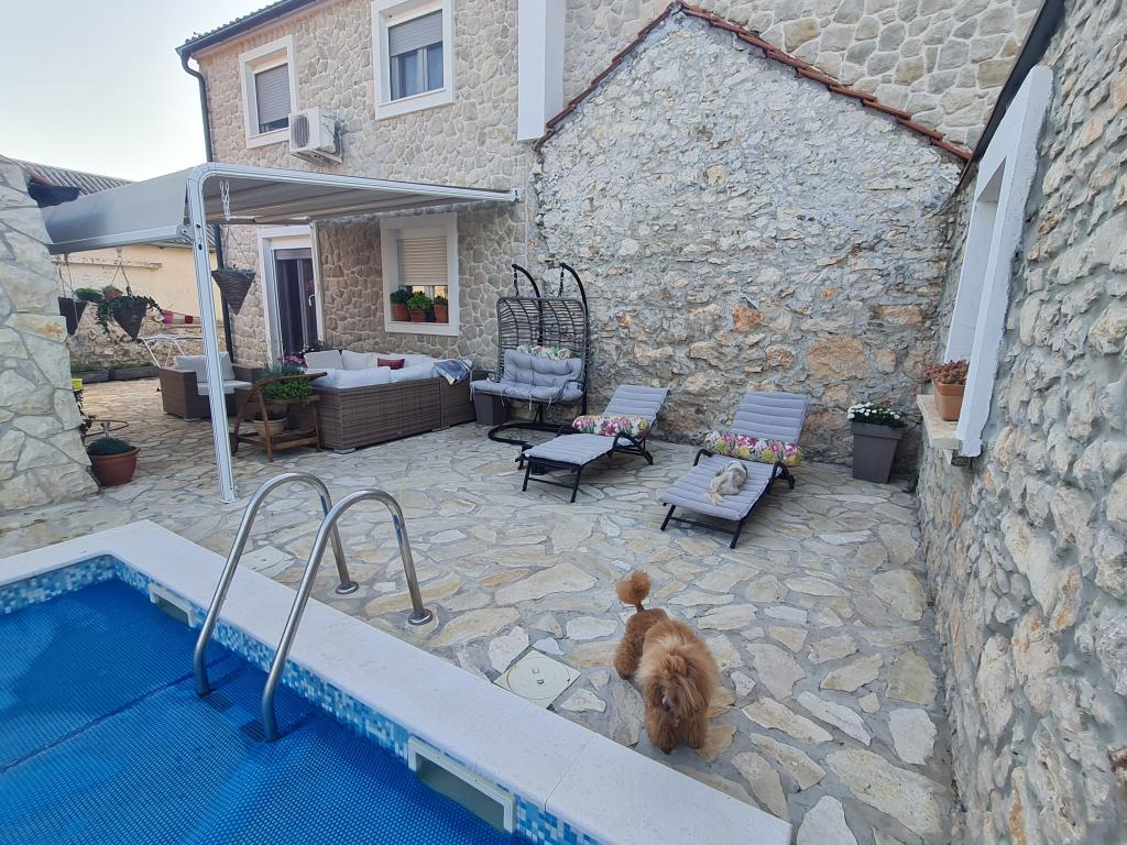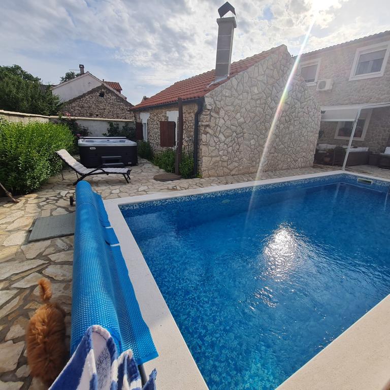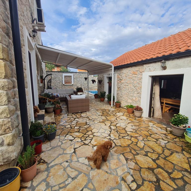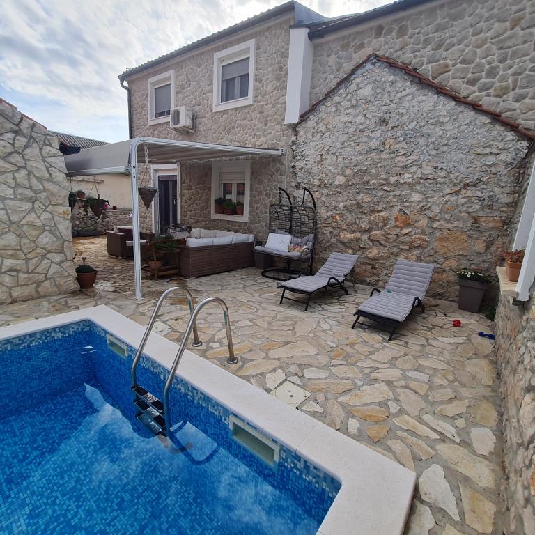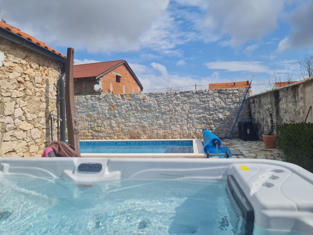 Completely renovated family house in the suburbs of Nin, place Nin apartments. Beautifully and harmoniously decorated, with 3 bedrooms. . Two rooms with double bed, one room with 3 beds. . In the living room corner sofa and armchairs. Within the house there is a tavern built in stone for pleasant friends and family gatherings. The courtyard is intimately surrounded by walls where you have complete intimacy. You also have at your disposal a heated pool, size 8x3.5 and jacuzzi for 5 people 2x2