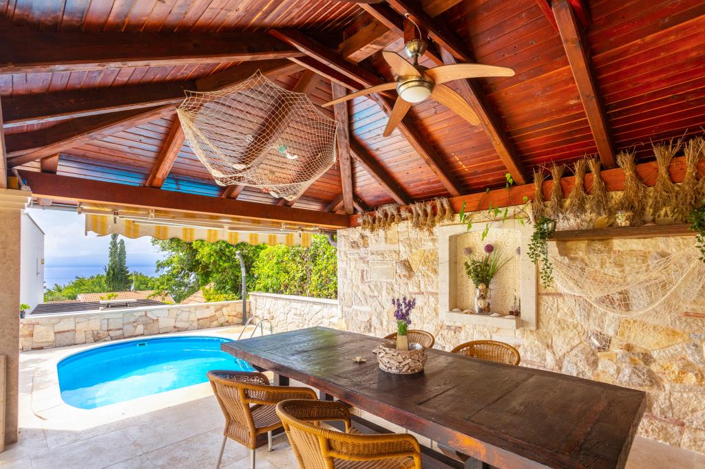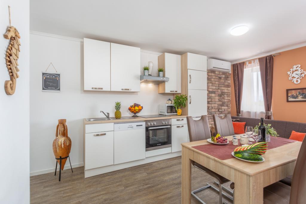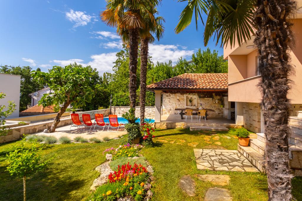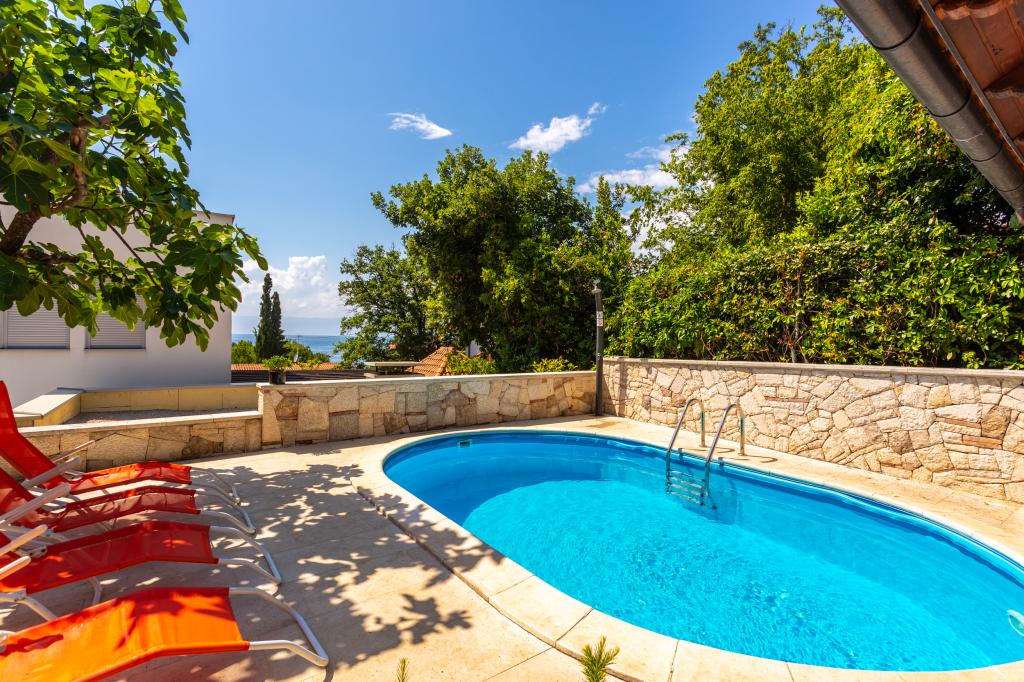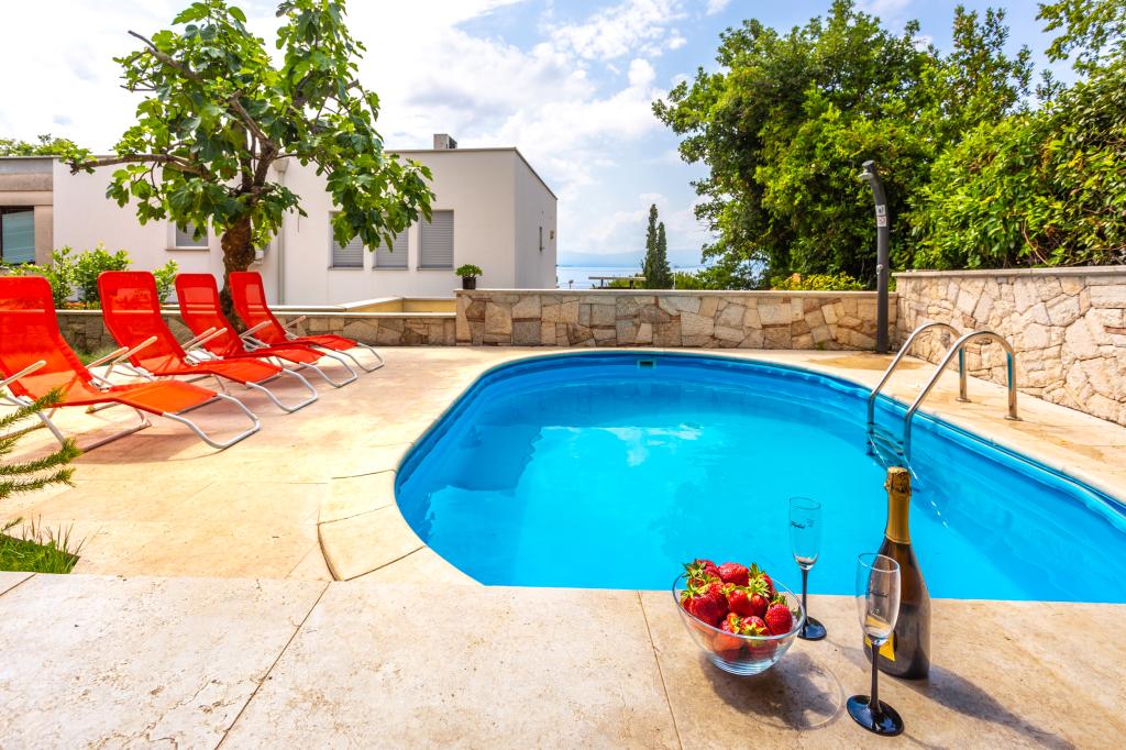 On one of the most beautiful islands of the northern Adriatic, on the magical island of Krk, the undiscovered beauty of nature awaits you. Sandy beaches, olive groves, caves, promenades, hiking and biking trails, authentic Moon Plateau, horseback riding... Lapped by the waves of the Adriatic in the shade of rich vegetation and with a view that takes everyone's breath away, Njivice is located. If your philosophy is that vacation is for hedonism, you are in the right place. Choose one of our two apartments and enjoy the peace and quiet of family accommodation. Close to a large beach, the sea is clean. Attractive location with lots of content for all ages (beach cocktail, horseback riding, zip line). Close to shops, center, restaurants. Secured parking, air conditioning, wifi. Sea view, swimming pool in the garden with palm trees and outdoor kitchen with grill. Choose one of the two apartments today and feel at home. We respect your privacy and are always at your service.