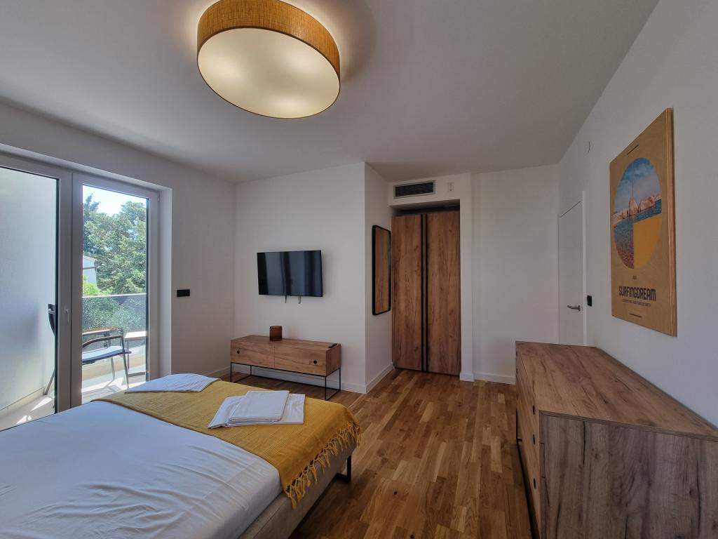 2 luxury apartments of 100 m2 each are located on the ground and first floor of a modern building and have 2 bedrooms with balconies, a large living room with a sofa bed and with a fully equipped kitchen ( the kitchens have coffee maker, microwave, dishwasher, hob and refrigerator ), 3 bathrooms in each apartment and a large terrace with table and barbecue.They are also equipped with a washing machine and iron with ironing board. There is a communal swimming pool with a small garden and parking available by the building.They are located in a quiet part of Novalja, but only a 2-minute walk from the beach and promenade. It is a 20-minute walk to the center of the town, and 10 minutes to the nearest store and restaurant. The apartments are designed for demanding guests - they are beautiful and comfortable, premium type, equipped with modern appliances and high quality furniture, and the decorative elements are handmade.