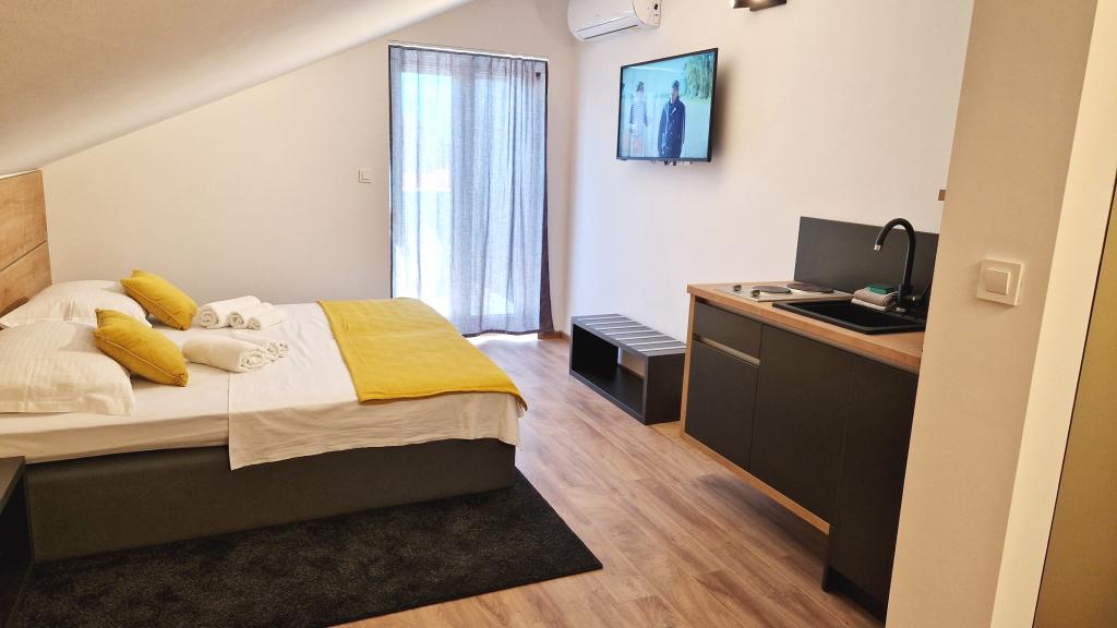 Enjoy the comfort and elegance of our modernly equipped rooms and high-class apartments. All accommodation facilities are categorized with 4 stars and equipped according to hotel standards with carefully selected furniture and quality equipment. Ideal for business trips, family vacations or summer relaxation - your perfect stay in Novalja starts here! I 4 stars - confirmation of quality I Modern equipment and design I One-bedroom apartments I Two extra beds in the spacious living room I Free Wi-Fi I Private parking Book now and experience the ultimate comfort! NOTE: Extra beds in the living room can only be used by children under 12 years of age.