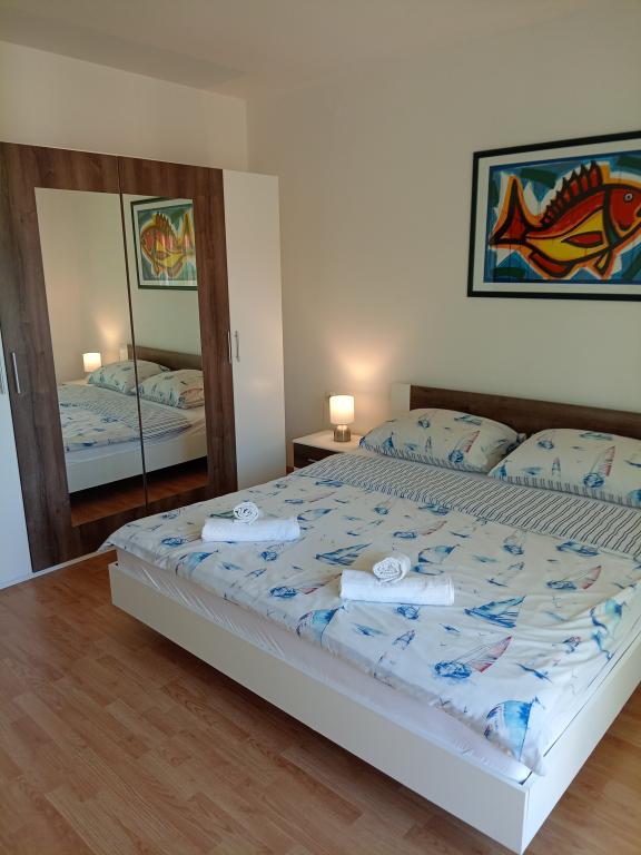 The apartment is located in a quiet environment on the first floor of a family house. It is fully and modernly equipped. It consists of a kitchen, dining room, 3 bedrooms and 2 bathrooms. It is only a 5-minute walk to the city center and a 10-minute walk to the city beach. In addition to 2 balconies and a terrace, guests also have a yard with a barbecue and a parking lot for 2 vehicles within the building. A stay shorter than 3 days is charged 30% more expensively.