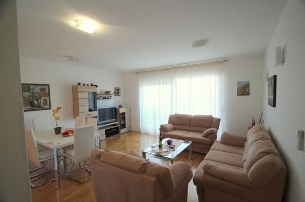 Modern furnished apartment situated in a quiet suburb, close to the sea. The apartment consists of 2 bedrooms, kitchen, bathroom, living room, dining room (with 2 extra beds) and a balcony with sea view. The apartment has a fenced parking space. The building which houses the app has a nice yard and the front of the building is multi-purpose court and a small park for a game room and children.