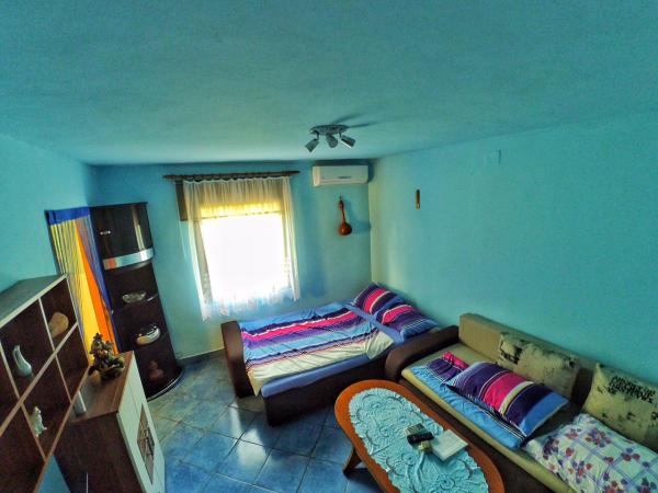 Apartment / holiday home is located in the Croatian region of Istria, near Umag, Umag 17d. The building is a detached house 50m ^ 2 with a fenced yard of 1500m ^ second The largest number of people for the facility's seven (5 basic beds and 2 extra). Distance from the beach 2500m, from the shop 500m, from restaurant 700m, post office 2500m, from doctors and doctors 2500m, from Aqua Park Istralandia 3000m. Equipment: 2 air, 2 LCD TV, double bed (2 persons), 2x sofa (maximum 2x2 persons to sleep), cradle bed, living shelf, closet, desk, Wi-Fi internet, radio / CD, iron and ironing board, vacuum cleaner, 2x fridge (one freezer, one without) and stove (electric and gas), table (5 persons), deep fryer, pressure economist pot, plus all the necessary vacuum food, toilet (indoor and outdoor) , shower (indoor and outdoor), a washing machine, pergola (12 people), fireplace grill, covered garage. All equipment is new. Additional payment for small pets is 5 € / day, 7 and 8 months.