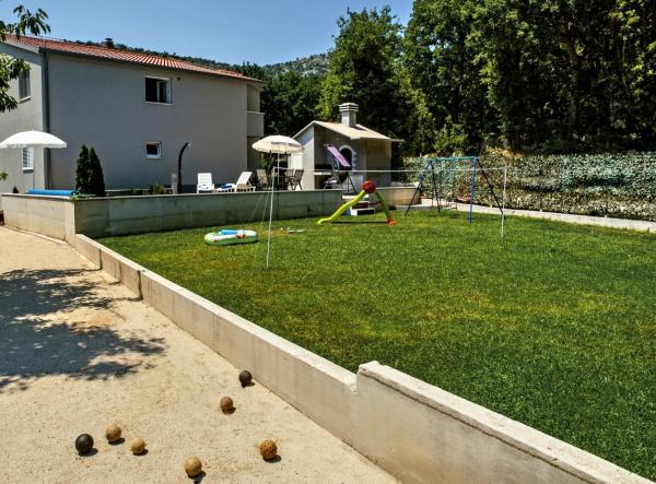 Residential tax is included in price.You would be only guests in this house. You have a private swimming pool, a room with exercise equipment, outdoor, traditional barbecue, playground for bowling and lawn with swing. Linens and towels are also included. This is an excellent choice for families, elders, adventurers and groups of friends because the location is in a quiet environment and is well equipped and offers plenty of space, and is near the town of Omis (5km), river Cetiina where you can try out rafting, zip line, canyoning, free climbing or just enjoy the beautiful environment that offers a river canyon. The city of Split with its old part, UNESCO Diocletian\s Palace that you see is only 21 km away, or half an hour drive, you can always find something for every taste