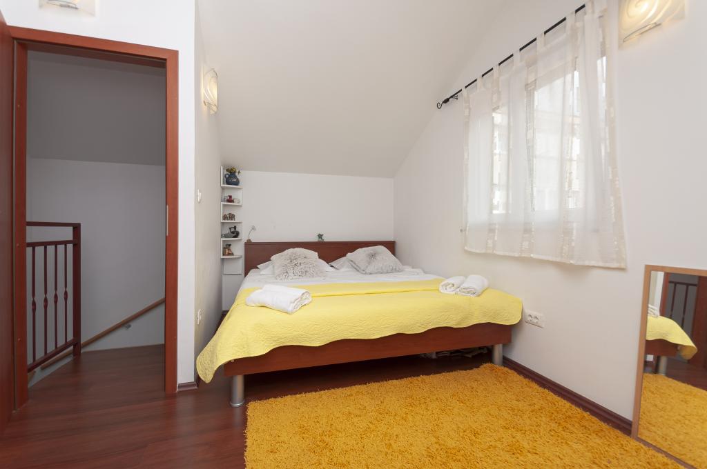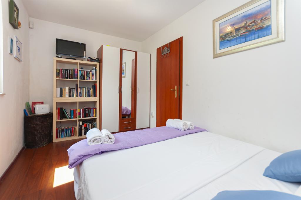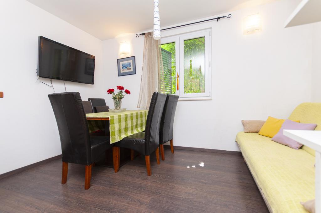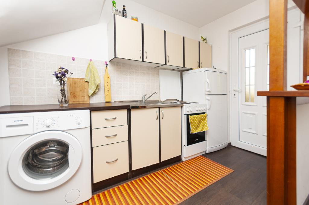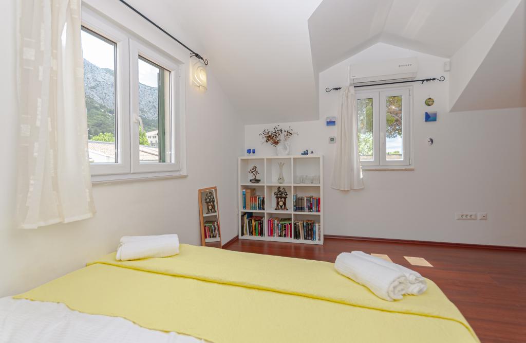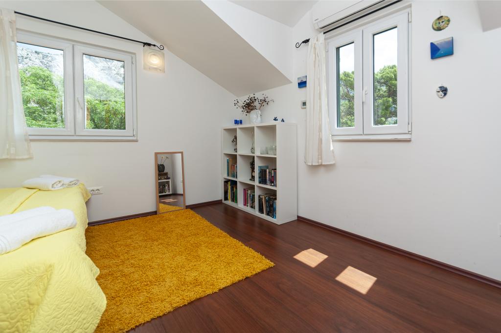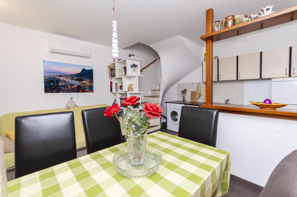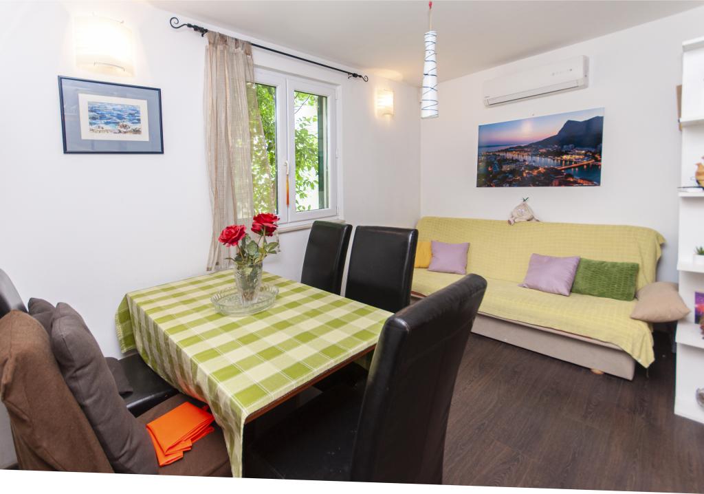 Detached house on two floors in the center of Omis, in a quiet environment, without noise. The house is only thirty meters from the sandy beach and the center of Omis. All facilities are just a few minutes walk (shops, restaurants, bank, town market, fish market ...) On the ground floor there is a kitchen with living room and dining room. Upstairs there are 2 double bedrooms and a bathroom. The apartment is equipped with air conditioning, TV, WIFI, washing machine. There is a seating area on the covered and intimate terrace. The apartment is for 4 people plus 1 extra double bed.