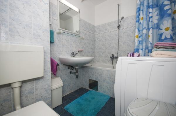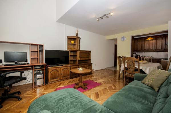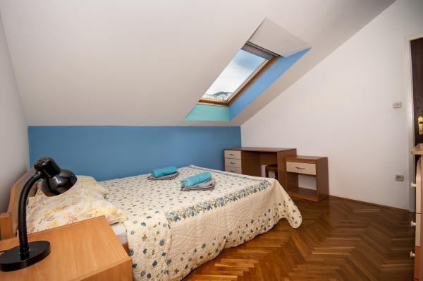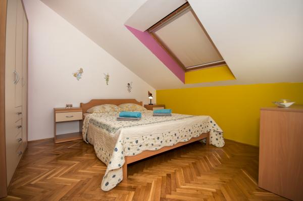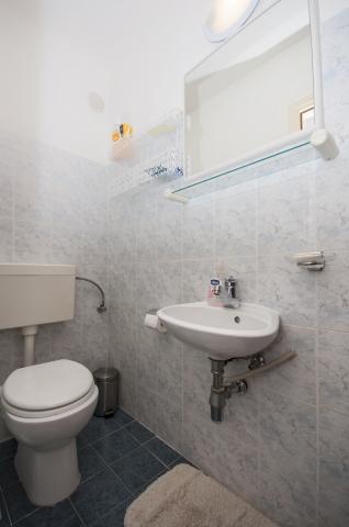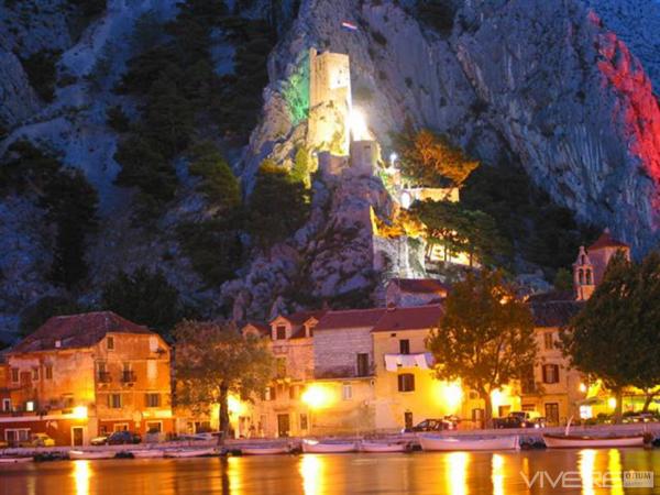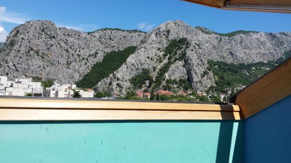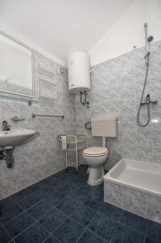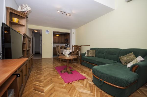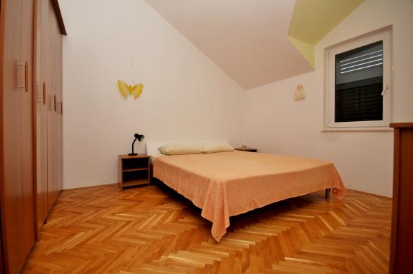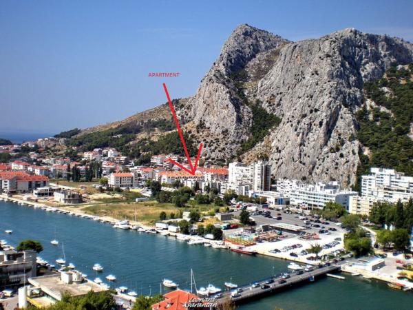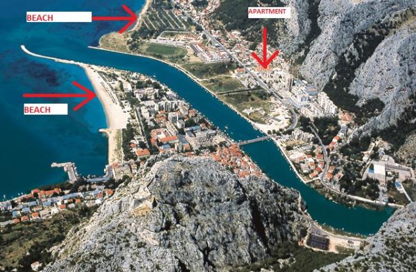 Fully furnished apartment is located in Omis, in the building, on the 3rd floor. The apartment is on two floors, the lower floor has a living room, kitchen, large bathroom, a small toilet and a large room with a double bed. A small balcony is on this floor. On the second floor is a bathroom and two bedrooms. The apartment has three air conditioning, wi-fi, TV, washing machine, dishwasher, electric kettle, microwave.