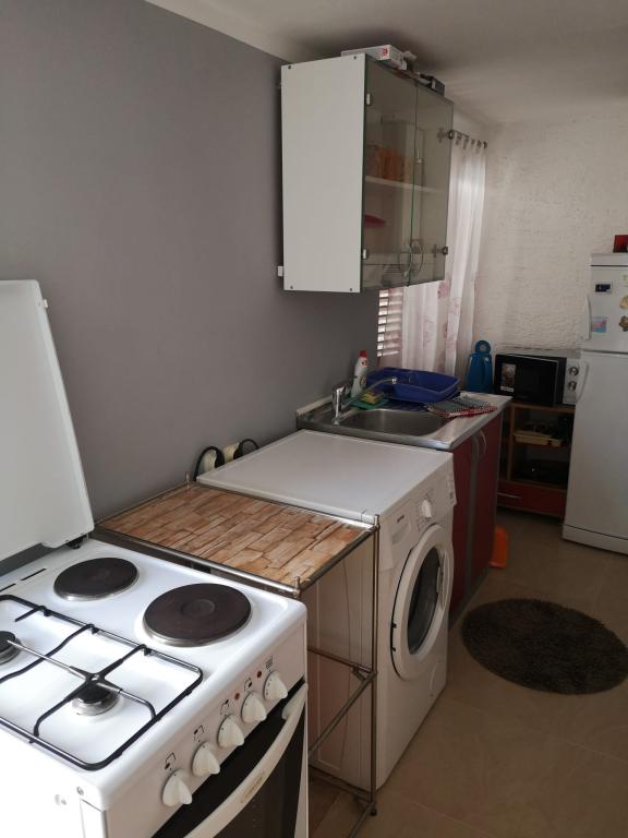 The apartment is located on a hill, a few minutes from the beach, which is accessed by quite steep stairs. The beach is quite wide, you can always find a shady place. In the evening you can sit on the terrace and admire the beautiful view of the sea. The proximity of traffic was not a problem. Great value for money. The apartments are clean, equipped with everything you need. The owner was very nice and helpful. He tries to make your stay as good as possible, giving advice. Air conditioning in two bedrooms, fan in the kitchen, washing machine in the bathroom - great. In the immediate vicinity there are 3 restaurants, 2 shops, 1 fruit and vegetable stand. All restaurants are worth recommending, but the best pizza is at Alfa. Bar and restaurant on the beach.