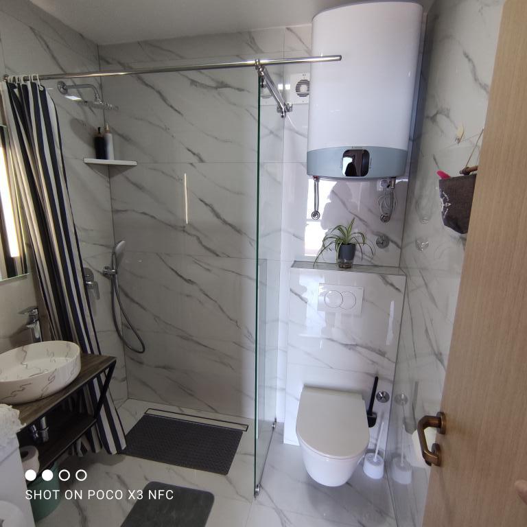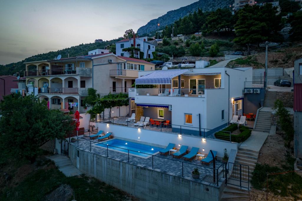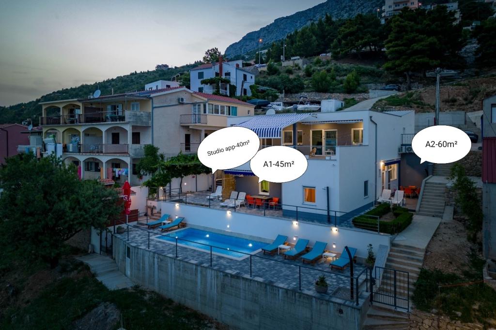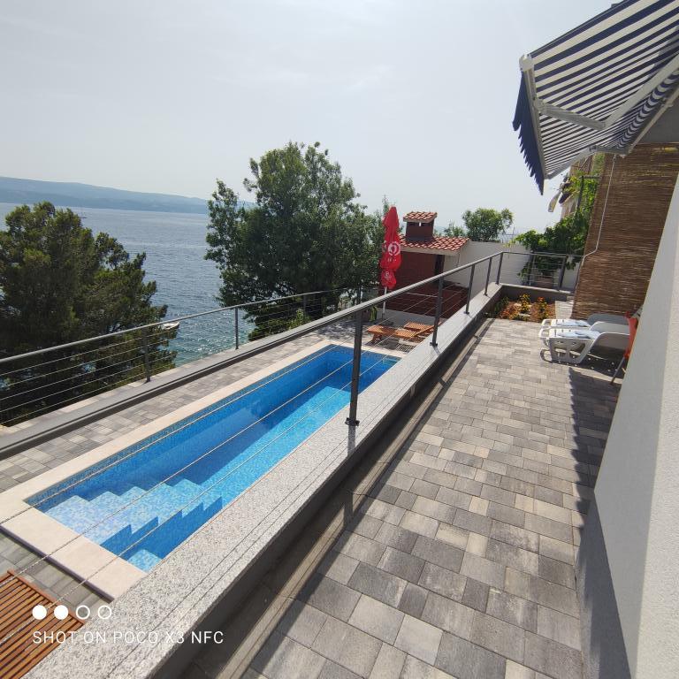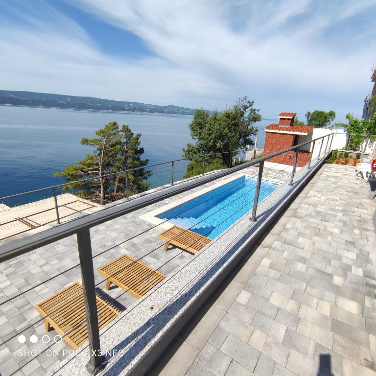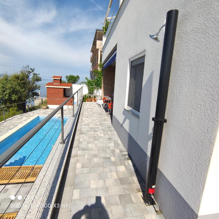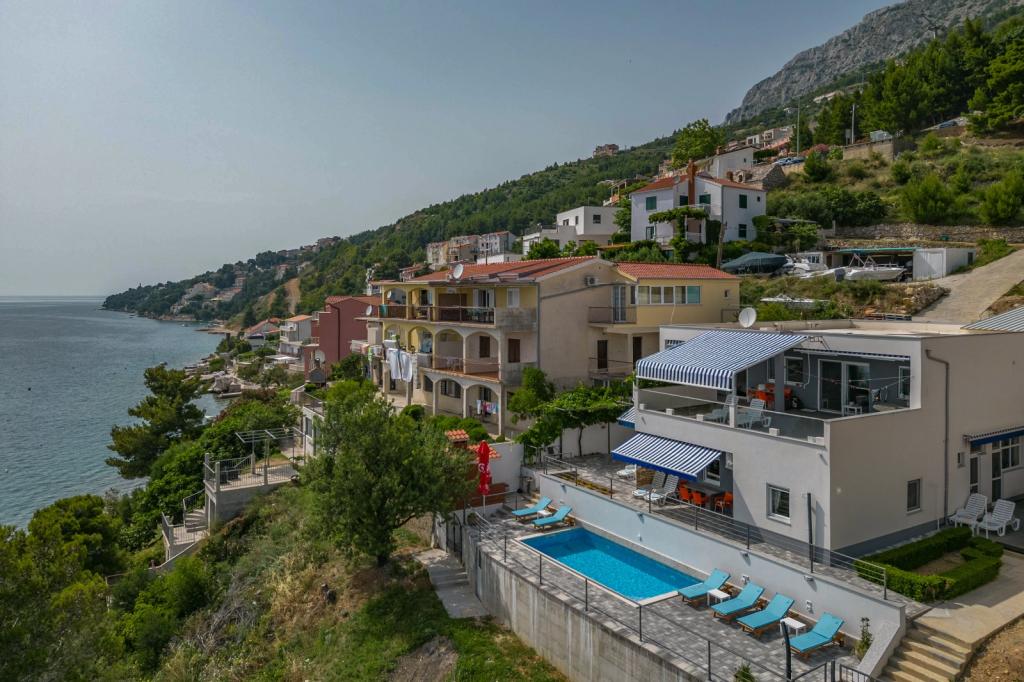I offer 3 apartments*** (new and modernly decorated) on the ground floor with a pool with hydromassage - heated/cooled + electrolysis (suitable for allergy sufferers). We are located in the small and quiet town of Čelina, 6 km from Omis towards Makarska. Only 20m from the beach (stairs), with a view of the sea and the island of Brač. If you like small beaches with natural shade, this is the right place for you. All are fully equipped with toasters, washing machines, etc. Each apartment has a separate/private entrance and terrace with sun protection + outdoor shower. Private road to the house + parking next to the house. Shops, restaurants, cafes within 800 to 1000 m. I'm sorry, but we don't accept pets! A1 45m2 - 4 persons - 2 rooms, 1 bathroom, 3AC + terrace 20m2 A2 60m2 - 4 persons - 2 rooms, 2 bathrooms, 3AC + terrace 20m2 Studio 40m2 - 2 persons - air conditioning + terrace 50 m2 Change of guests during the season is possible only on sundays! Possibility of additional person + 20€ night