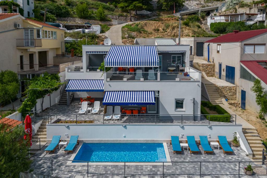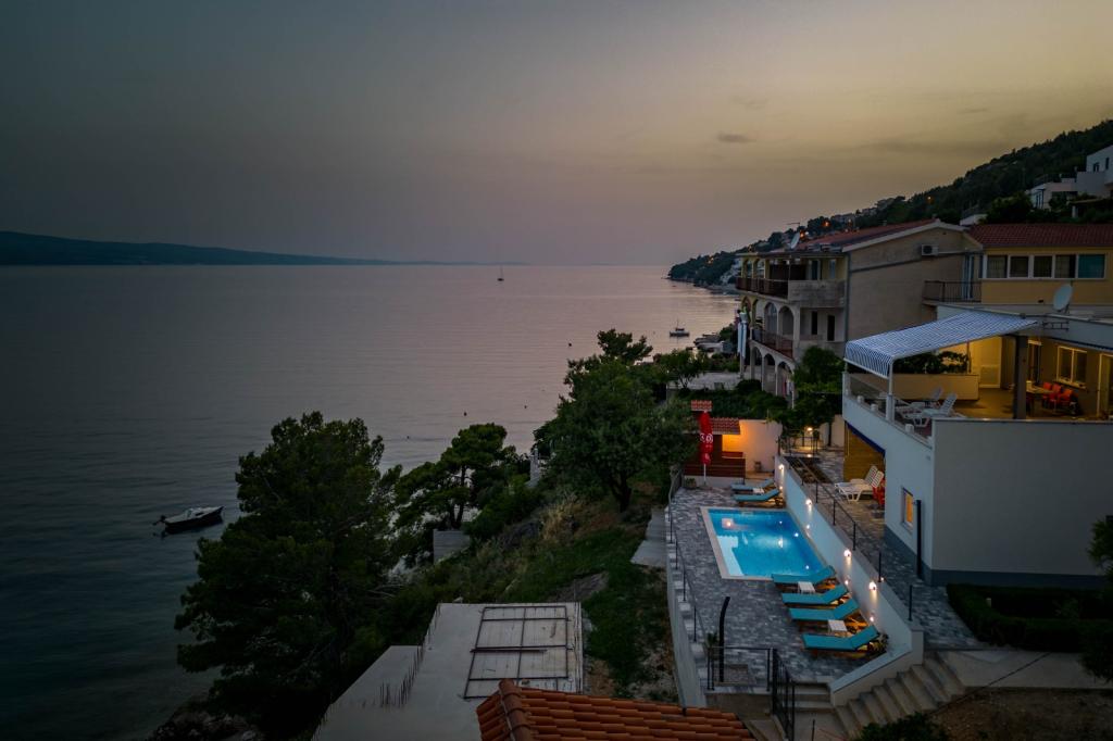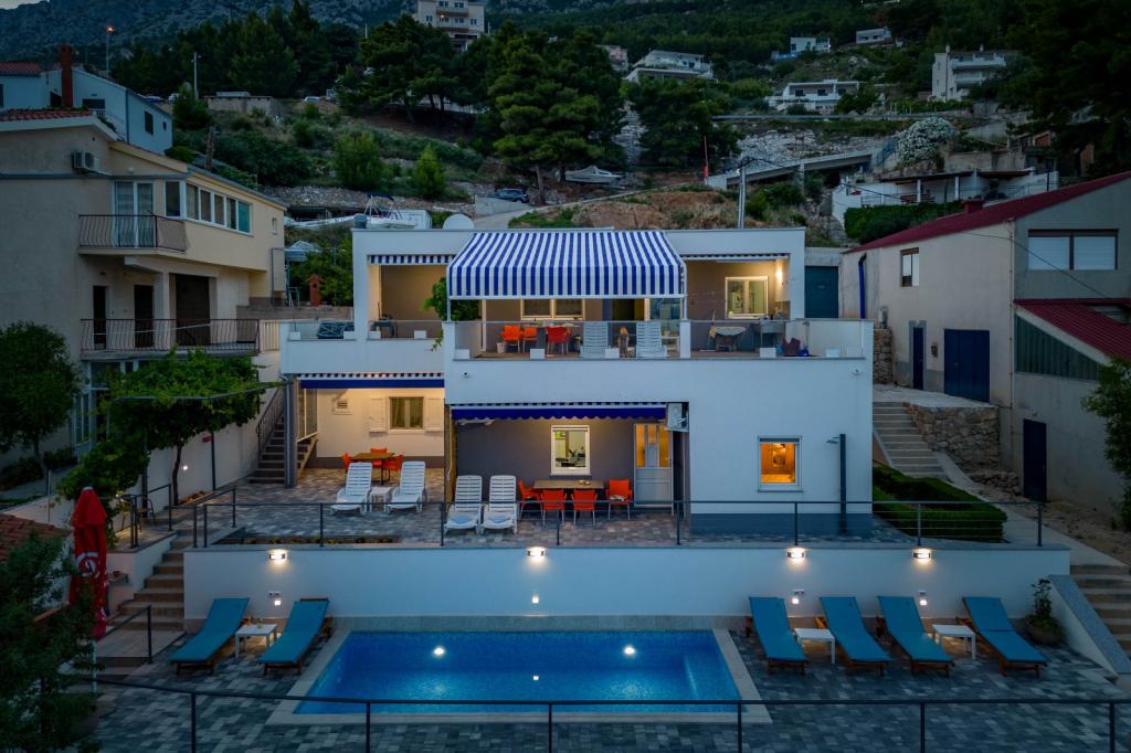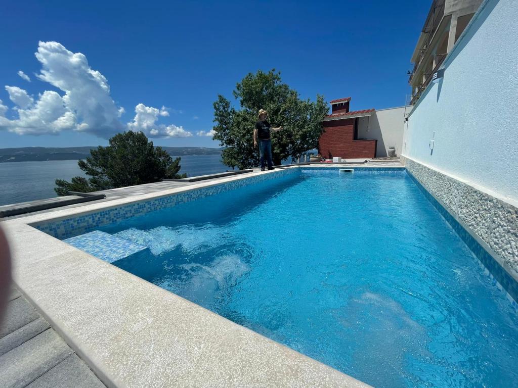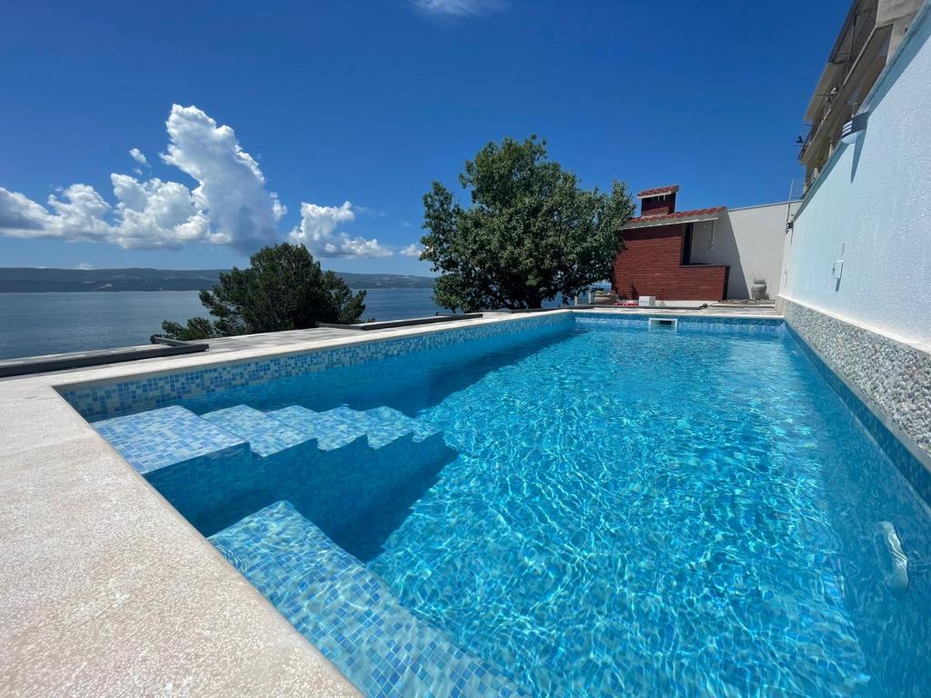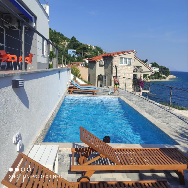 I offer 3 apartments*** (new and modernly decorated) on the ground floor with a pool with hydromassage - heated/cooled + electrolysis (suitable for allergy sufferers). We are located in the small and quiet town of Čelina, 6 km from Omis towards Makarska. Only 20m from the beach (stairs), with a view of the sea and the island of Brač. If you like small beaches with natural shade, this is the right place for you. All are fully equipped with toasters, washing machines, etc. Each apartment has a separate/private entrance and terrace with sun protection + outdoor shower. Private road to the house + parking next to the house. Shops, restaurants, cafes within 800 to 1000 m. I'm sorry, but we don't accept pets! A1 45m2 - 4 persons - 2 rooms, 1 bathroom, 3AC + terrace 20m2 A2 60m2 - 4 persons - 2 rooms, 2 bathrooms, 3AC + terrace 20m2 Studio 40m2 - 2 persons - air conditioning + terrace 50 m2 Change of guests during the season is possible only on sundays! Possibility of additional person + 20€ night