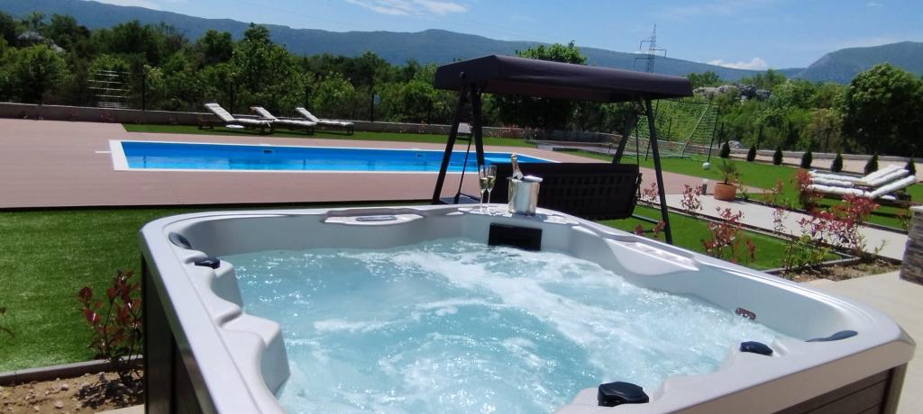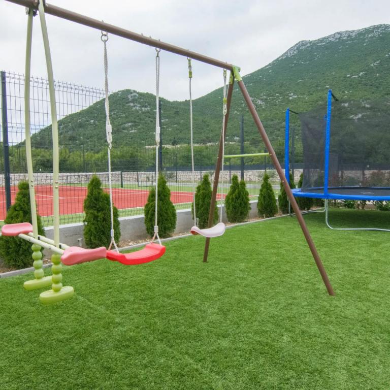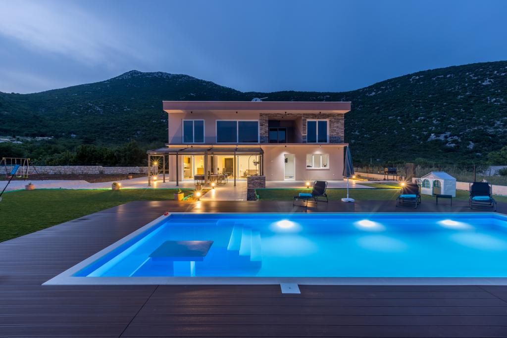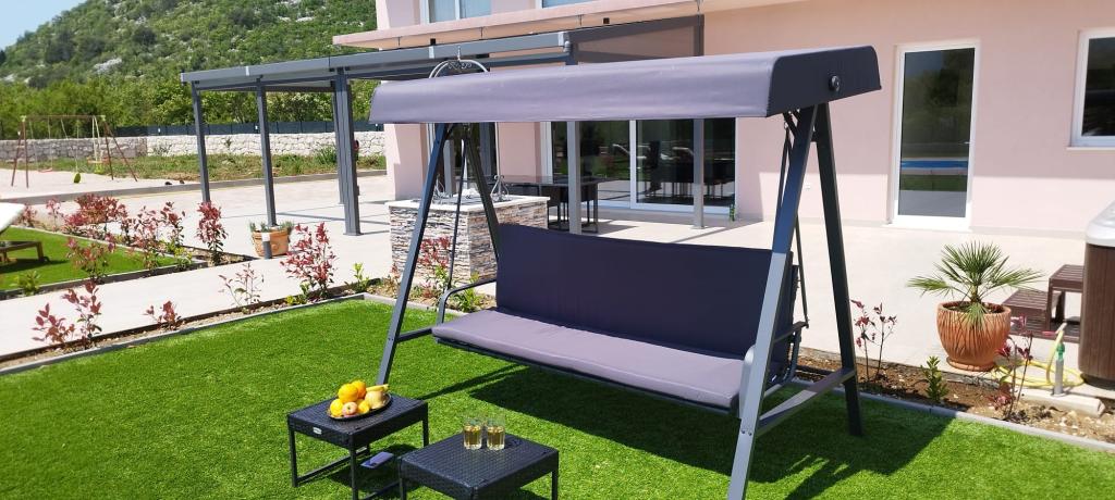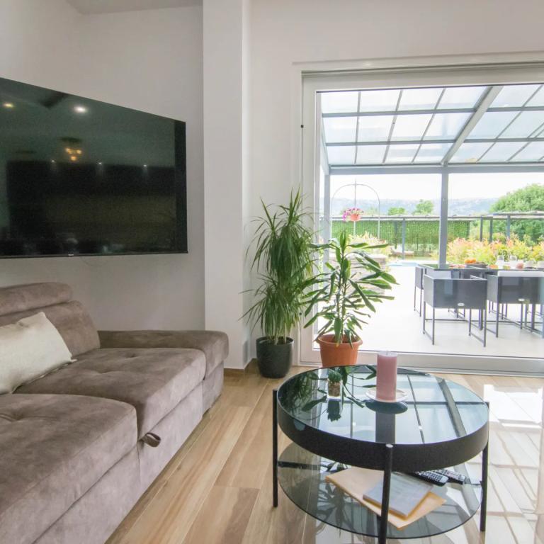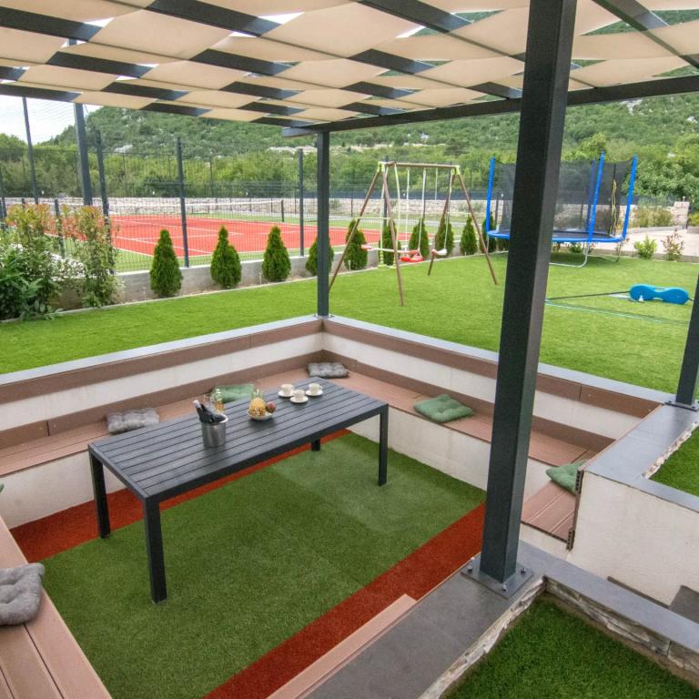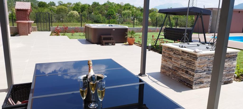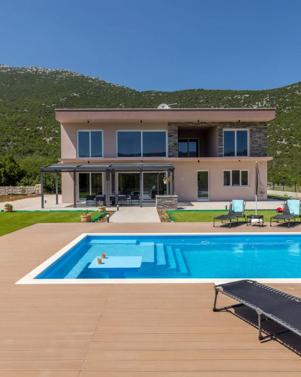 Villa Sky is located not far from Omiš in beautiful nature. It is surrounded by greenery, meadows and lawns. It is great for families and groups because you have your privacy, the first house is 4 km away. You are all alone in the house with your loved ones. The villa has a floor area of 240 m2, and the garden and yard is about 2800 m2. The entire area is fenced, because of children and pets. It has 3 rooms for two, 1 for three, 3 bathrooms and a toilet. Shared toilet with washing machine and dryer. A large living room that can accommodate a bed for 1 adult, a large kitchen with a dining room and a sled. For recreation, play tennis or small football, badminton... In front of the house is a 4 × 10 swimming pool, a whirlpool for 5 people, a large outdoor table and a barbecue. There is a lounge bar for pleasant socializing in the fresh air. Children have a playground. Parking lot covered with greenery. Feel free to contact me with any questions, I will be happy to help. If you prefer the sea, in 20 minutes you have a sandy and pebble beach in Omiš.