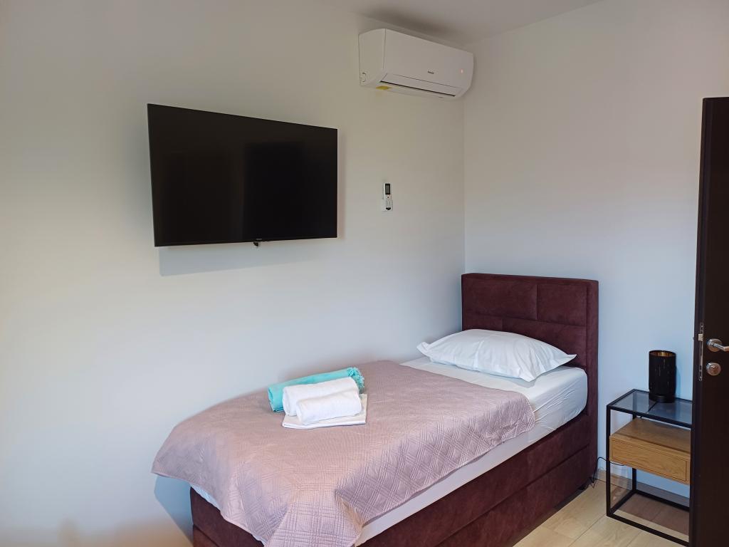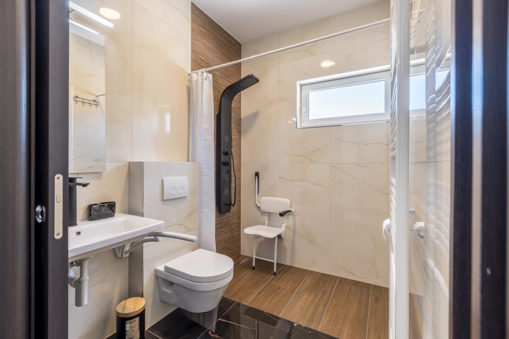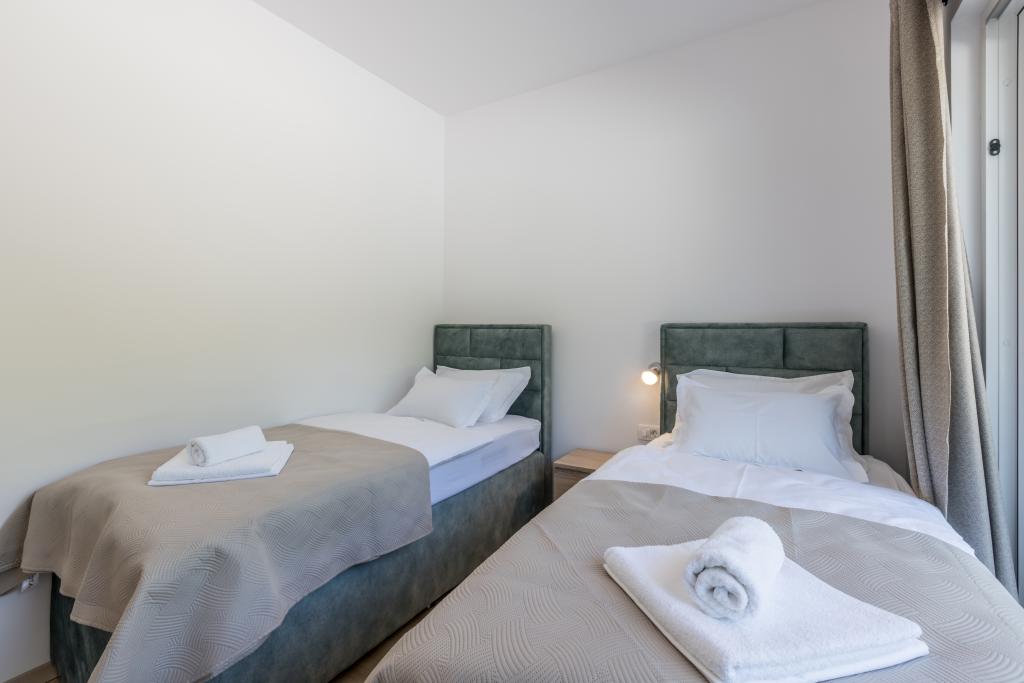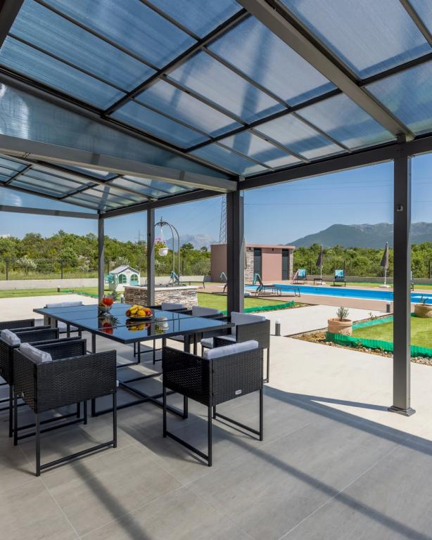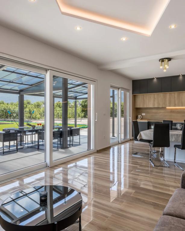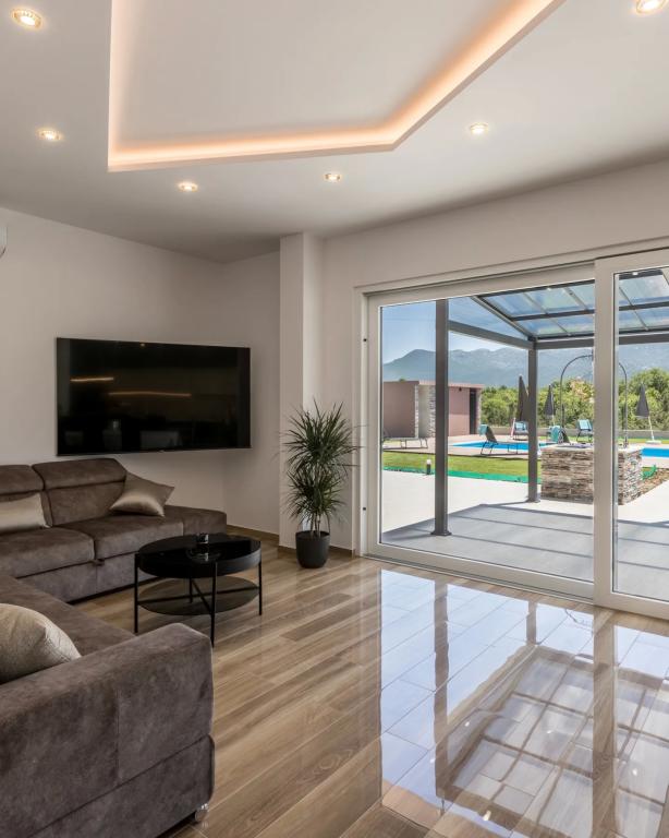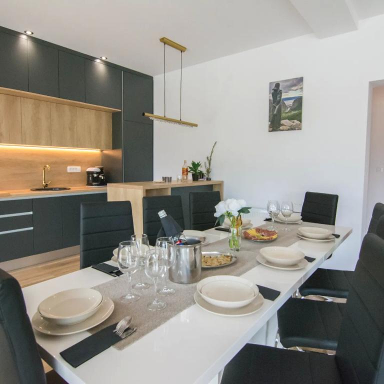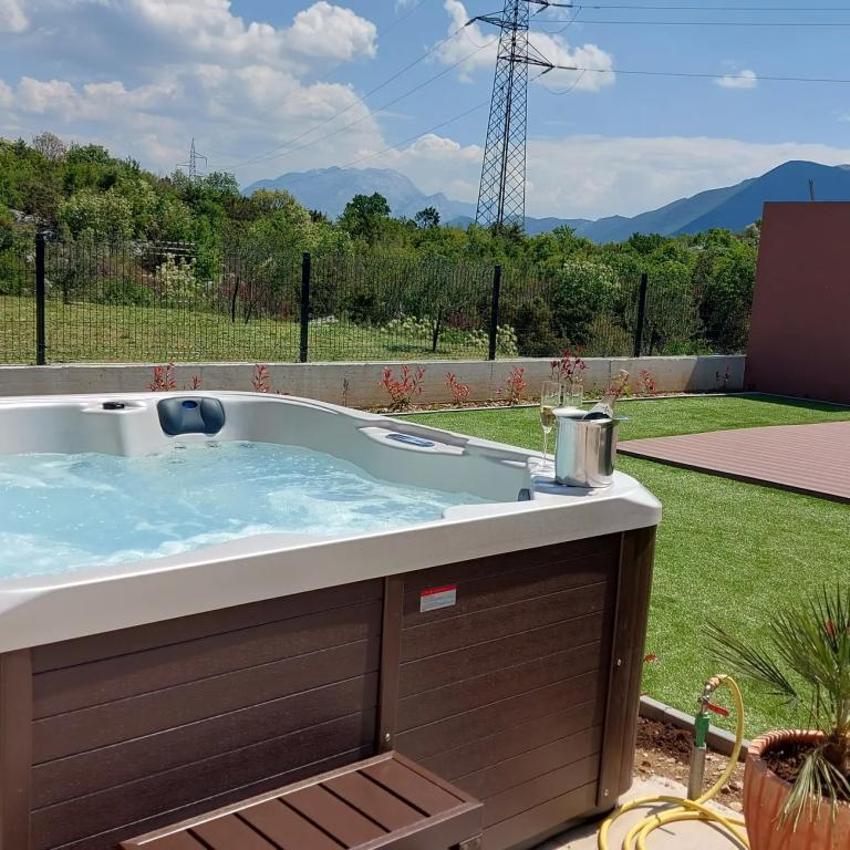Villa Sky is located not far from Omiš in beautiful nature. It is surrounded by greenery, meadows and lawns. It is great for families and groups because you have your privacy, the first house is 4 km away. You are all alone in the house with your loved ones. The villa has a floor area of 240 m2, and the garden and yard is about 2800 m2. The entire area is fenced, because of children and pets. It has 3 rooms for two, 1 for three, 3 bathrooms and a toilet. Shared toilet with washing machine and dryer. A large living room that can accommodate a bed for 1 adult, a large kitchen with a dining room and a sled. For recreation, play tennis or small football, badminton... In front of the house is a 4 × 10 swimming pool, a whirlpool for 5 people, a large outdoor table and a barbecue. There is a lounge bar for pleasant socializing in the fresh air. Children have a playground. Parking lot covered with greenery. Feel free to contact me with any questions, I will be happy to help. If you prefer the sea, in 20 minutes you have a sandy and pebble beach in Omiš.