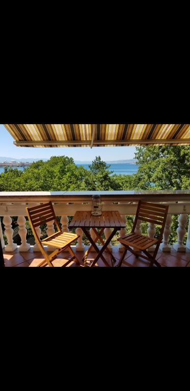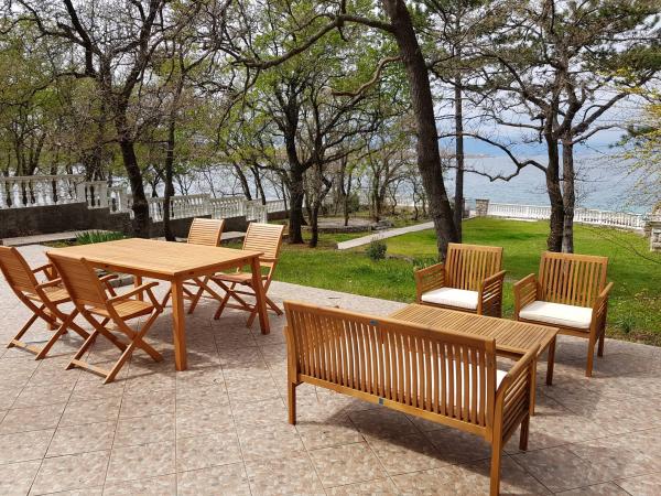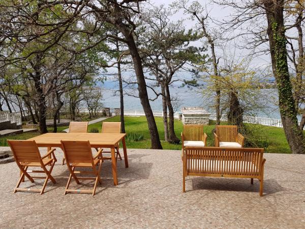 Villa with two fully equipped apartments, located on the sea. Guests have access to a shared spacious terrace with table and seating set, surrounded by greenery.