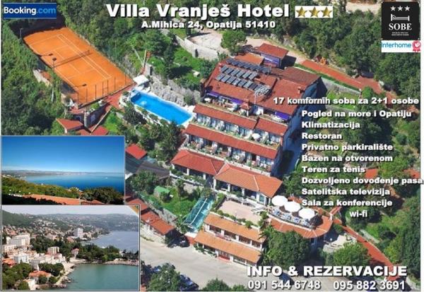 Villa Vranjes sits in a quiet part of town, overlooking the blue waters of the Bay of Kvarner 700metara away from the sea and 1km from the center of Opatija. Designed for both; business and leisure \ Hotel Villa Vranjes \ is ideally situated in Opatija and one of the most famous places in the city. From here, guests can enjoy easy access to all that the lively city has to offer. It has 10 rooms (double extra bed-sofa), outdoor swimming pool 185 m, tennis court and wi fi throughout the property. Villa Vranjes is an excellent venue for festive occasions, business lunches, presentations, seminars, family reunions. Parking lot can accommodate buses. Rooms are equipped with bathroom, TV, refrigerator, air conditioning, fan, and a balcony overlooking the sea, and are wide enough to set up extra beds for children and adults.
