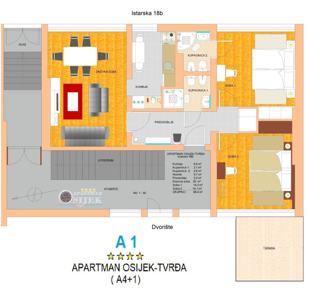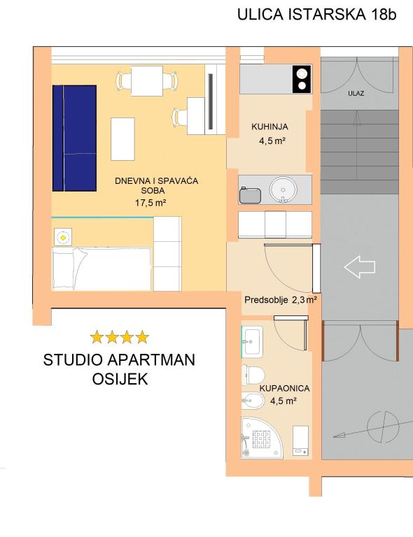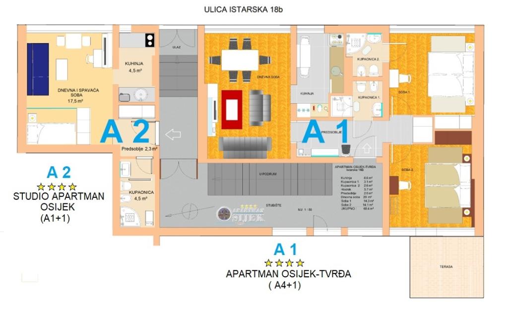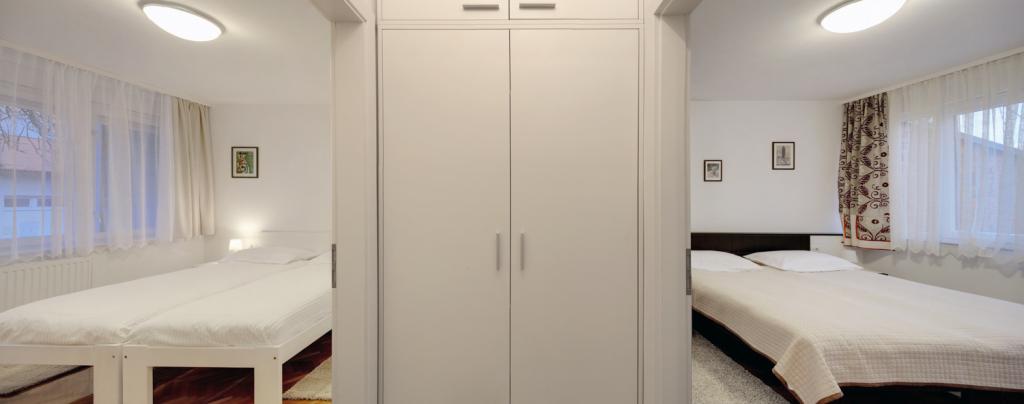 Apartment Tvrđa and Studio apartment Osijek are located on the high ground floor of the building in Istarska street, near the Eurodom, where parking spaces are provided. The apartments are close to the main streets and roads that connect Osijek with the surrounding towns and the A5 highway. In the immediate vicinity of the apartment there are the football stadium and sports hall "City Garden", "City Pools", restaurants and the historical center of Osijek - the Baroque Fortress. Apartment Tvrđa is a three-room apartment with an area of 68 m². You have at your disposal two double bedrooms and a living room with a sofa bed, two bathrooms, a kitchen and a terrace. The Osijek studio apartment is 30 m² in size. It consists of an entrance hall, living room, bedroom, kitchen and bathroom. The bedroom, in which there is a bed, is separated from the living room by a sliding door covered with mirrors. There is a sofa bed in the living room. One parking space is provided in the underground garage of the Eurodom, in the immediate vicinity of the building.