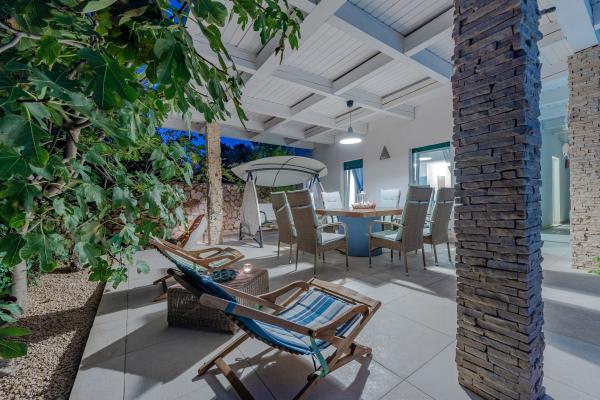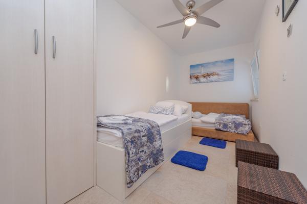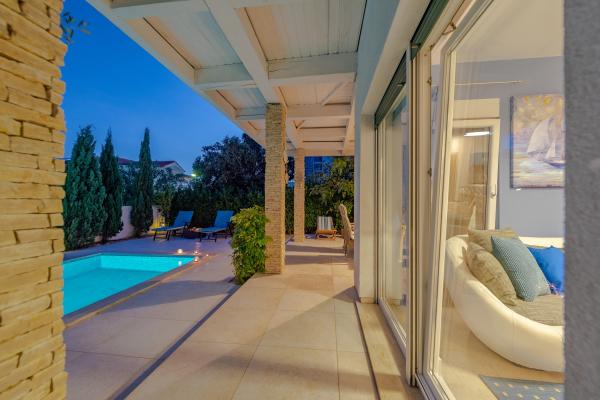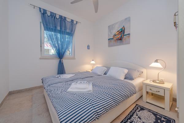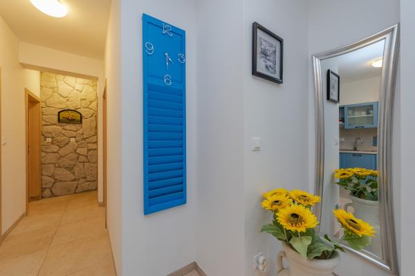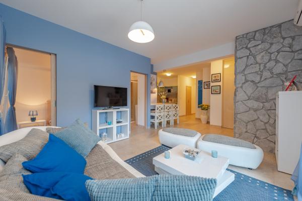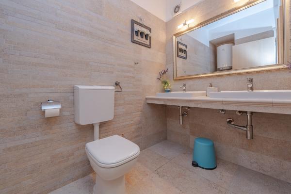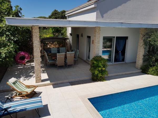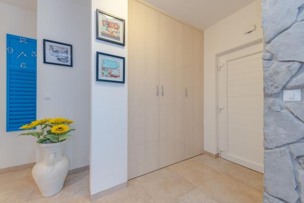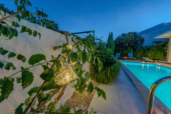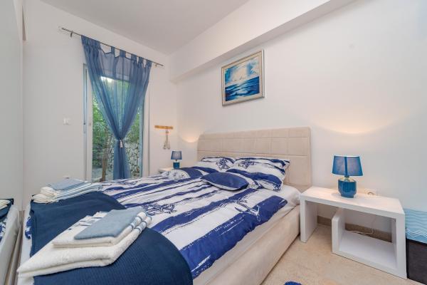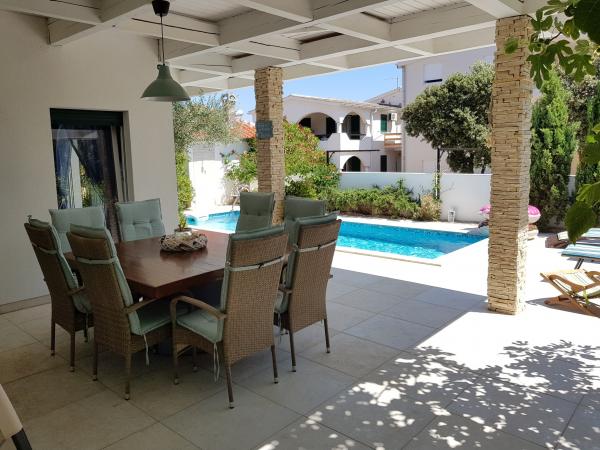 The apartment is located in a newer building, it is fully and modernly equipped, newly furnished for a pleasant and relaxing stay, away from the sea about 250 m. It is located on the ground floor of the building. It has a separate entrance, a garden that is divided into the sunbathing area surrounding the pool, and a garden and a covered terrace where day and evening gatherings take place. There is a large table on the terrace and next to a swinging deck for rest. The 26 sqm pool area can be used only by guests of this apartment. In the garden are planted figs in which the fruits can be enjoyed by the guests, and decorated horticulture (laurel cherry, cypress, rosemary, lavender and oleander). Guests have privacy and peace. Interior layout - living room and three bedrooms, 2 shower stalls, 1 toilet, pantry. The total usable area of the apartment is 112 m2, of which 70 m2 is enclosed. Also, the apartment also has two parking spaces. Within a few minutes walk from the apartment there is a shop, pharmacy, fish market, hairdresser, domestic fruit and vegetable producers ...
